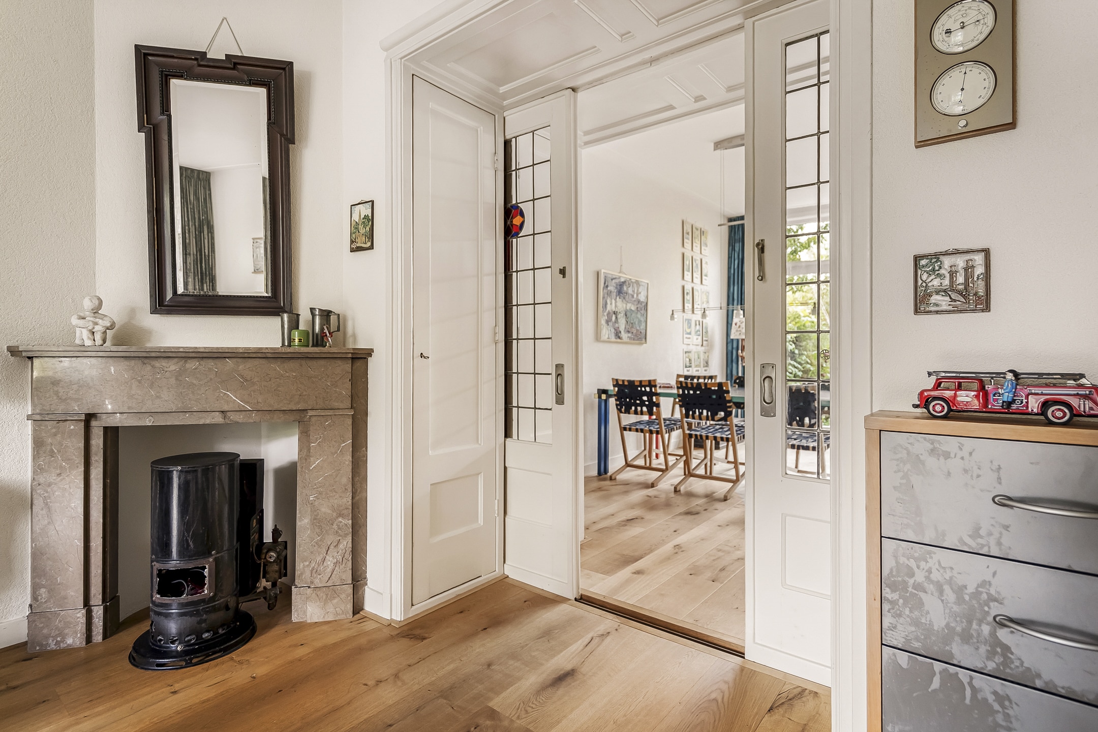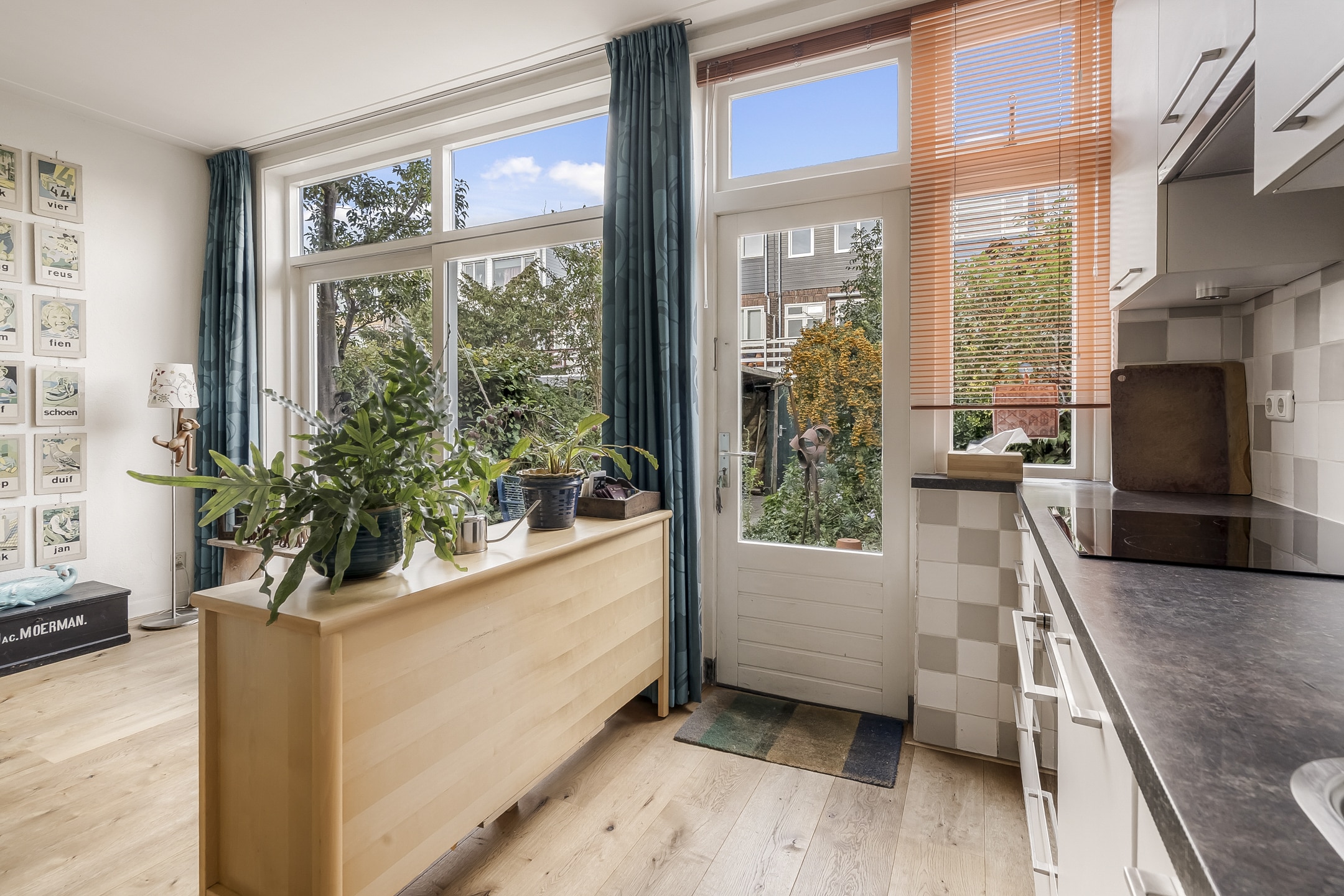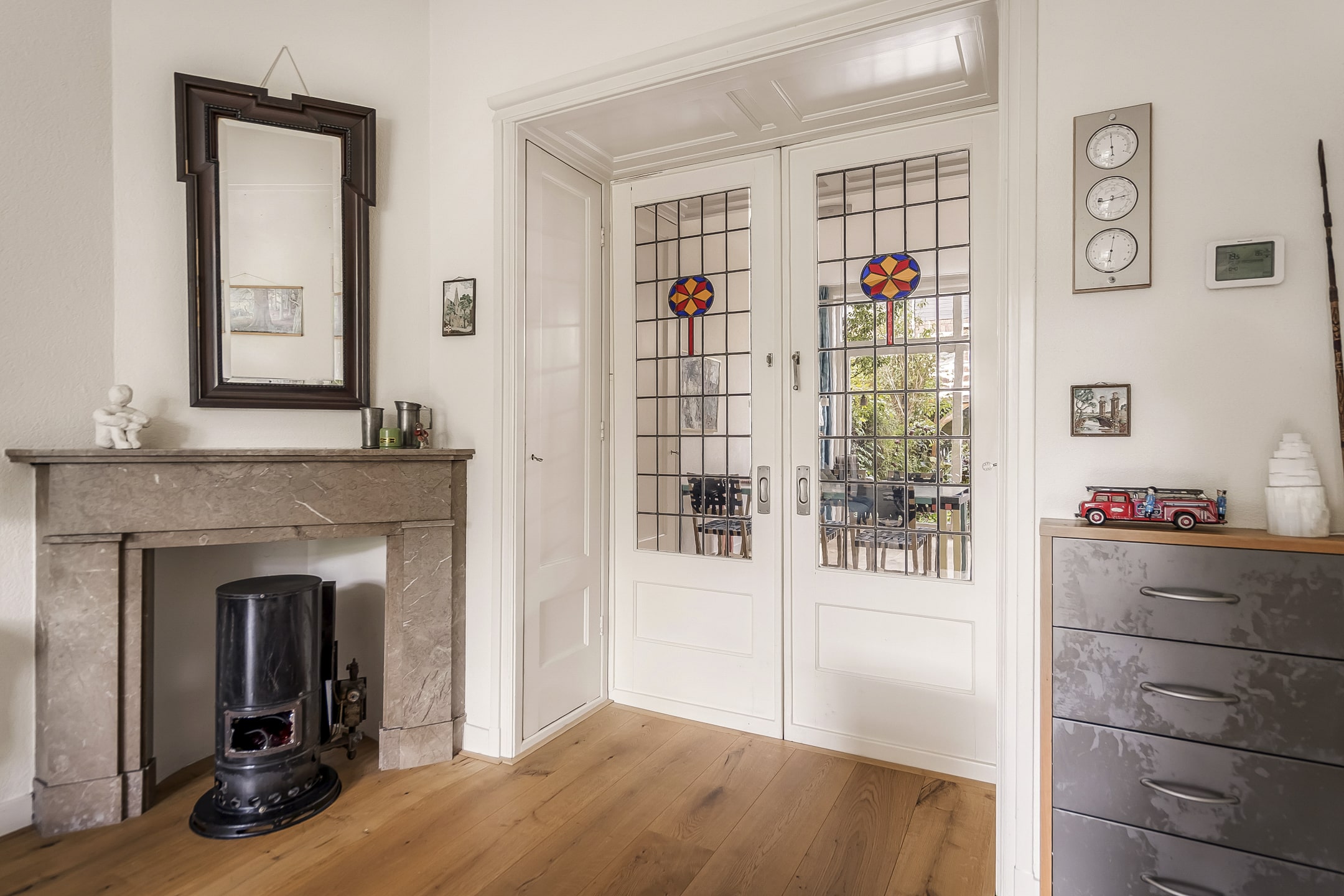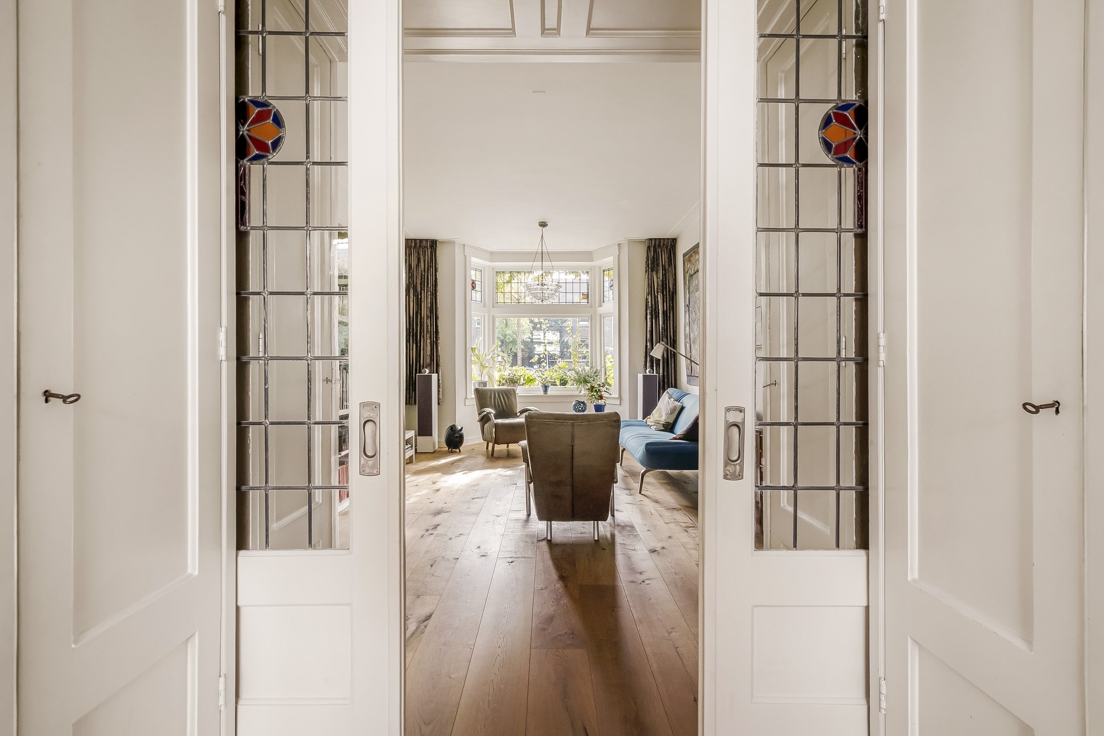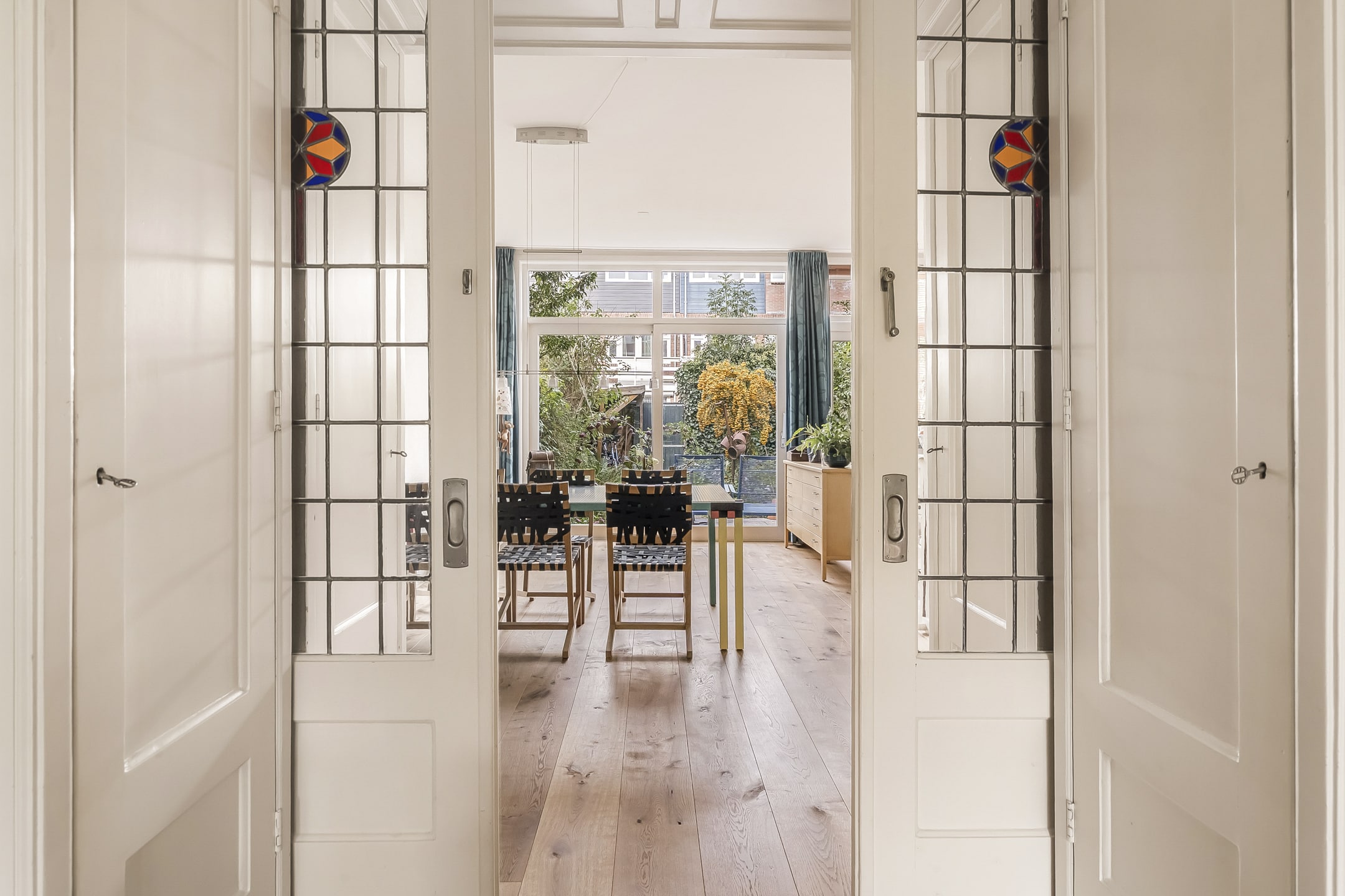 Entree via vestibule met granito vloer, bovenlicht en portaaldeur met glas-in-lood. Gang met trapkast en stijlvol toilet. De woonkamer-en-suite is een blikvanger: originele schuifdeuren, vier en-suite kasten, marmeren schouwen en paneeldeuren. De erker is volledig vernieuwd en teruggebracht in originele staat. De eikenhouten ‘Kloosterdelen’ vloer met vloerverwarming combineert stijl met comfort. Aan de achterzijde bevindt zich de eetkamer met moderne open keuken, voorzien van nieuwe inbouwapparatuur zoals een Miele vaatwasser en een Bosch inductiekookplaat. De groene achtertuin op het westen is een fijne plek om te ontspannen, met een praktische fietsenschuur en een gemeenschappelijke achterom.