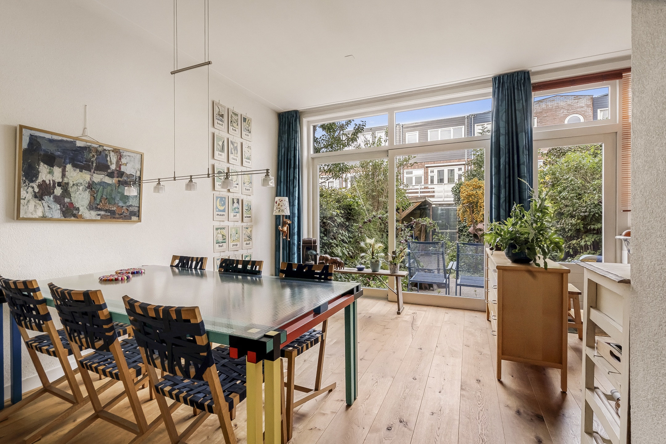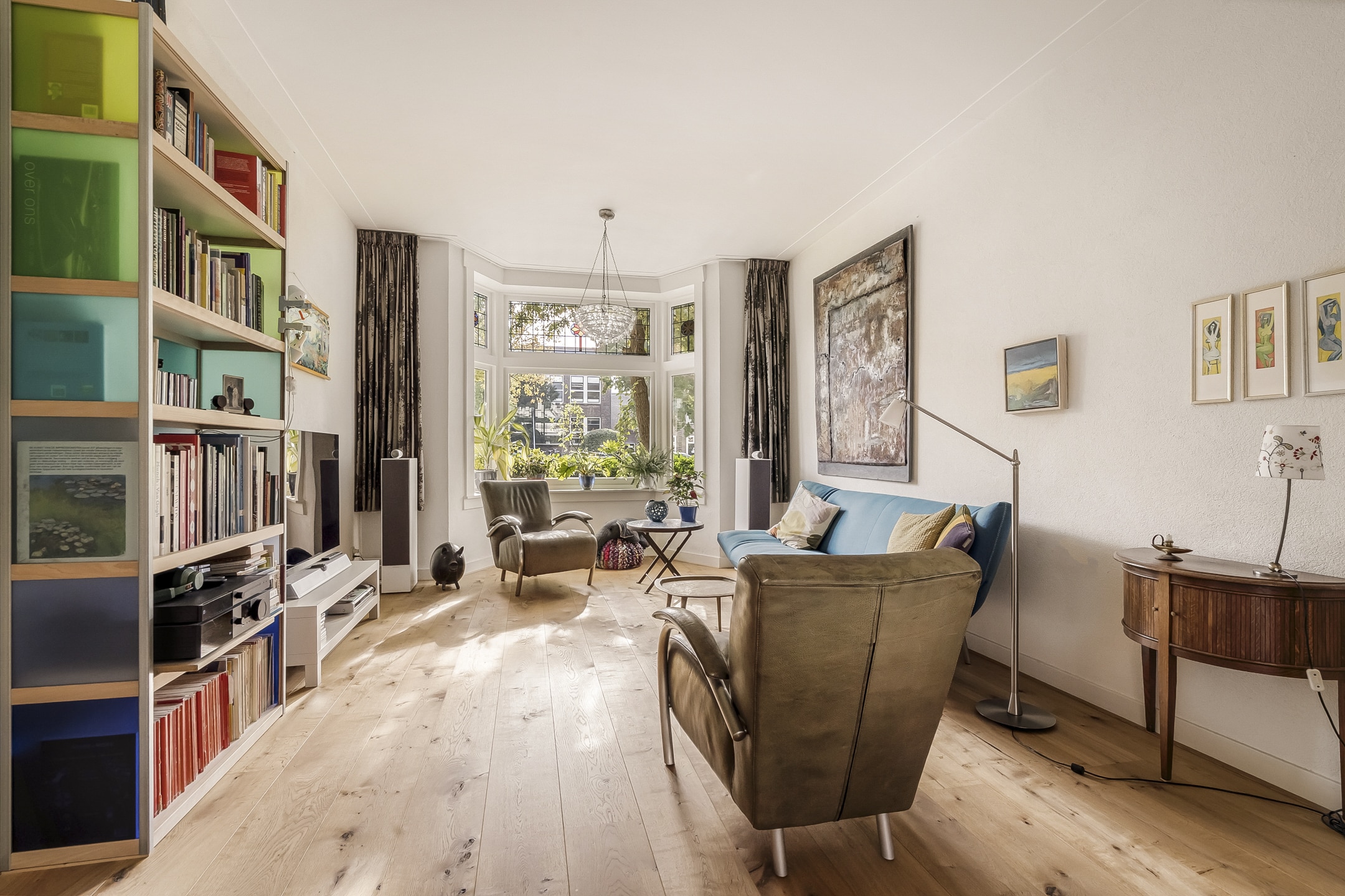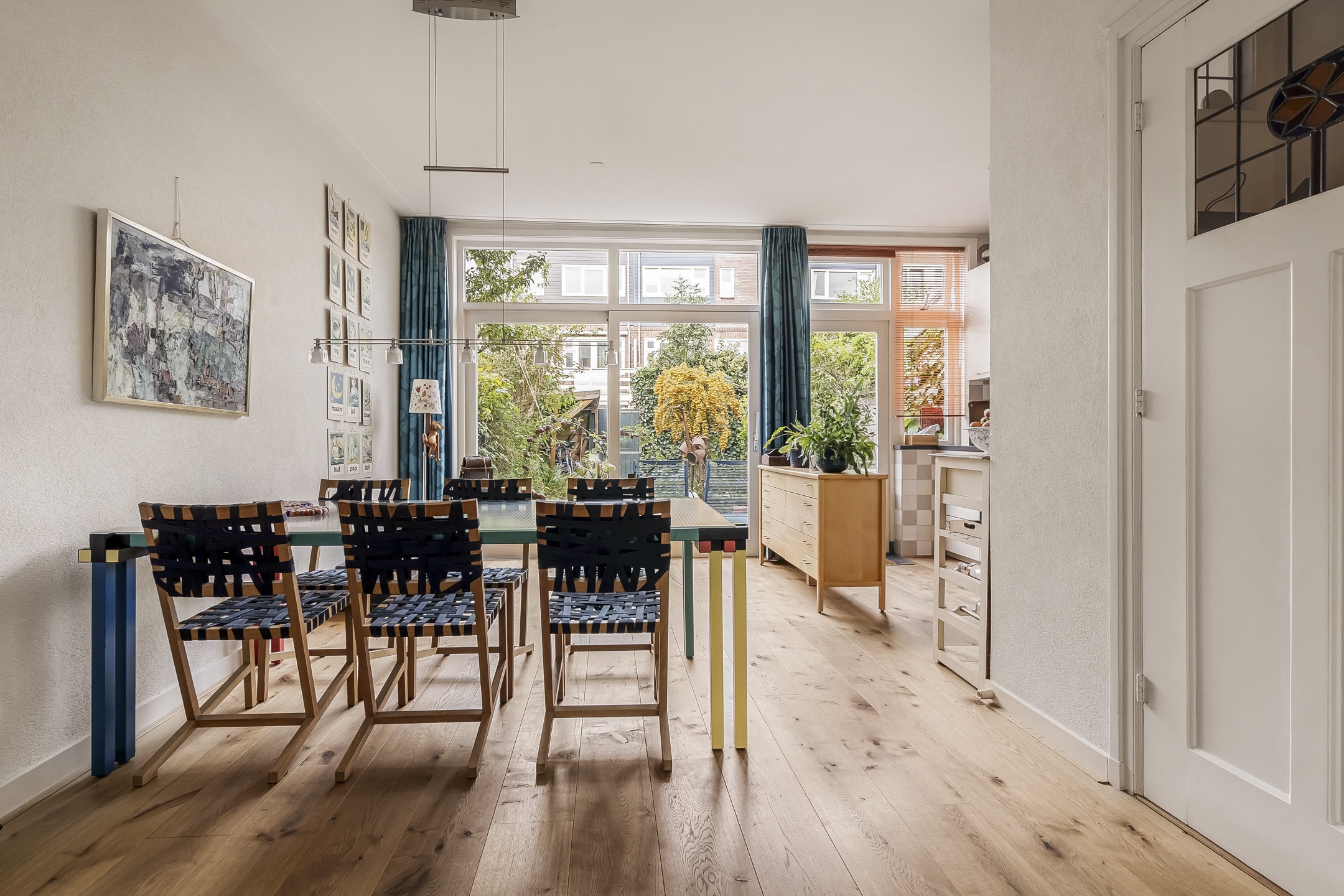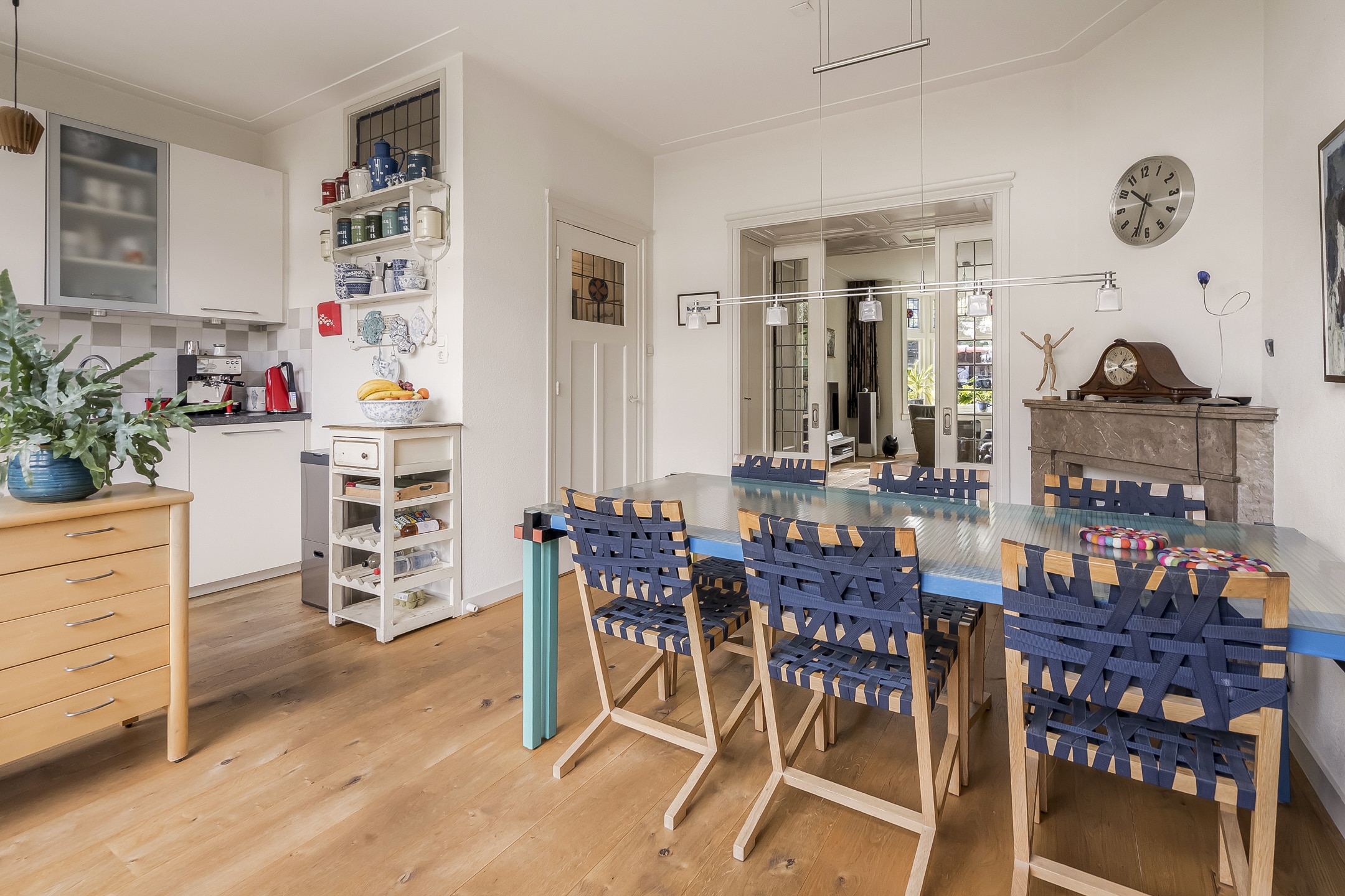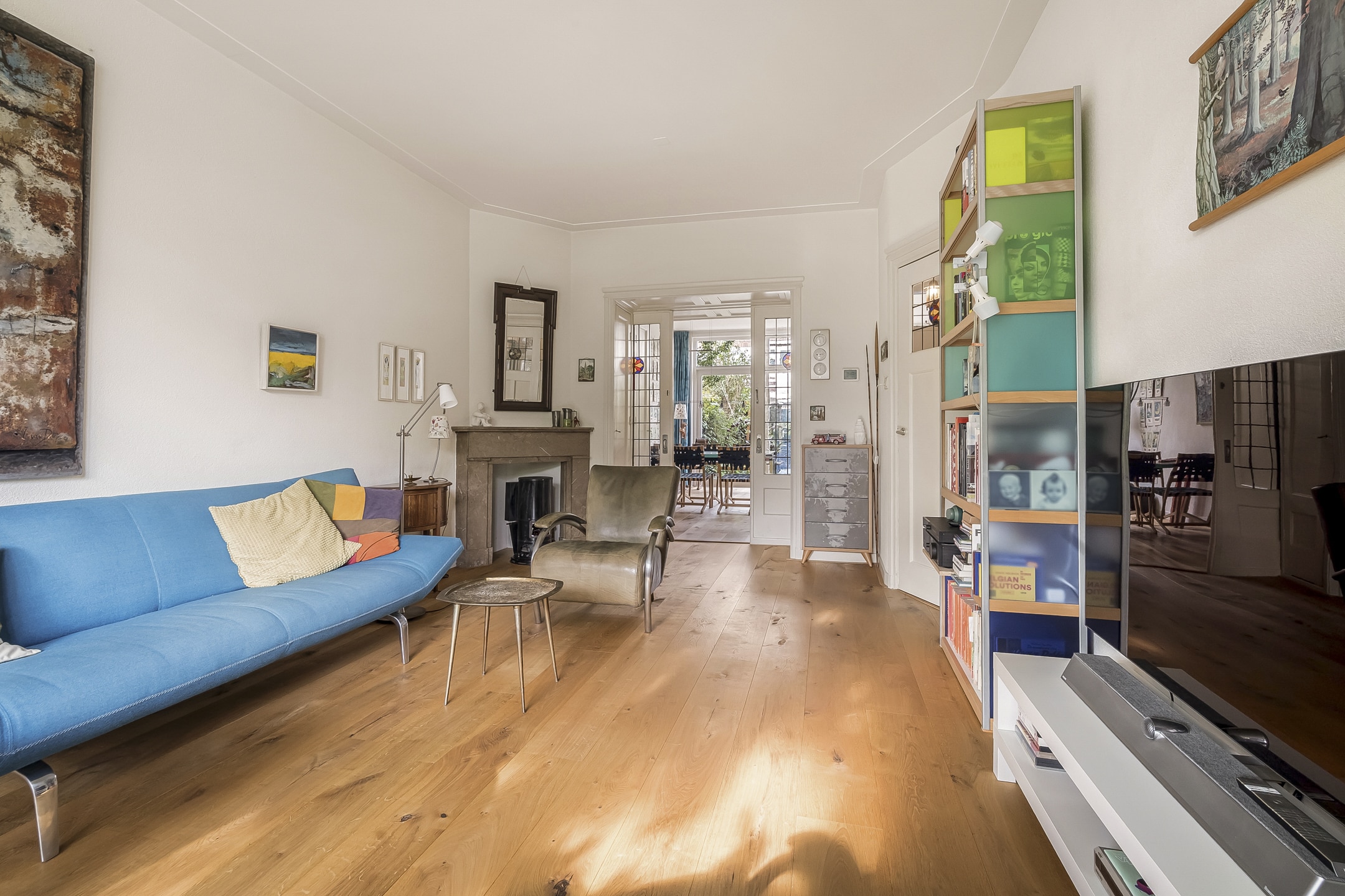 Entree via vestibule met granito vloer, bovenlicht en portaaldeur met glas-in-lood. Gang met trapkast en stijlvol toilet. De woonkamer-en-suite is een blikvanger: originele schuifdeuren, vier en-suite kasten, marmeren schouwen en paneeldeuren. De erker is volledig vernieuwd en teruggebracht in originele staat. De eikenhouten ‘Kloosterdelen’ vloer met vloerverwarming combineert stijl met comfort. Aan de achterzijde bevindt zich de eetkamer met moderne open keuken, voorzien van nieuwe inbouwapparatuur zoals een Miele vaatwasser en een Bosch inductiekookplaat. De groene achtertuin op het westen is een fijne plek om te ontspannen, met een praktische fietsenschuur en een gemeenschappelijke achterom.
