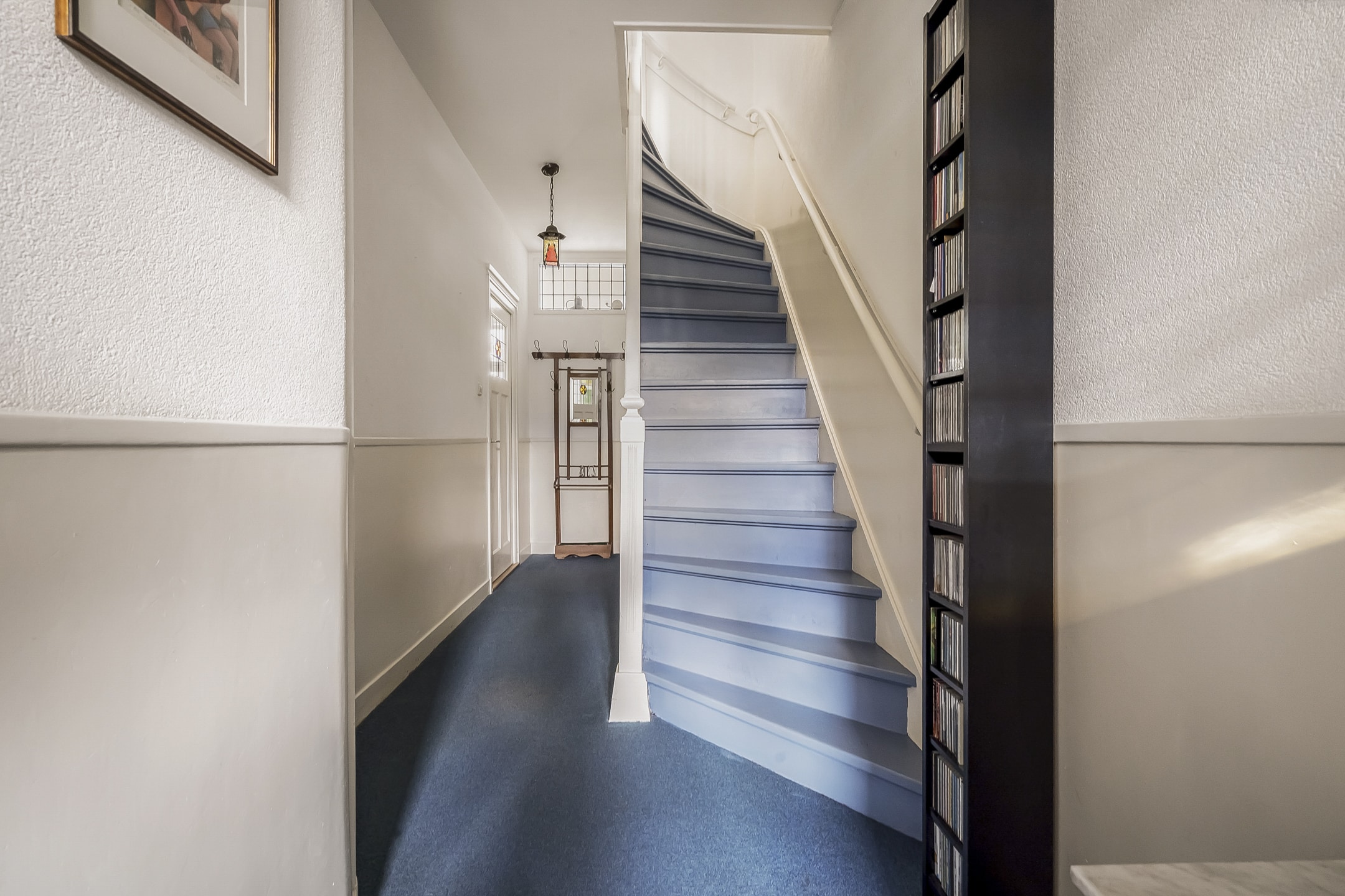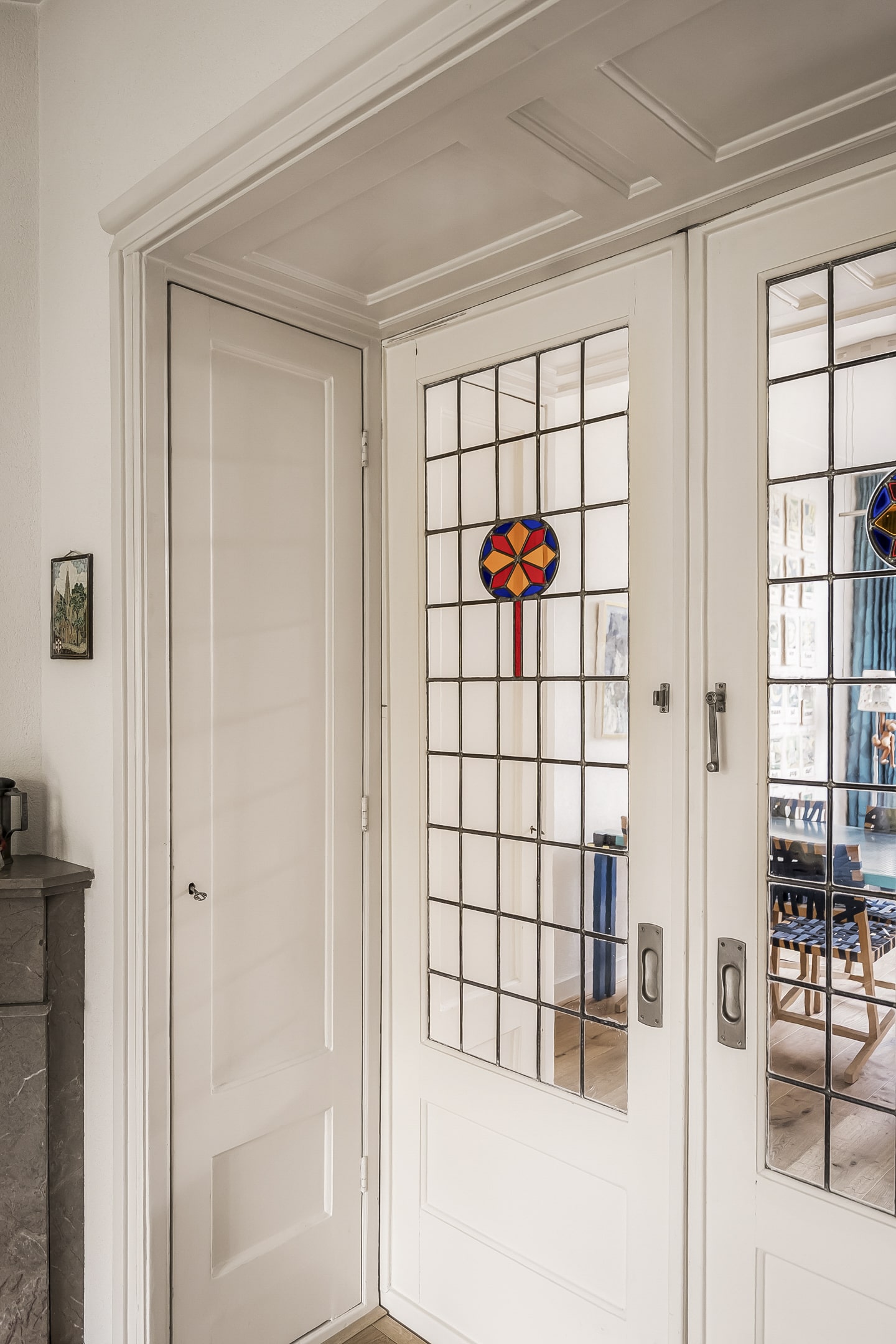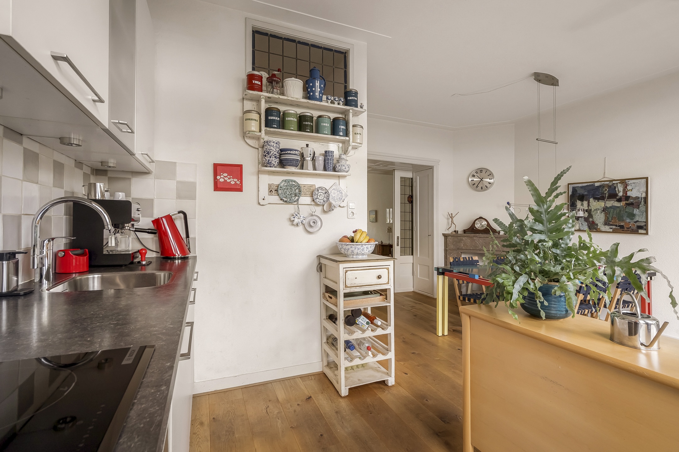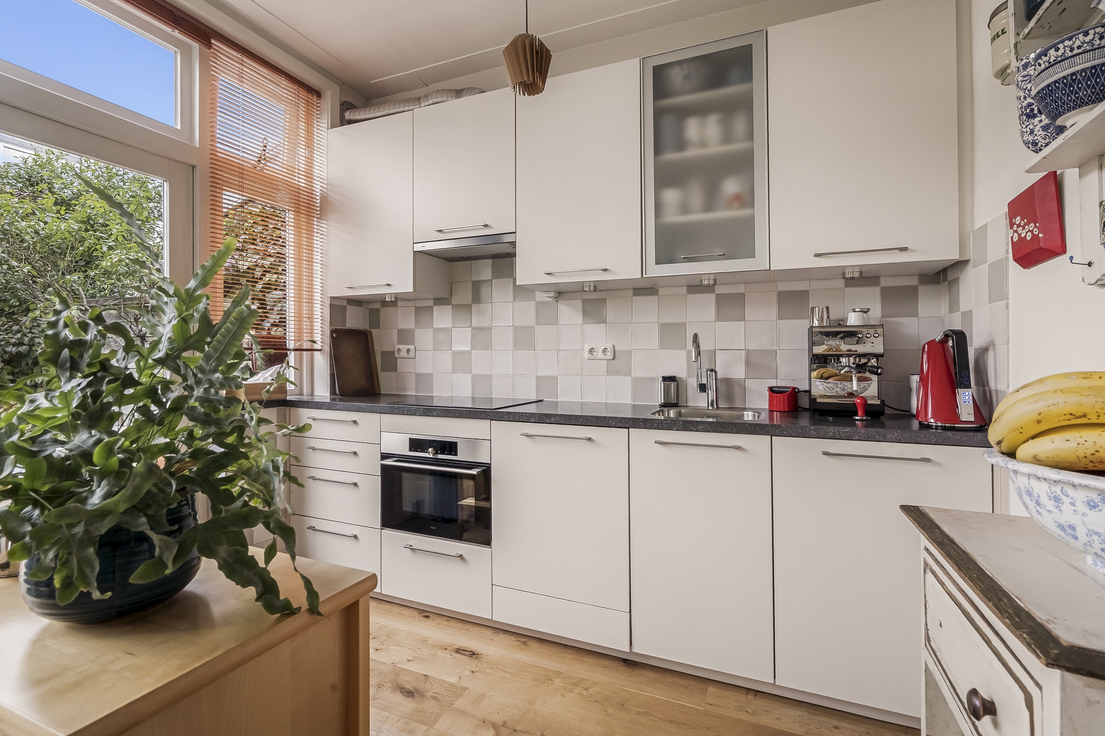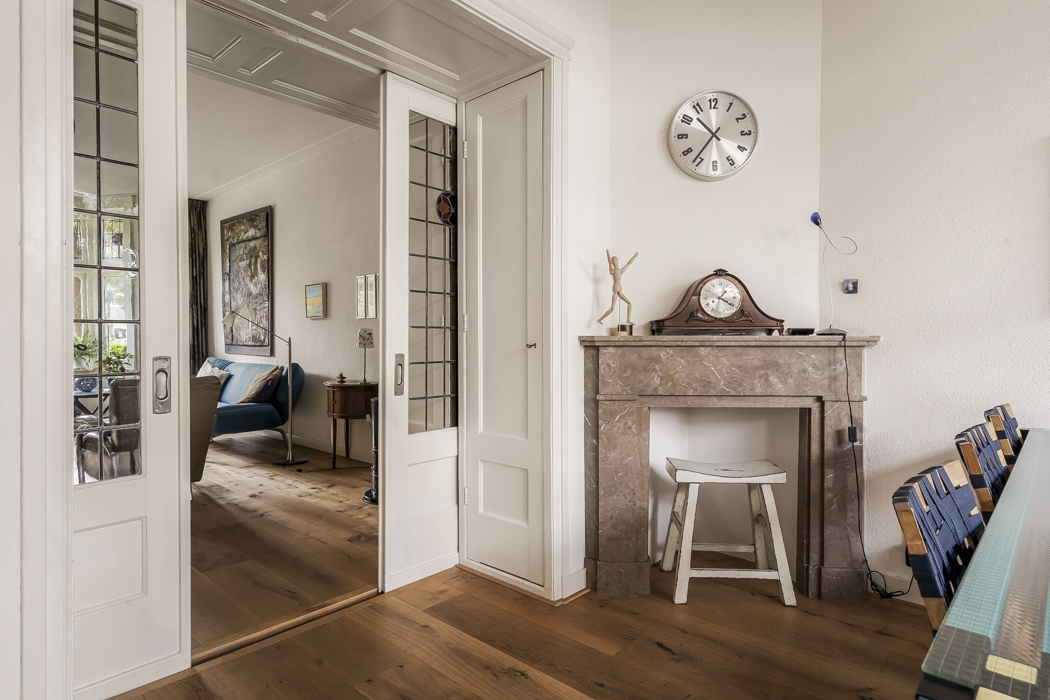 Entree via vestibule met granito vloer, bovenlicht en portaaldeur met glas-in-lood. Gang met trapkast en stijlvol toilet. De woonkamer-en-suite is een blikvanger: originele schuifdeuren, vier en-suite kasten, marmeren schouwen en paneeldeuren. De erker is volledig vernieuwd en teruggebracht in originele staat. De eikenhouten ‘Kloosterdelen’ vloer met vloerverwarming combineert stijl met comfort. Aan de achterzijde bevindt zich de eetkamer met moderne open keuken, voorzien van nieuwe inbouwapparatuur zoals een Miele vaatwasser en een Bosch inductiekookplaat. De groene achtertuin op het westen is een fijne plek om te ontspannen, met een praktische fietsenschuur en een gemeenschappelijke achterom.