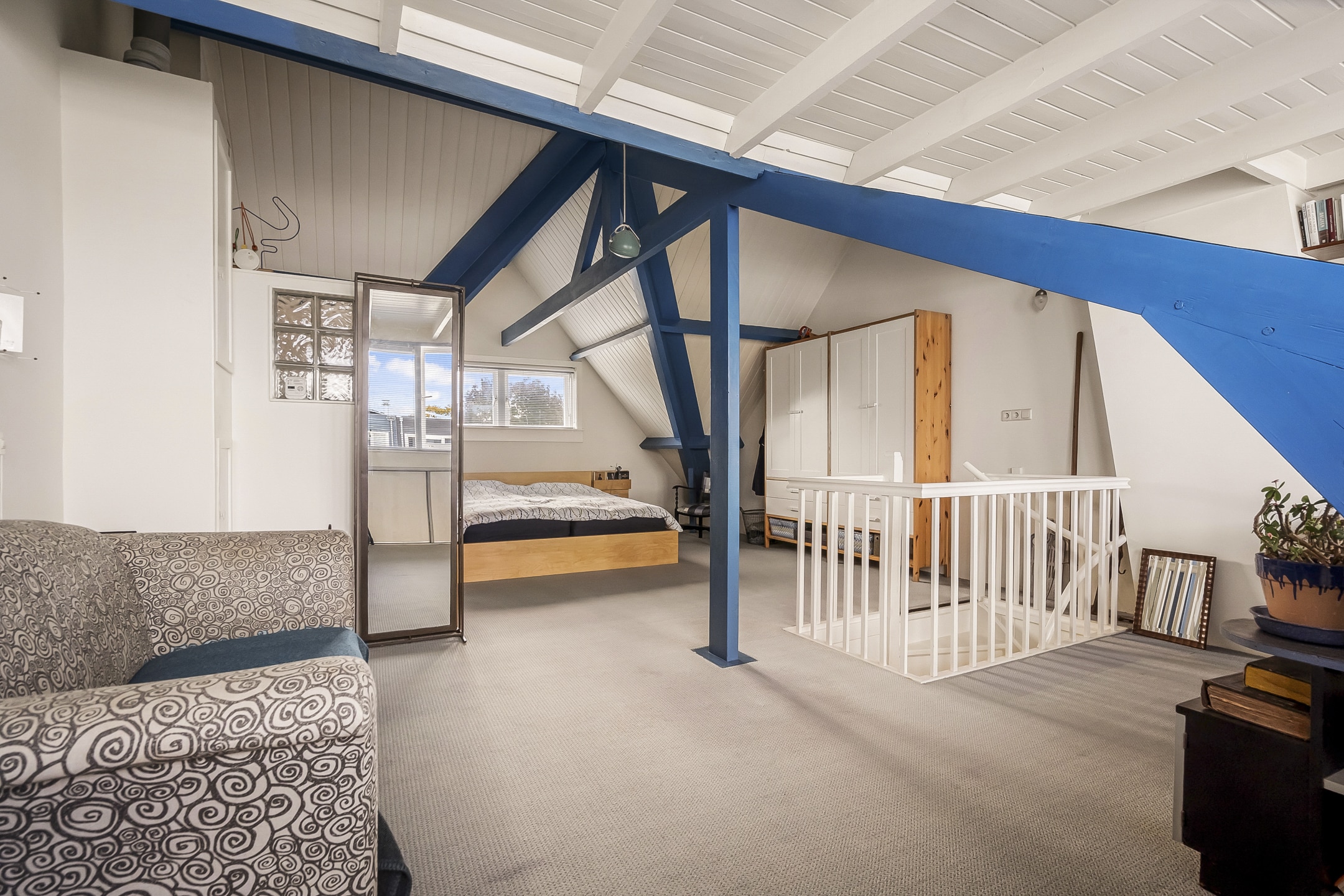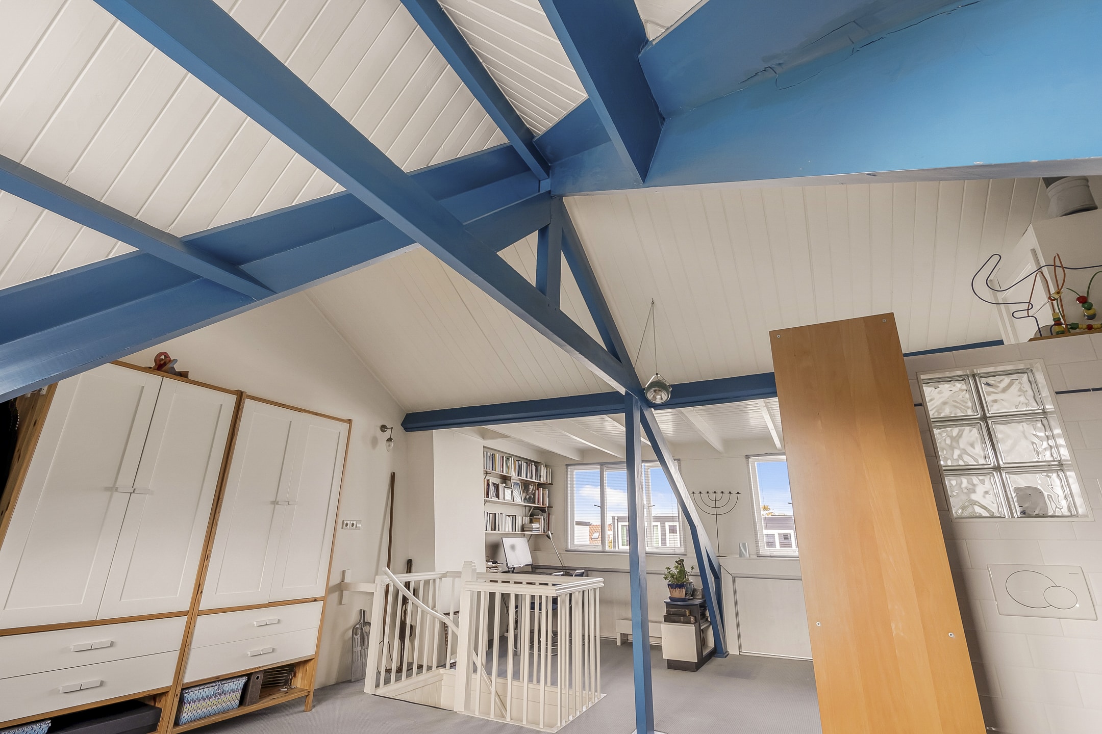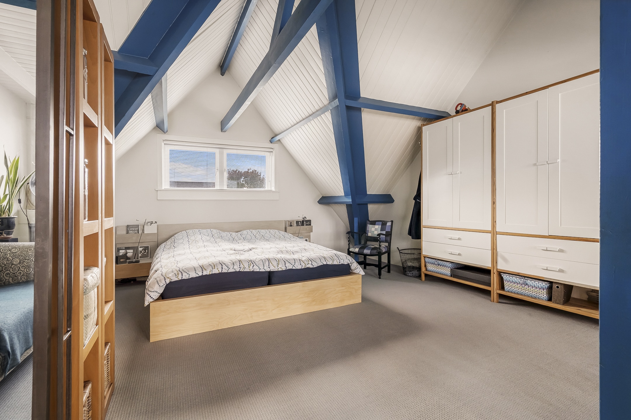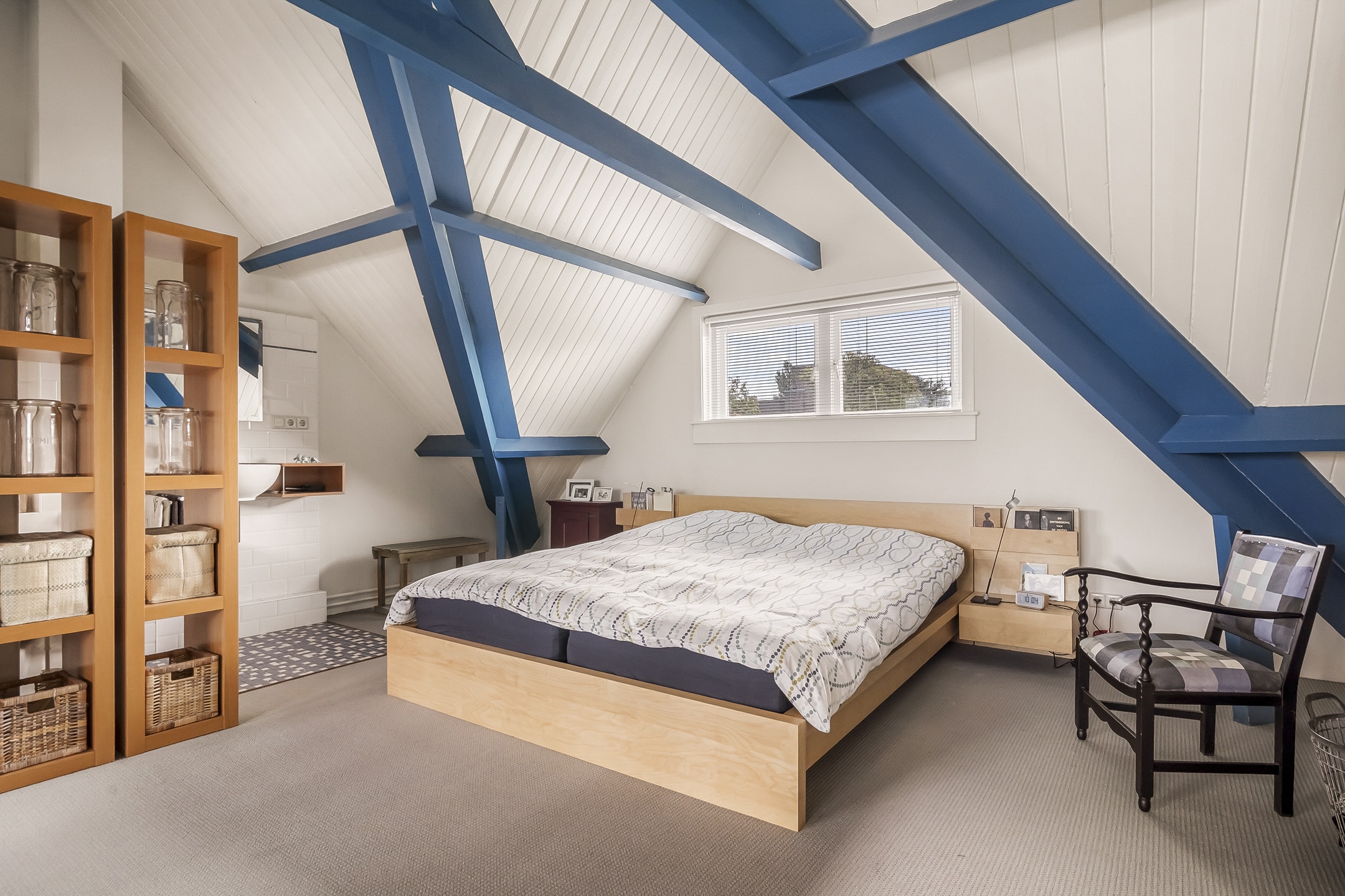Een ware verrassing: een hoge, open zolderruimte (tot 3,20 meter) met zichtbare kapconstructie, origineel dakbeschot en royale dakkapel met berging onder het dak. Nu ingericht als royale (ouder)slaapkamer met wastafel en toilet. Deze verdieping biedt volop mogelijkheden – ideaal als extra slaapkamers, werkplek of hobbyruimte.