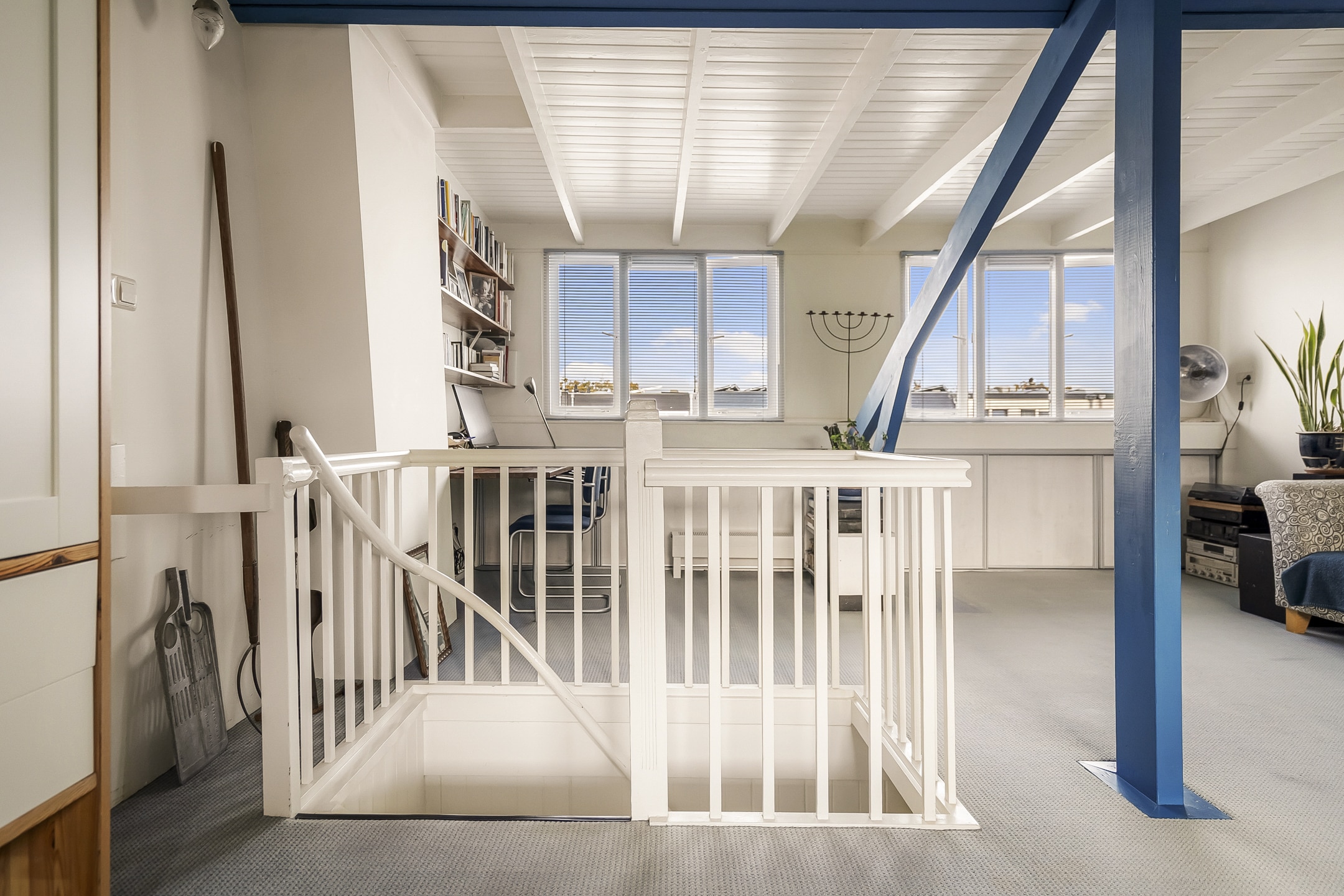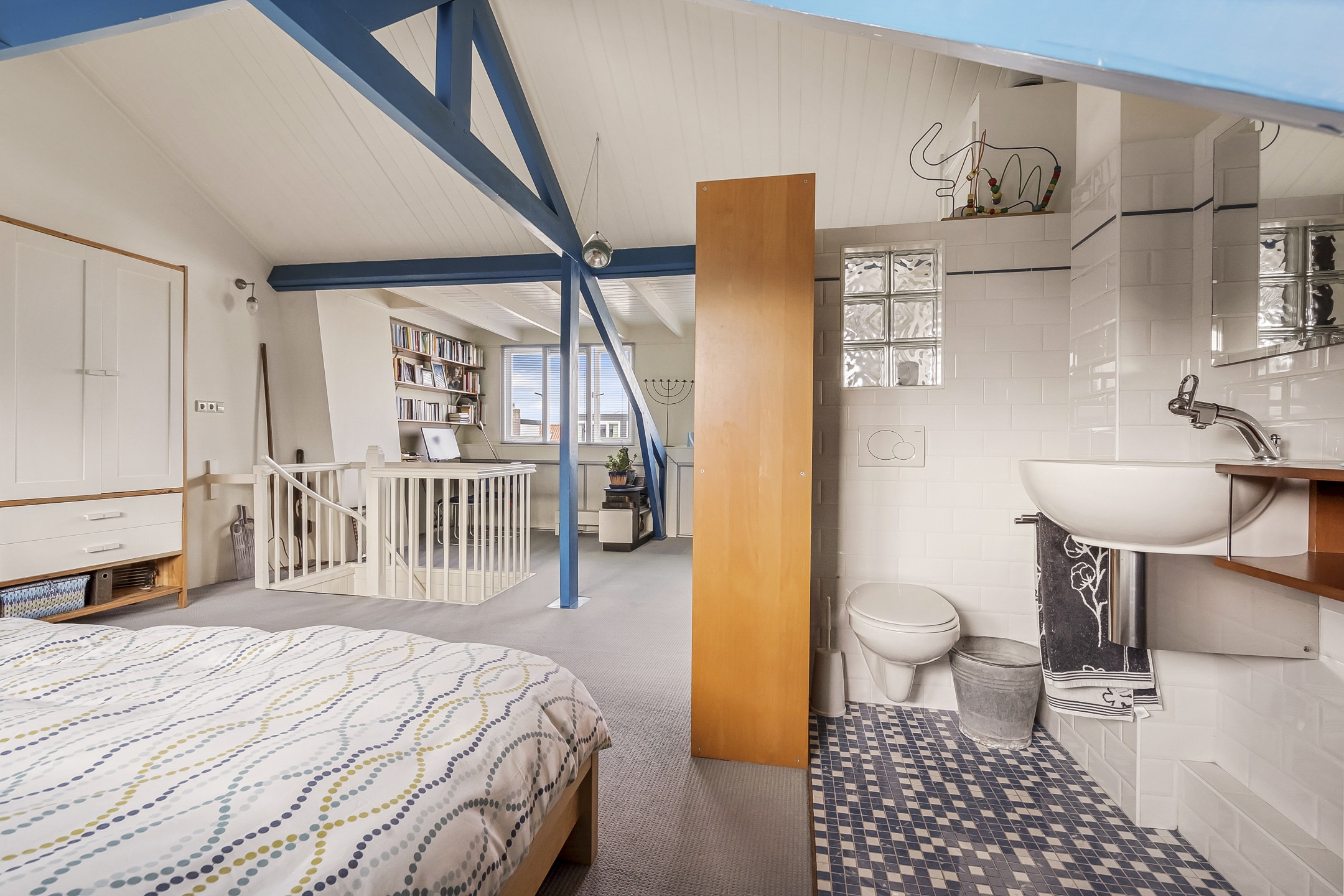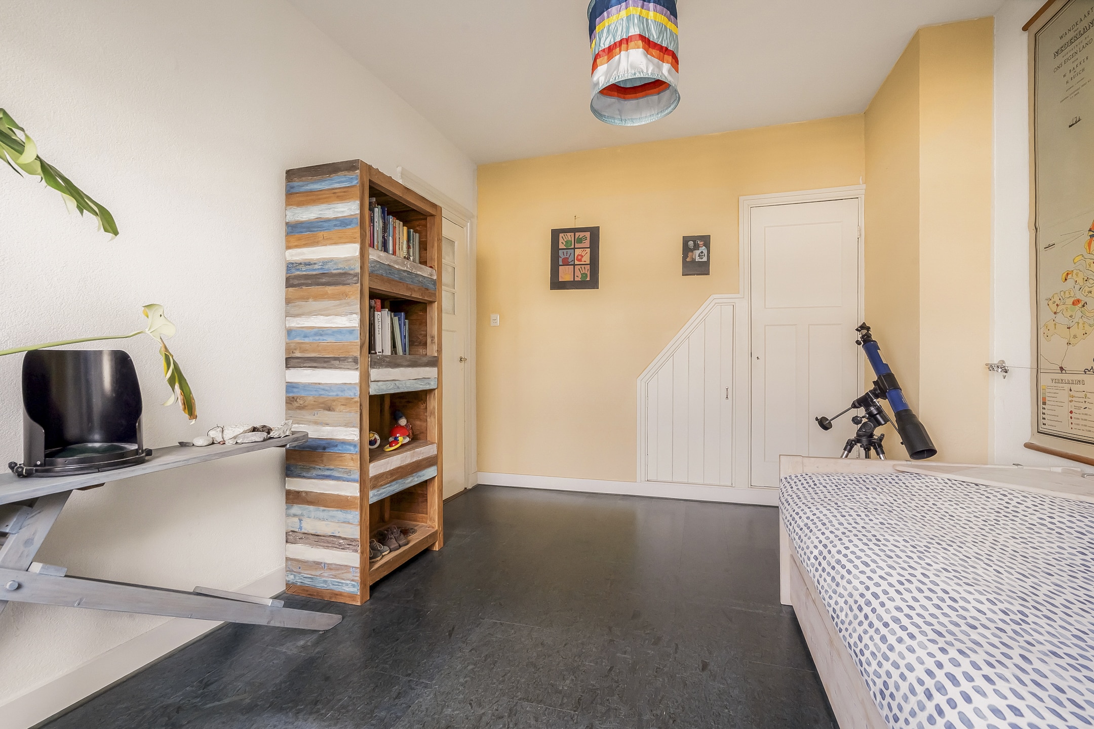 Een ware verrassing: een hoge, open zolderruimte (tot 3,20 meter) met zichtbare kapconstructie, origineel dakbeschot en royale dakkapel met berging onder het dak. Nu ingericht als royale (ouder)slaapkamer met wastafel en toilet. Deze verdieping biedt volop mogelijkheden – ideaal als extra slaapkamers, werkplek of hobbyruimte.