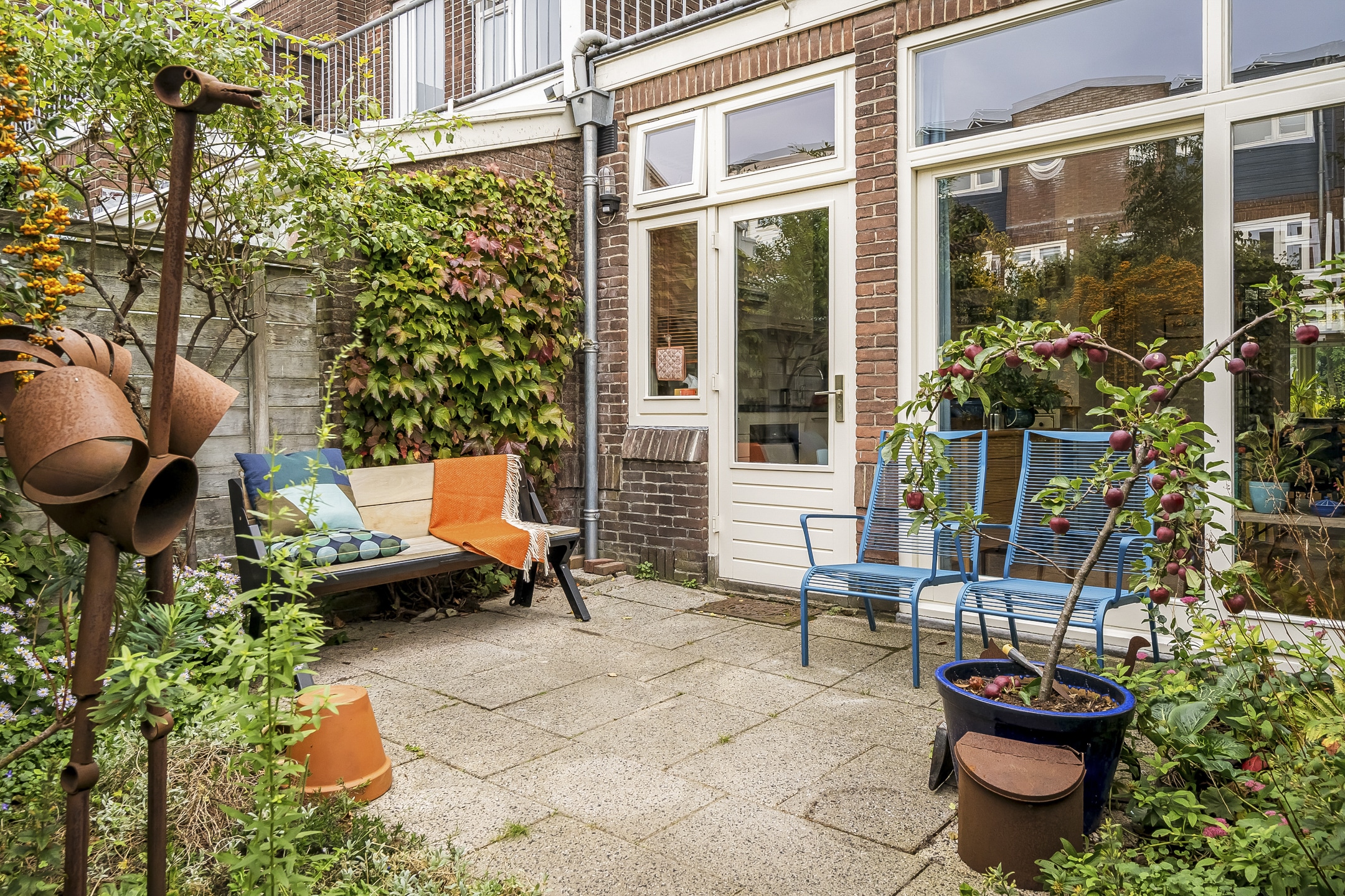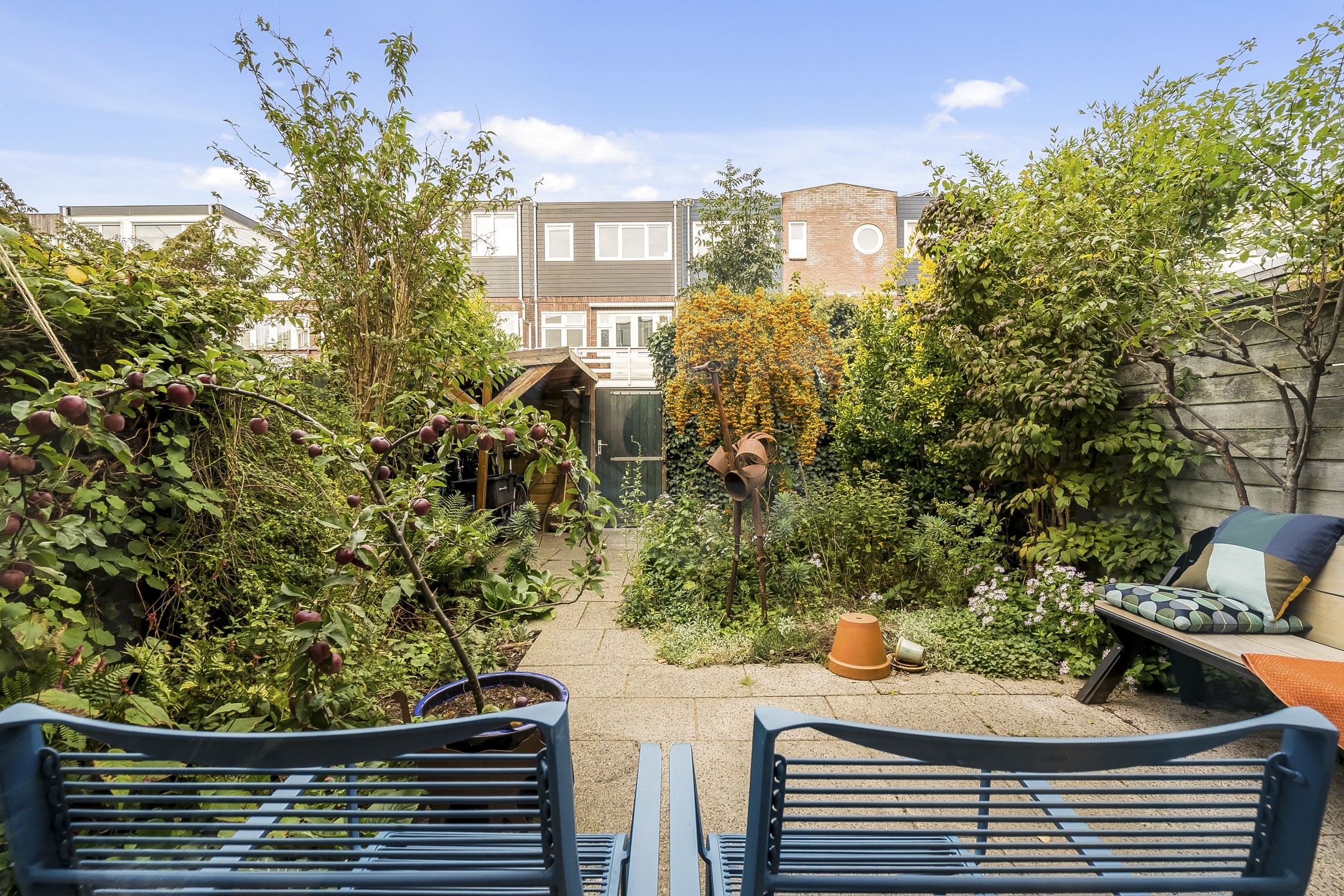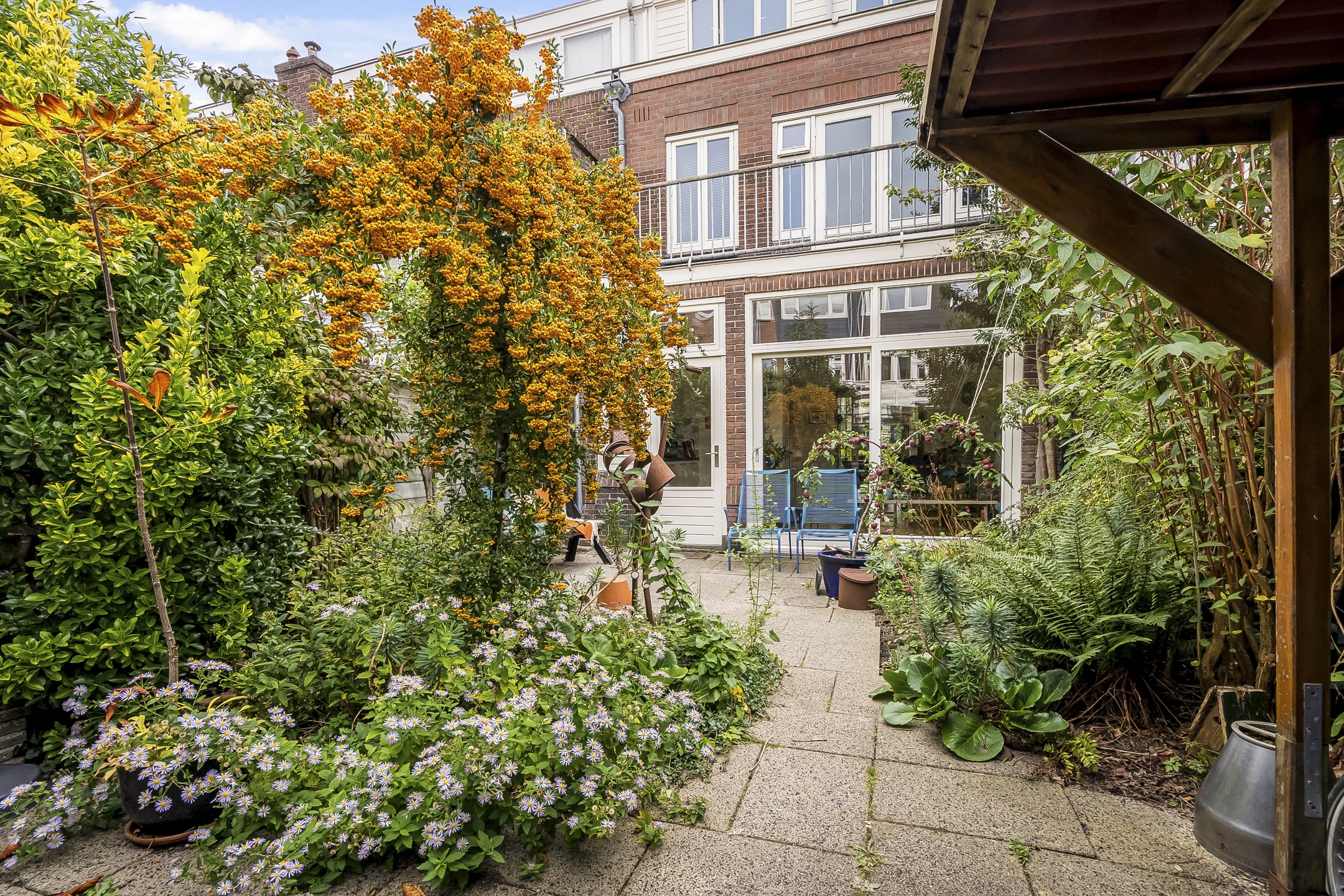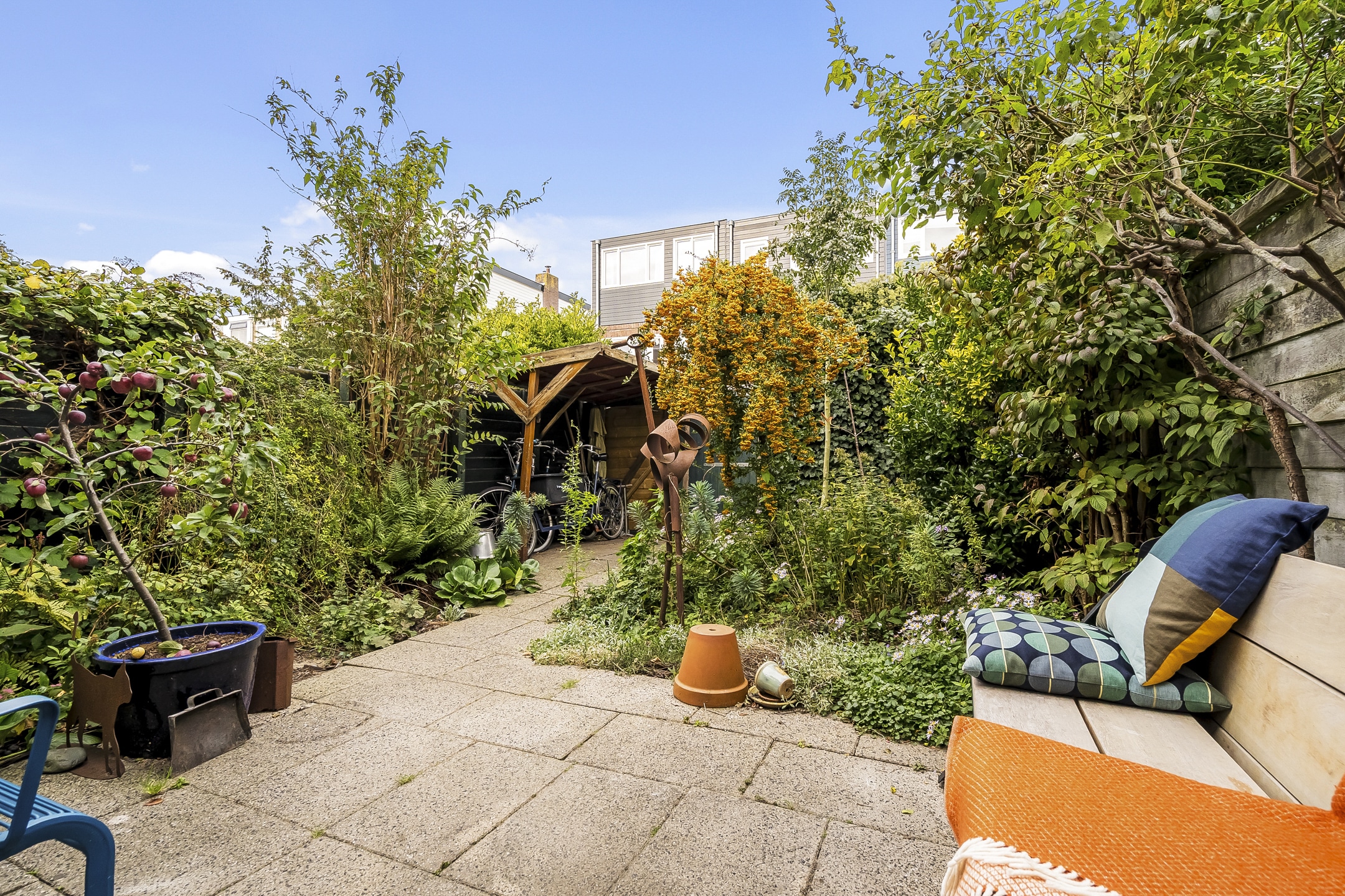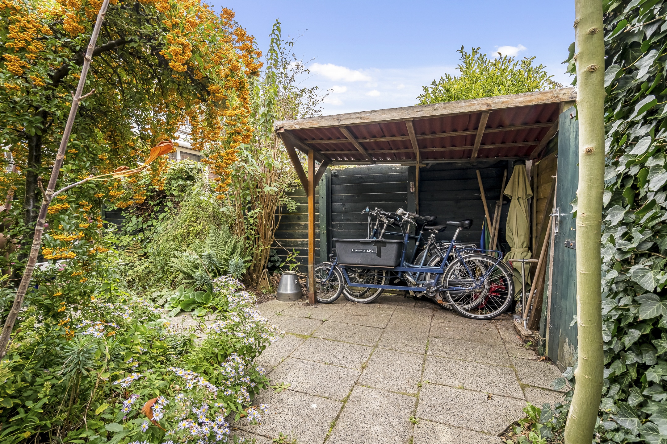 – Gezellige zonnige achtertuin (west) met fietsafdak en achterom
