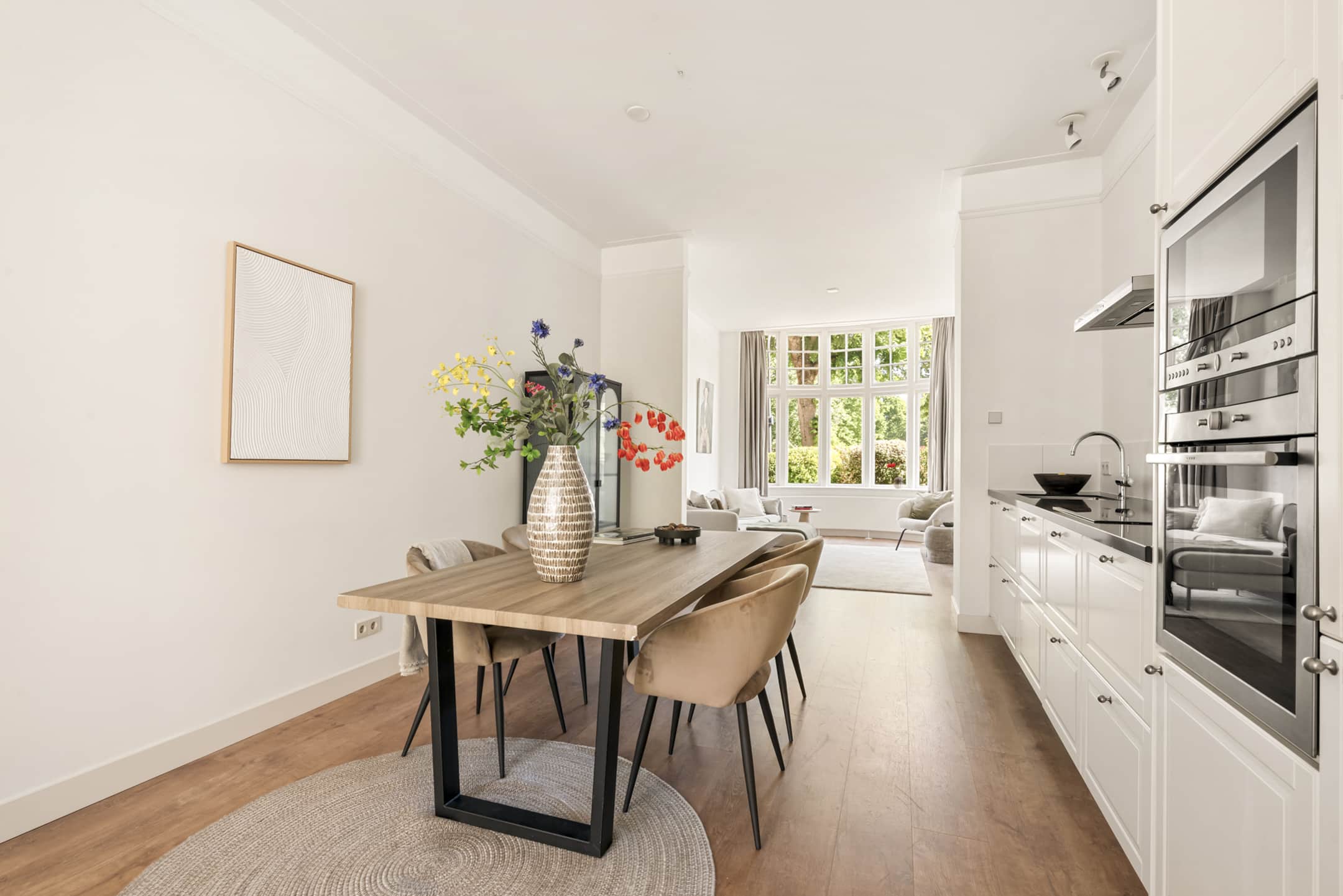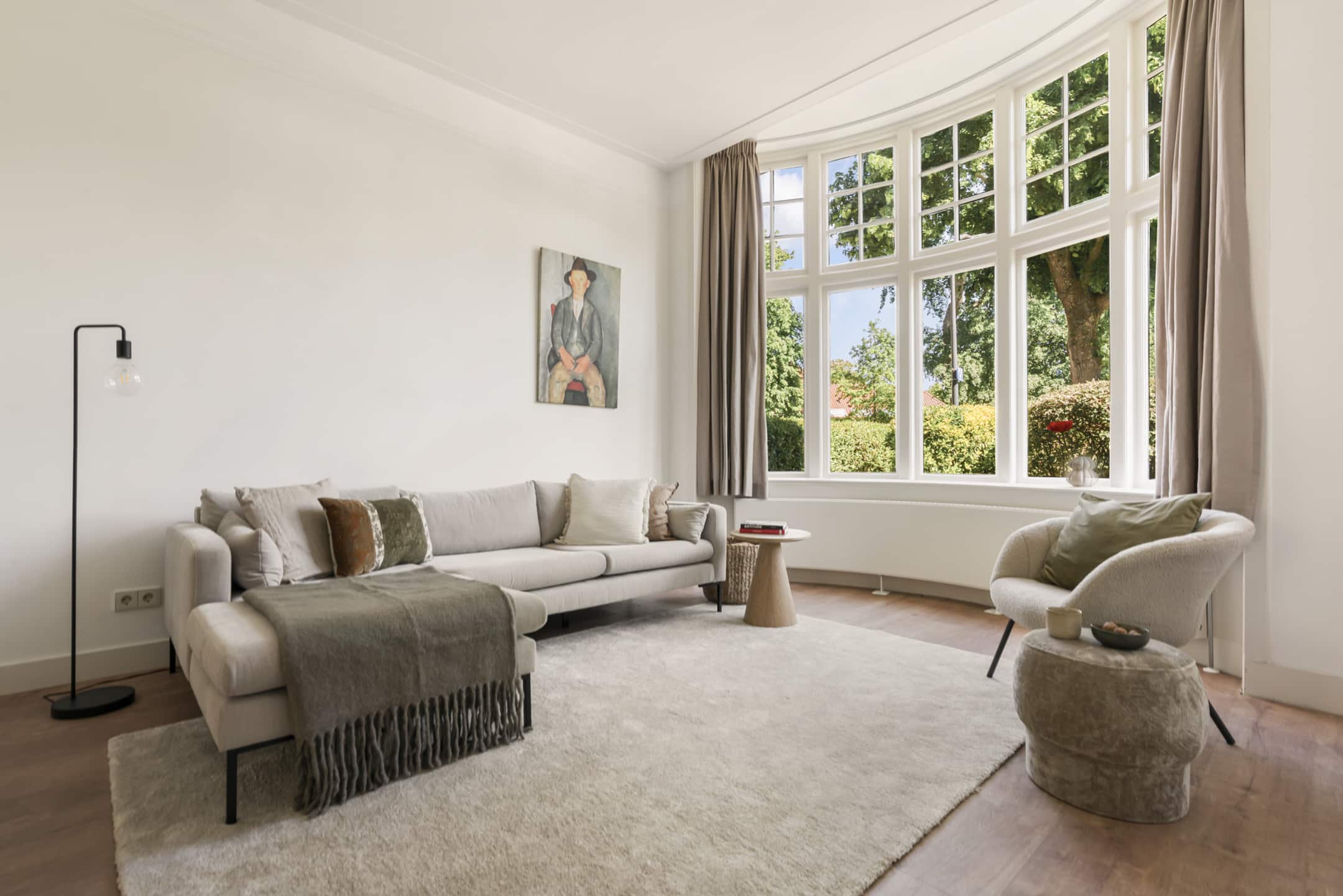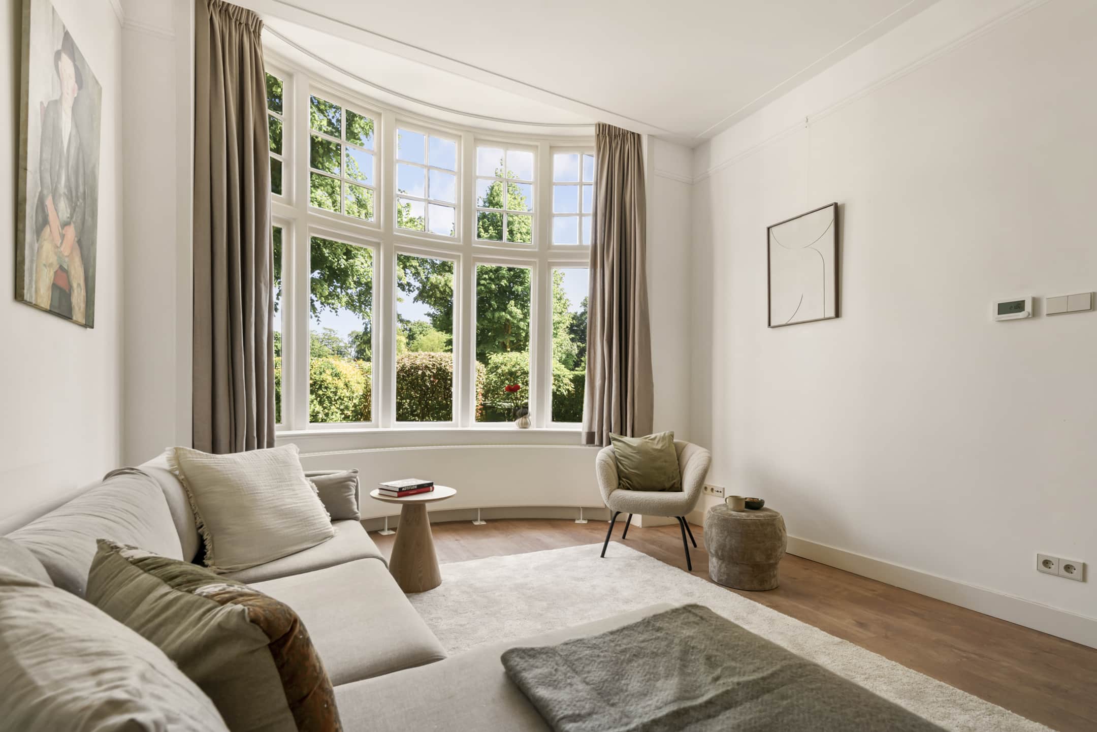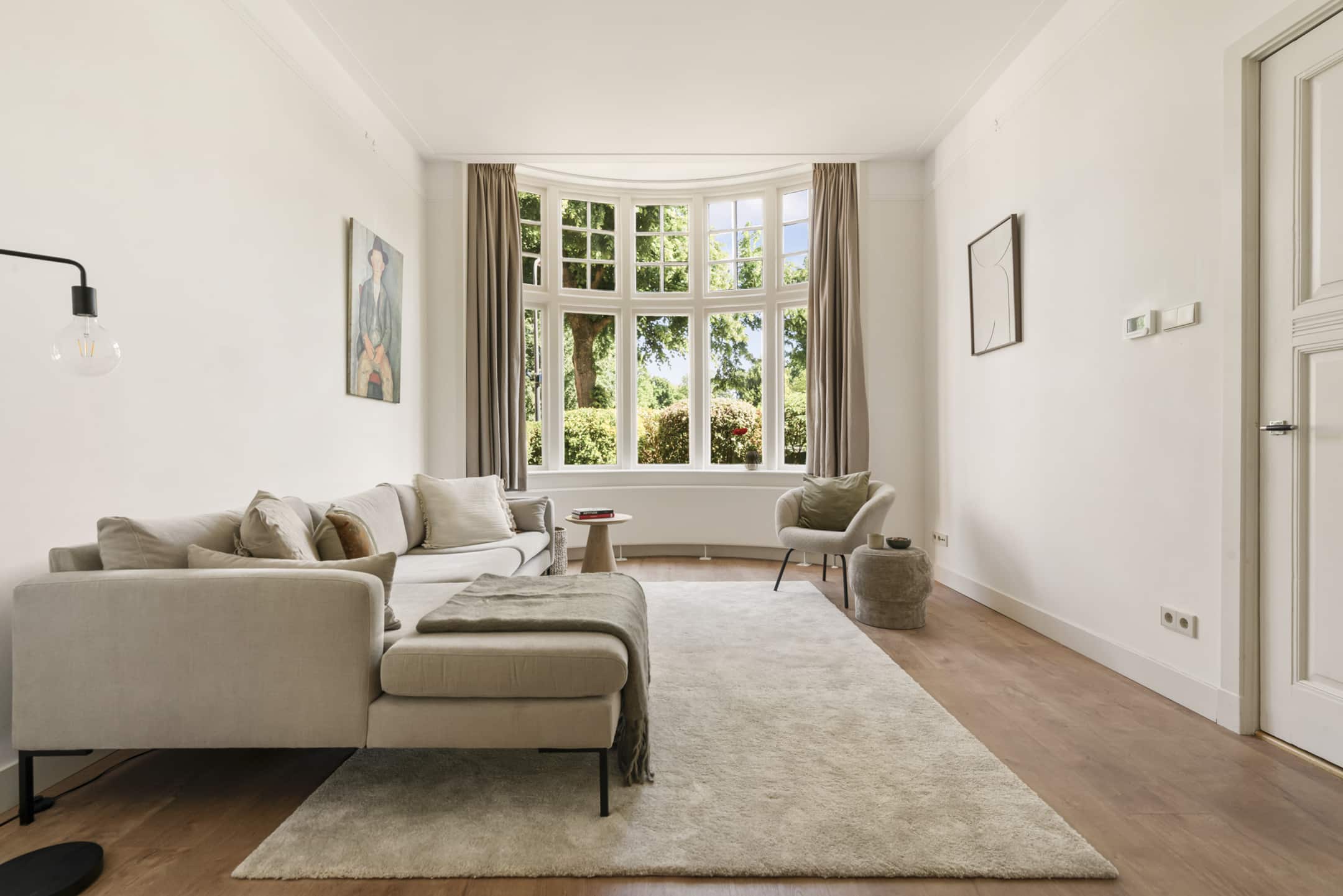 De woonkamer is ruim, met als eyecatcher de prachtige halfronde erker in Engelse landhuisstijl met klassieke roedeverdeling in de bovenste ramen. De designradiator volgt subtiel de vorm van de erker – een fraai staaltje vakwerk. De woonkamer is circa 3,75 meter breed. In combinatie met het vele licht en de ruim 3 meter hoge plafonds ervaar je een enorm gevoel van ruimte.