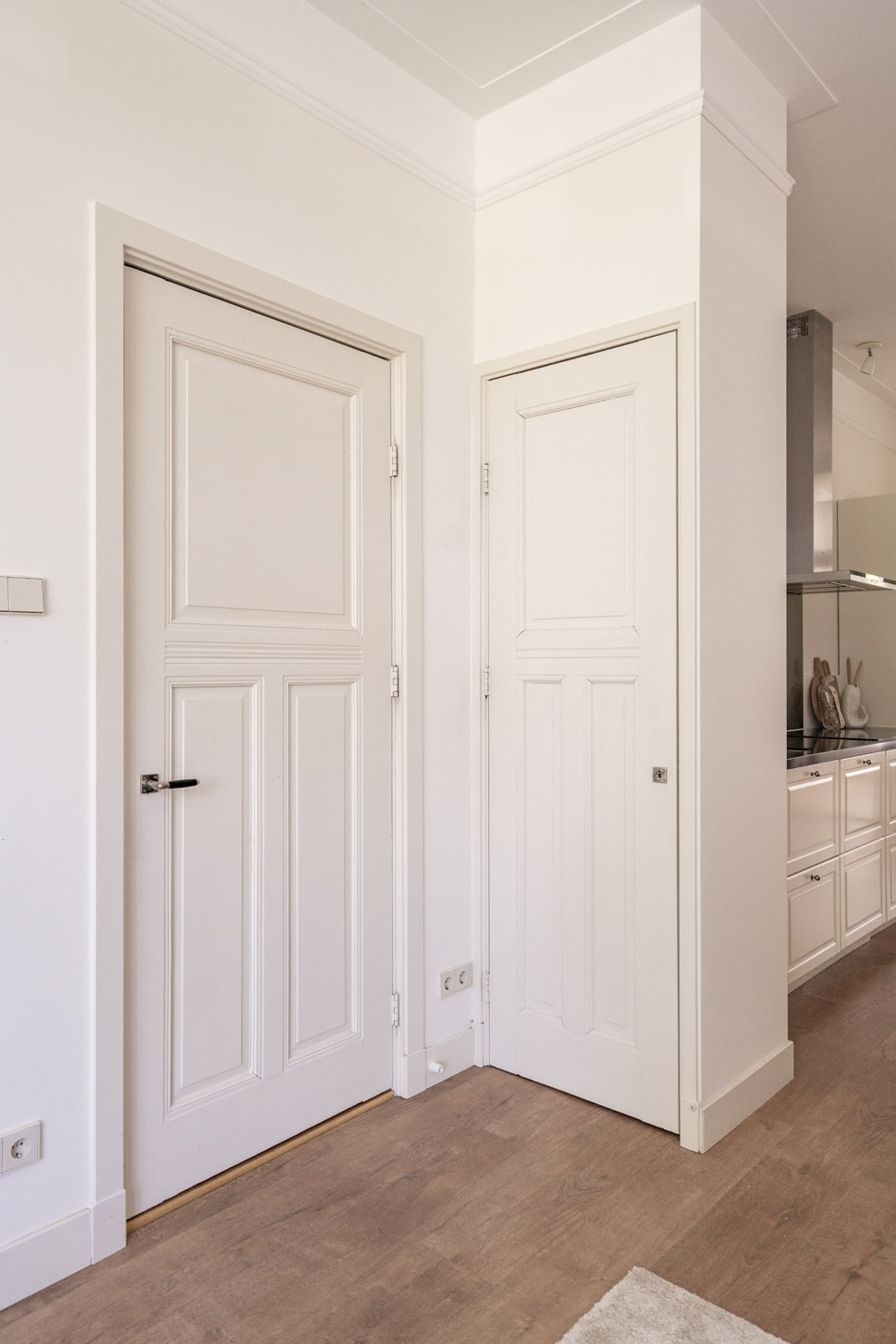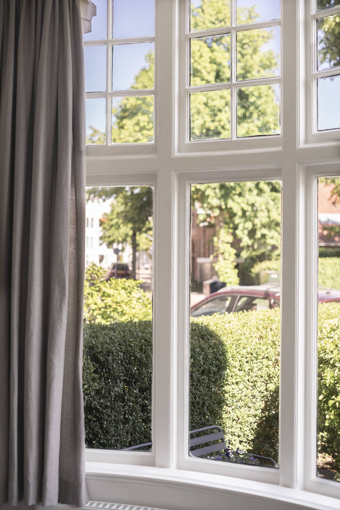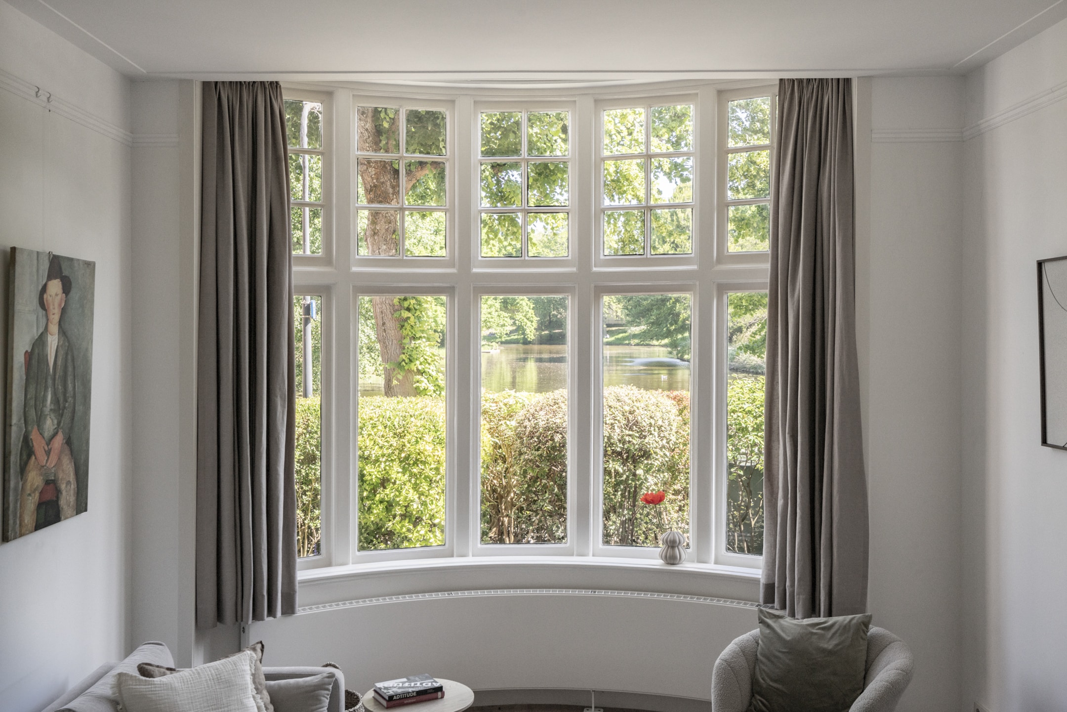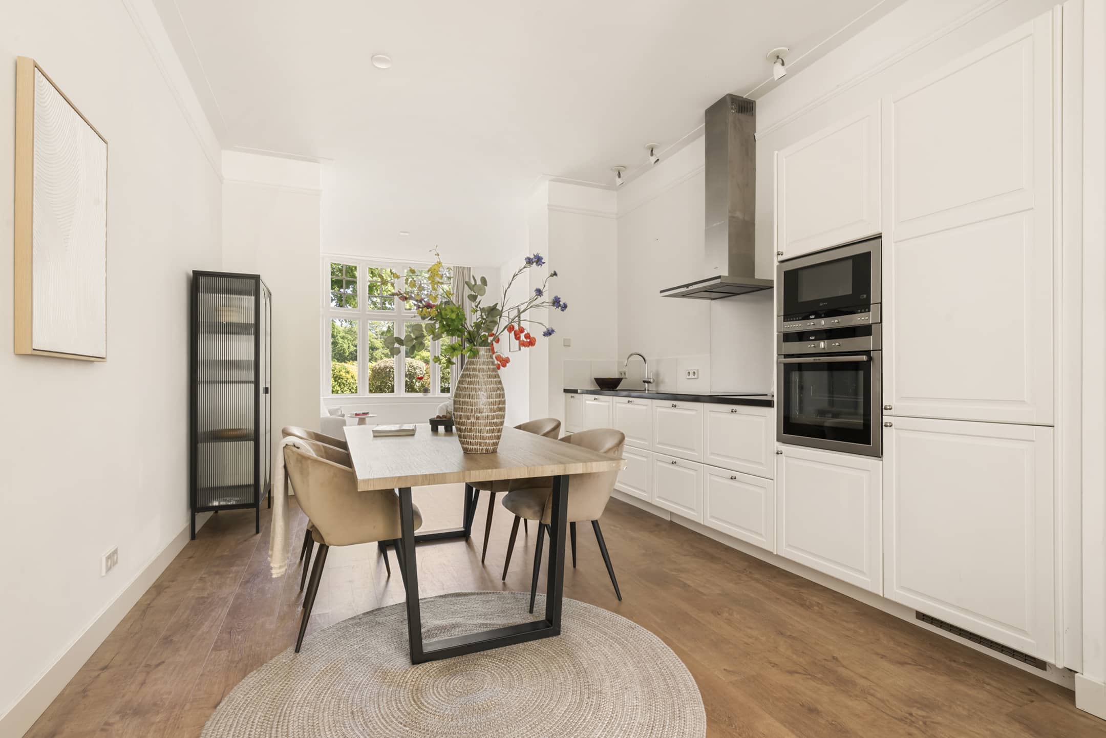 De woonkamer is ruim, met als eyecatcher de prachtige halfronde erker in Engelse landhuisstijl met klassieke roedeverdeling in de bovenste ramen. De designradiator volgt subtiel de vorm van de erker – een fraai staaltje vakwerk. De woonkamer is circa 3,75 meter breed. In combinatie met het vele licht en de ruim 3 meter hoge plafonds ervaar je een enorm gevoel van ruimte.