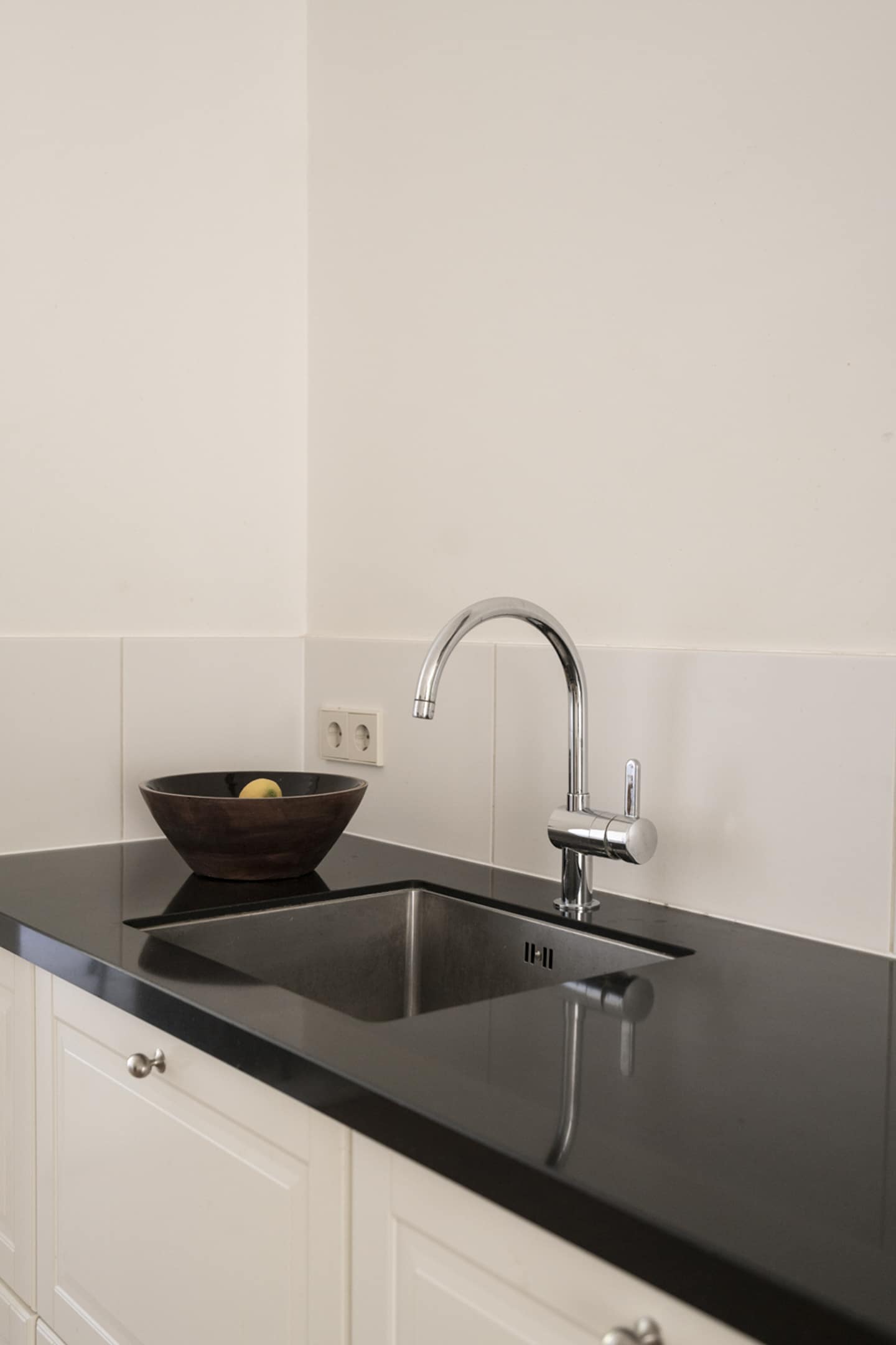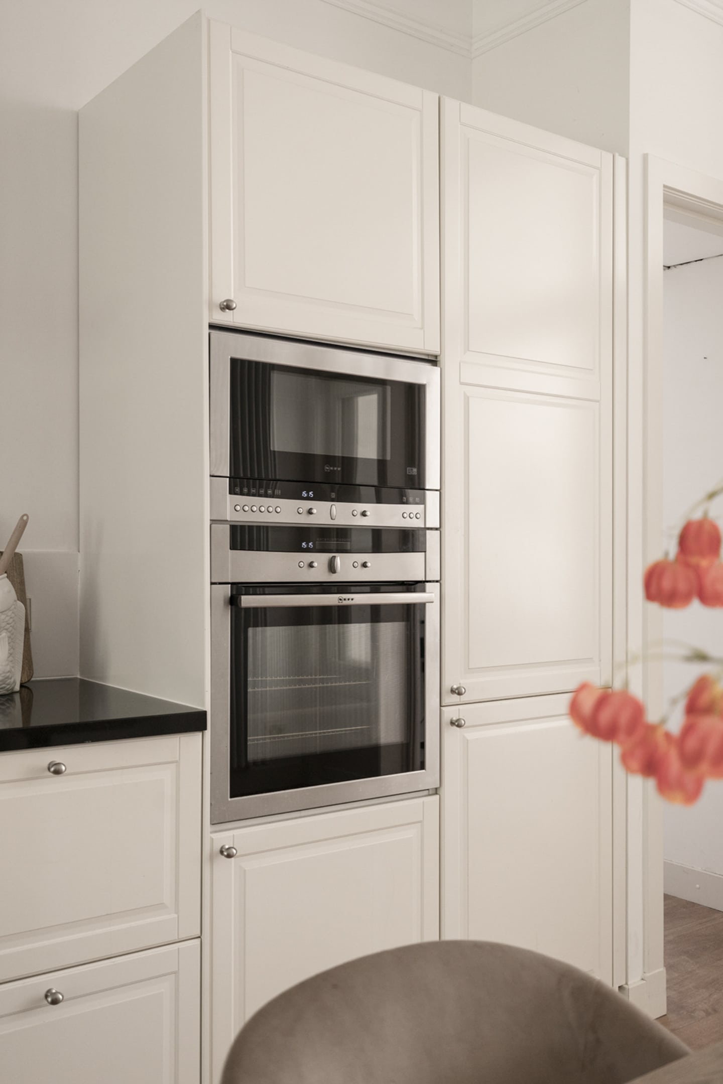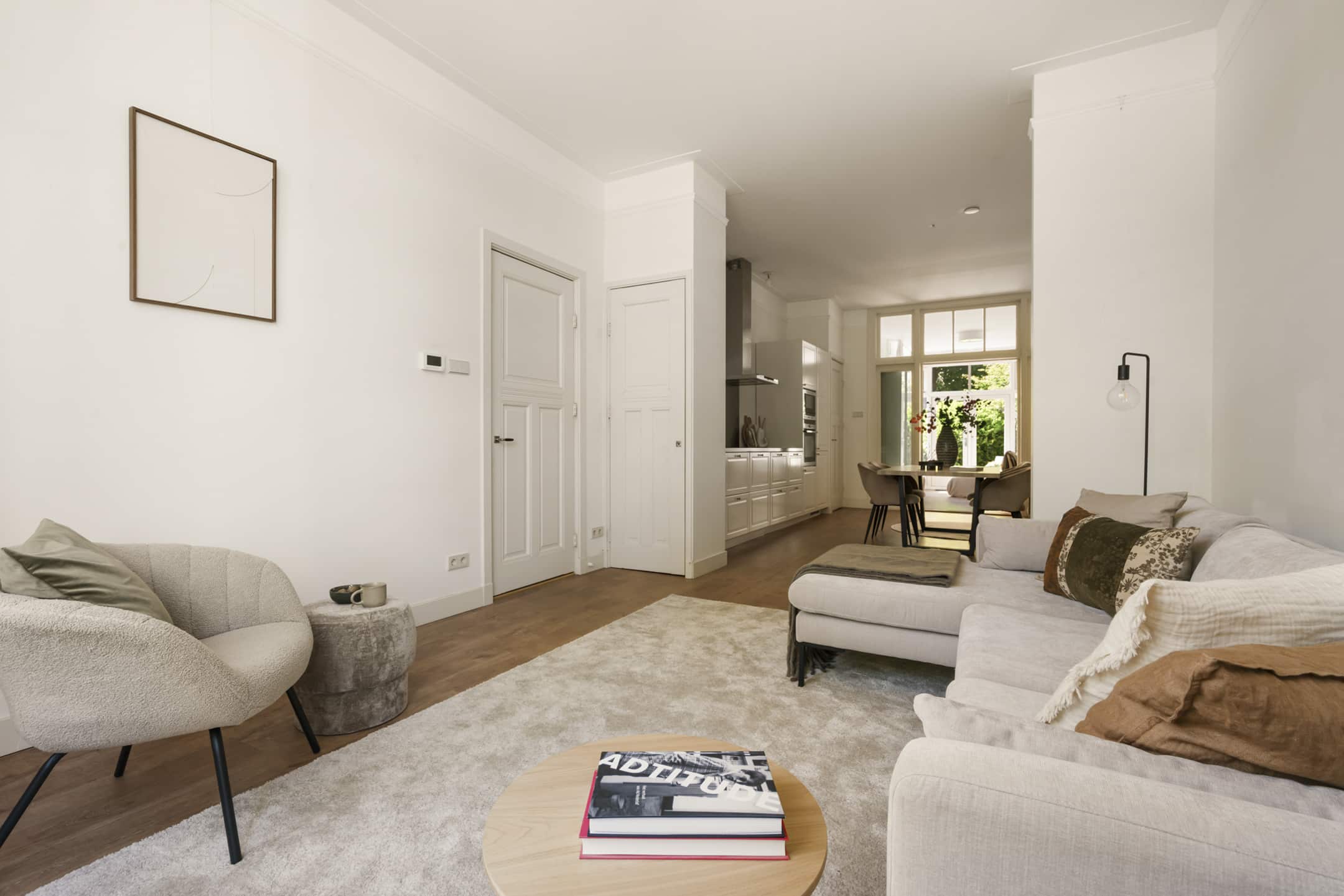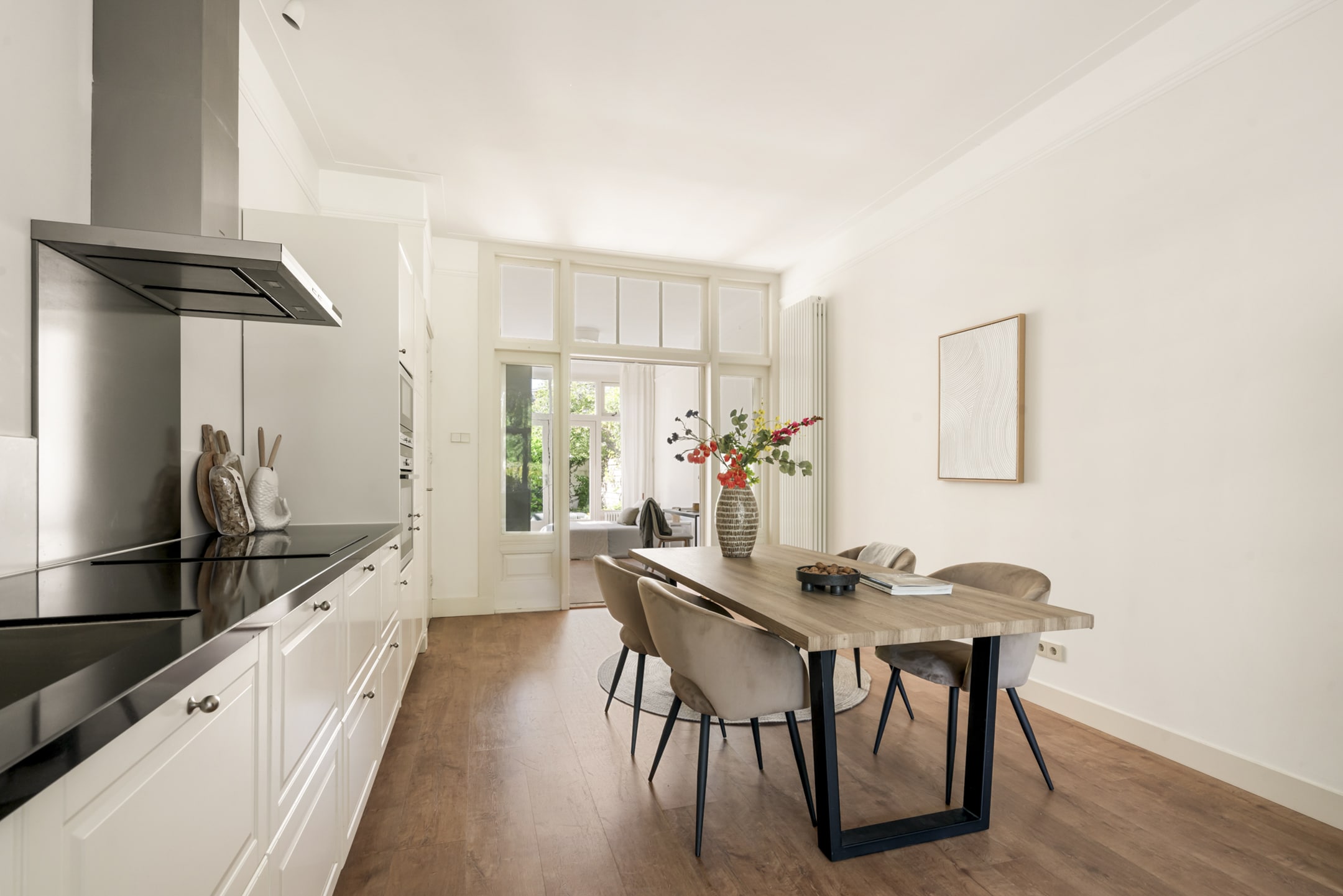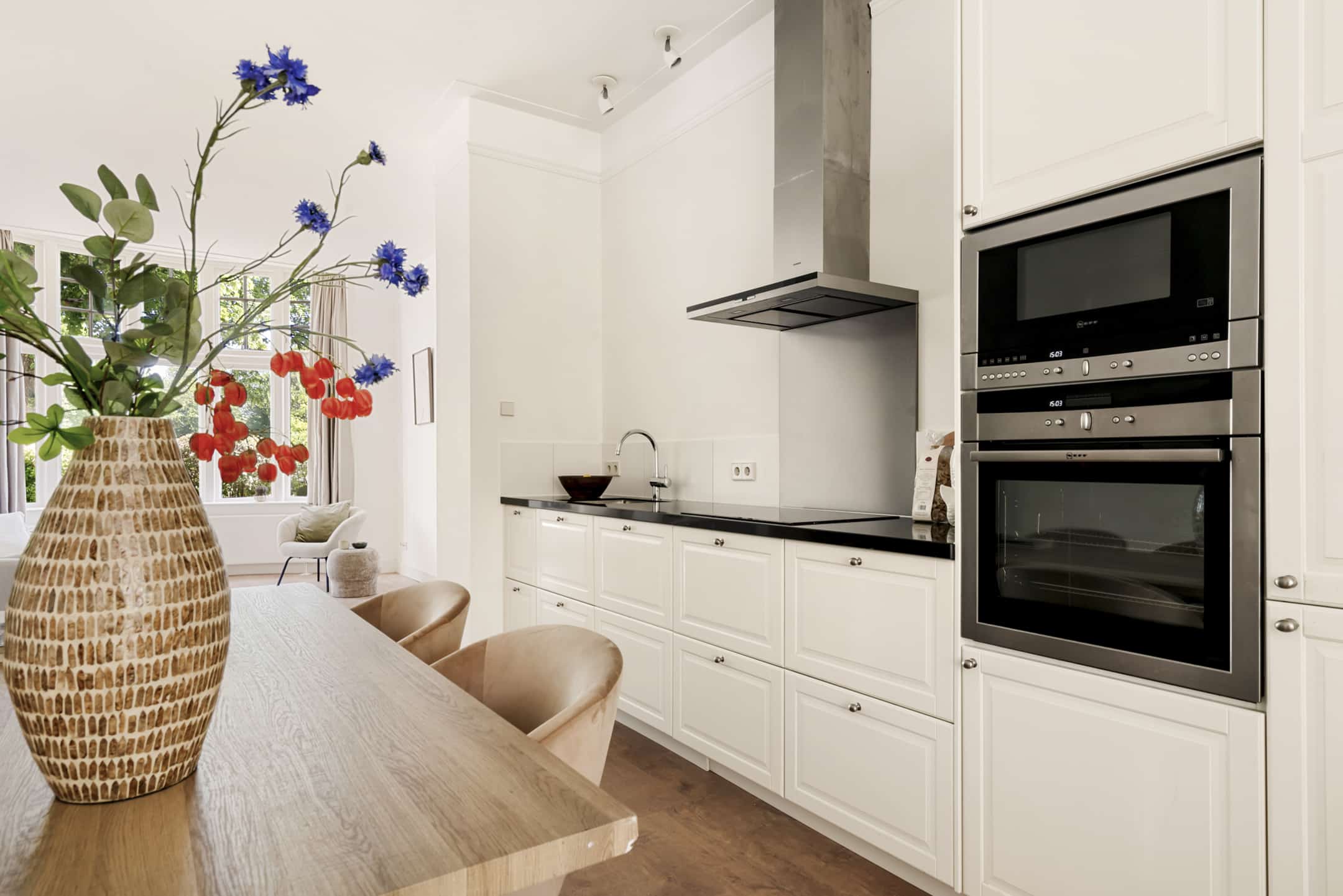 Het zitgedeelte van de woonkamer grenst aan de moderne open keuken, die volop ruimte biedt voor een grote eettafel. De keuken is voorzien van alle gewenste inbouwapparatuur: inductiekookplaat met afzuigkap, oven, magnetron, vaatwasser, koelkast en separate vriezer. Het lange aanrechtblad biedt lekker veel werkruimte.