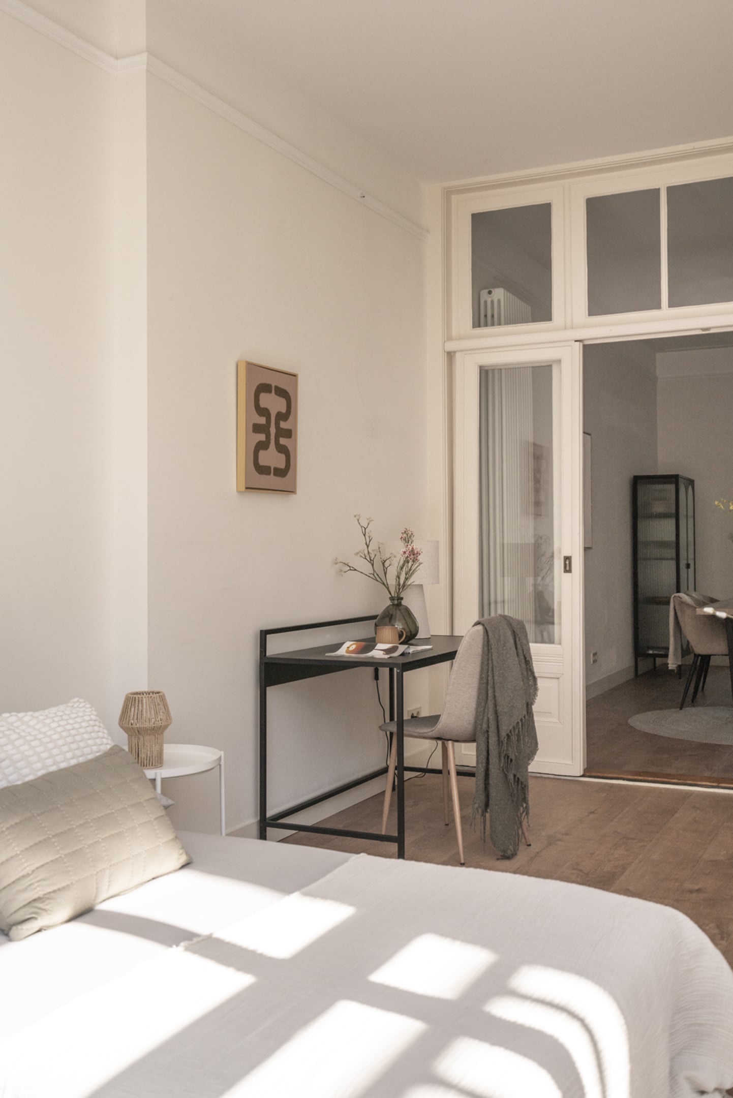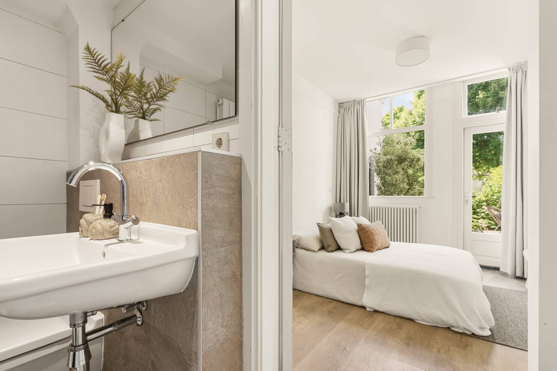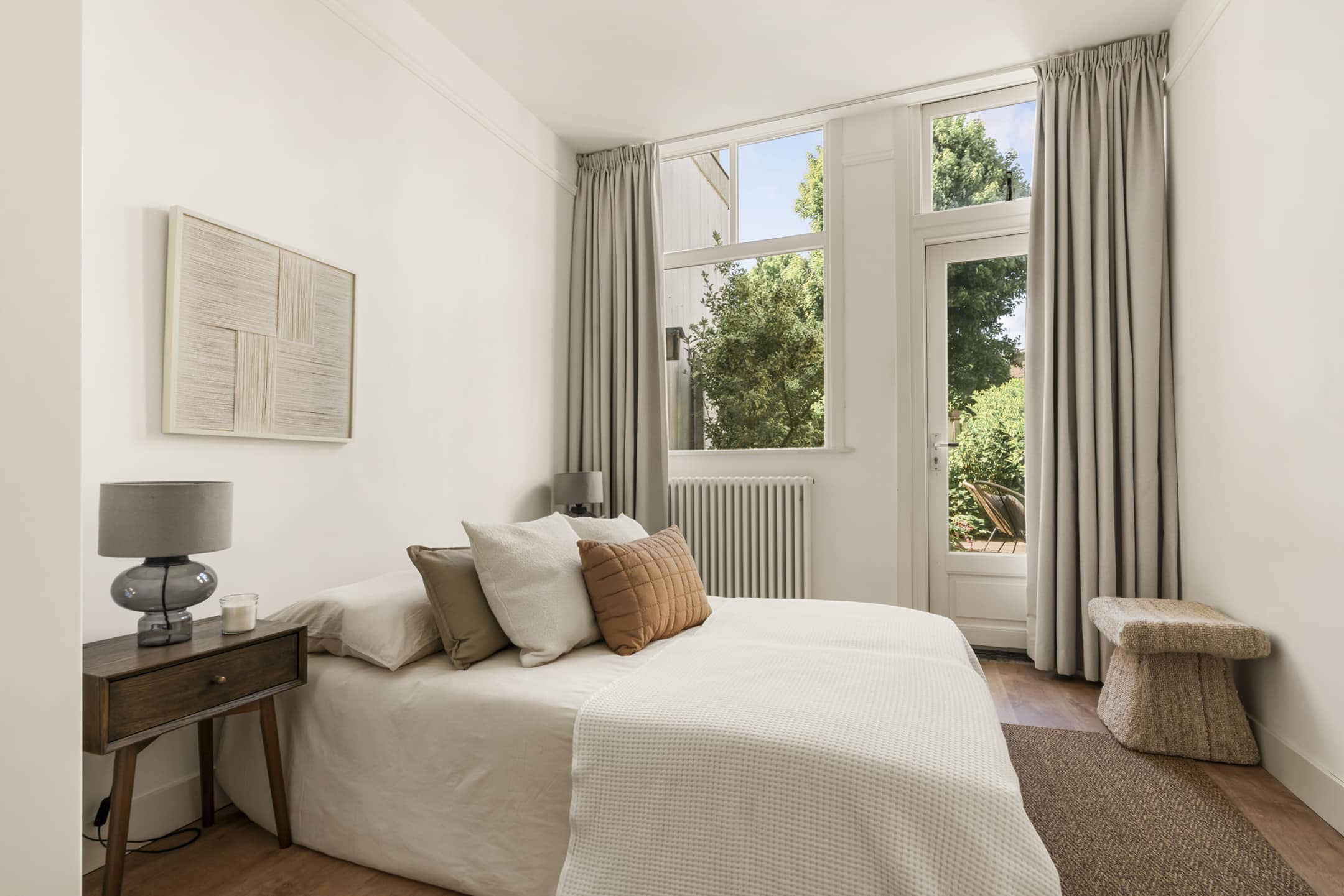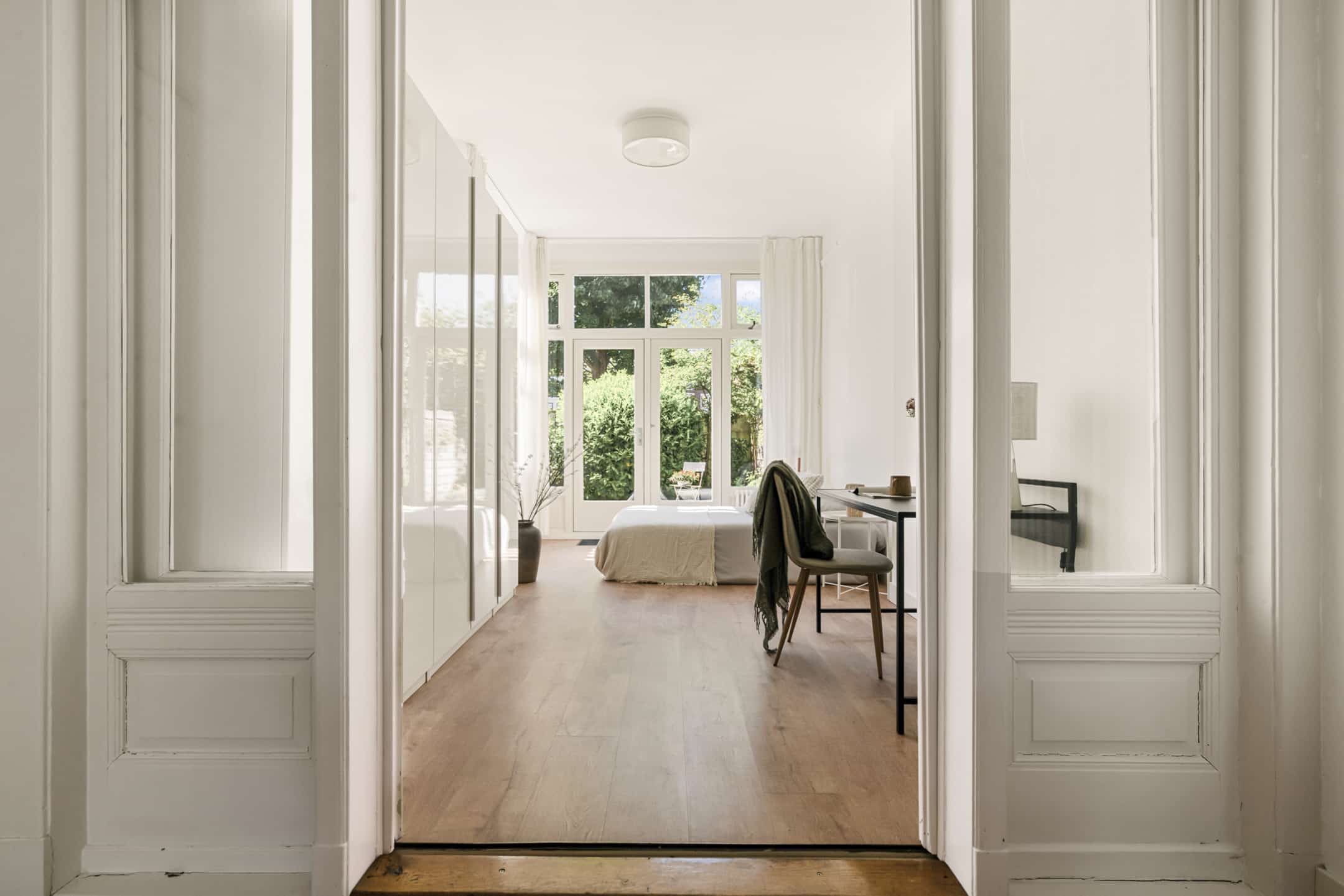 Achter de woonkamer ligt de uitgebouwde tuinkamer, momenteel in gebruik als royale slaapkamer. Dankzij de grote raampartijen en de openslaande deuren naar de tuin voelt deze kamer als een verlengstuk van buiten. Het is alsof je ontwaakt in het groen. De slaapkamer is van de woonkamer gescheiden middels de authentieke schuifdeuren. Er is ruimte genoeg voor een grote garderobekast. Ook de 2e slaapkamer aan de tuinzijde ademt sfeer en rust. Vanuit deze slaapkamer is de tuin eveneens direct toegankelijk. Overigens is één van beide slaapkamers natuurlijk ook uitstekend te gebruiken als werk- of studeervertrek.