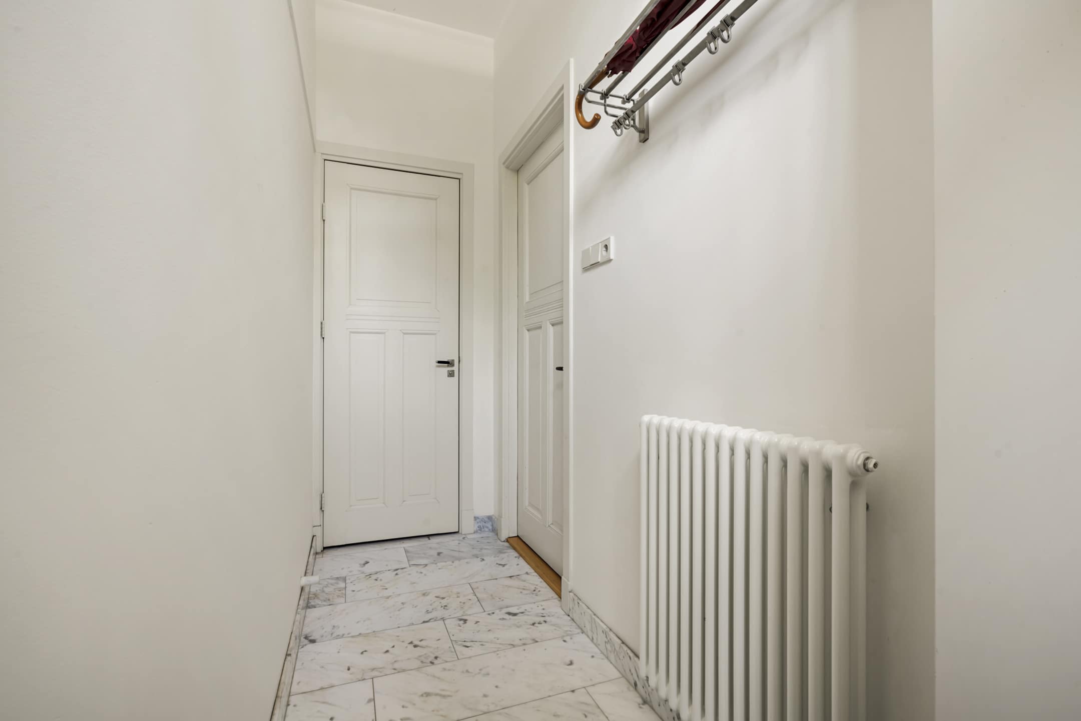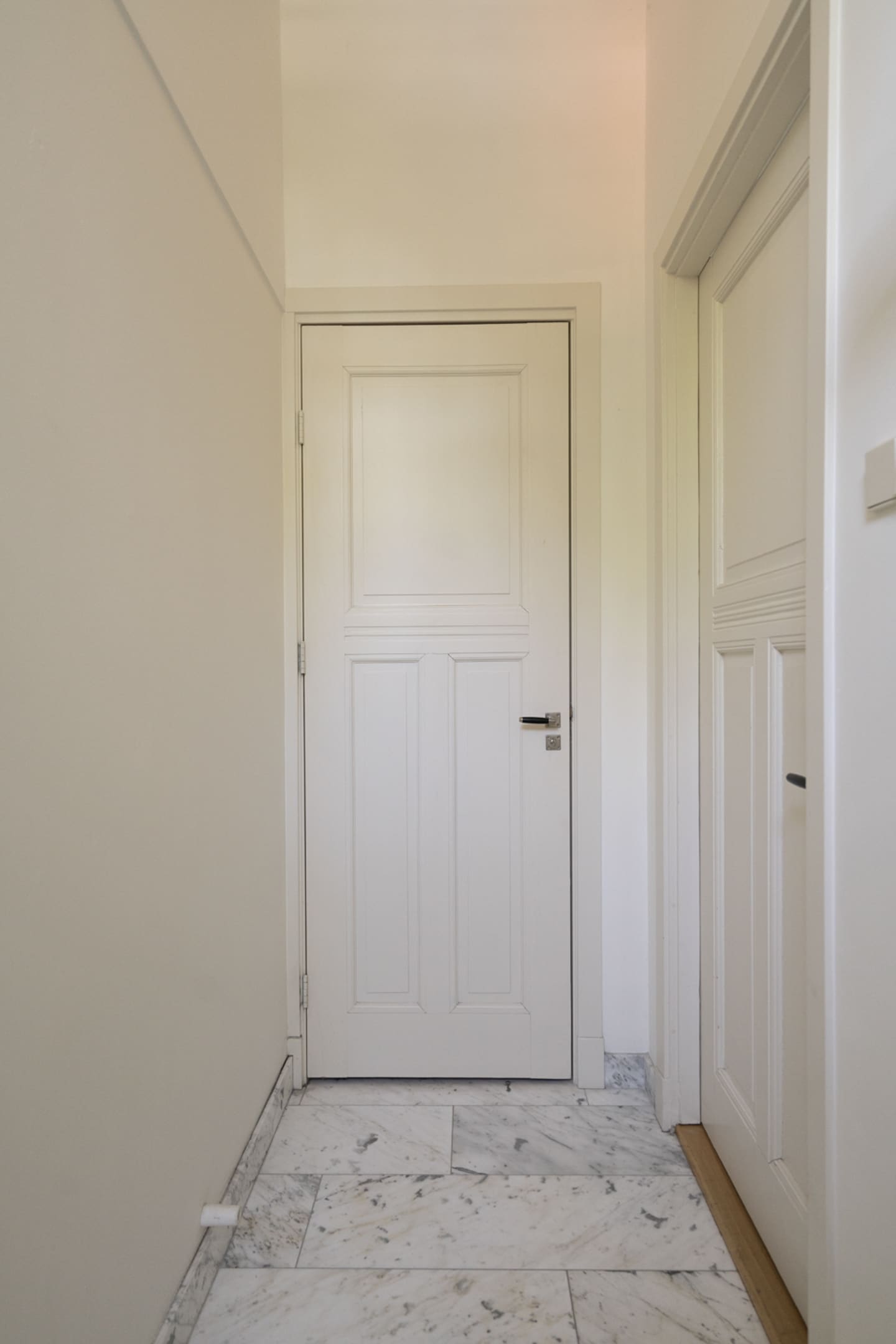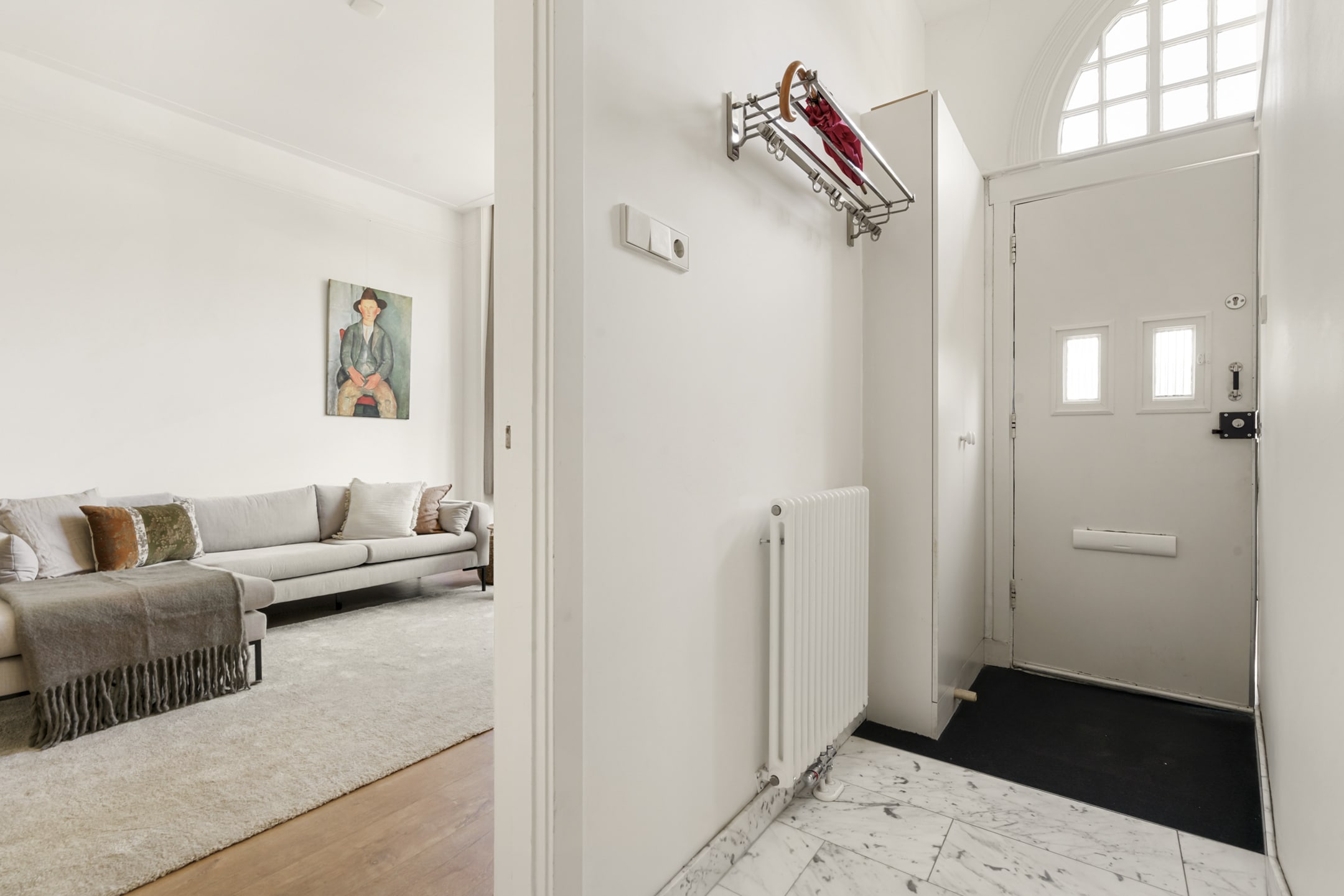 Hal met marmeren vloer, meterkast en garderoberuimte. Royaal en verzorgd gastentoilet met fonteintje. Woonkamer