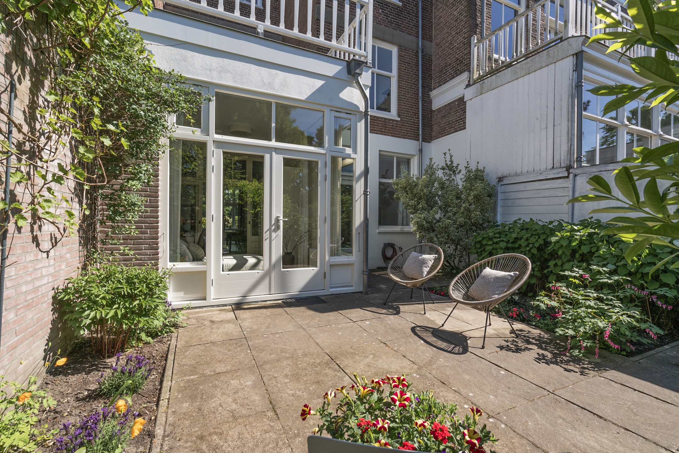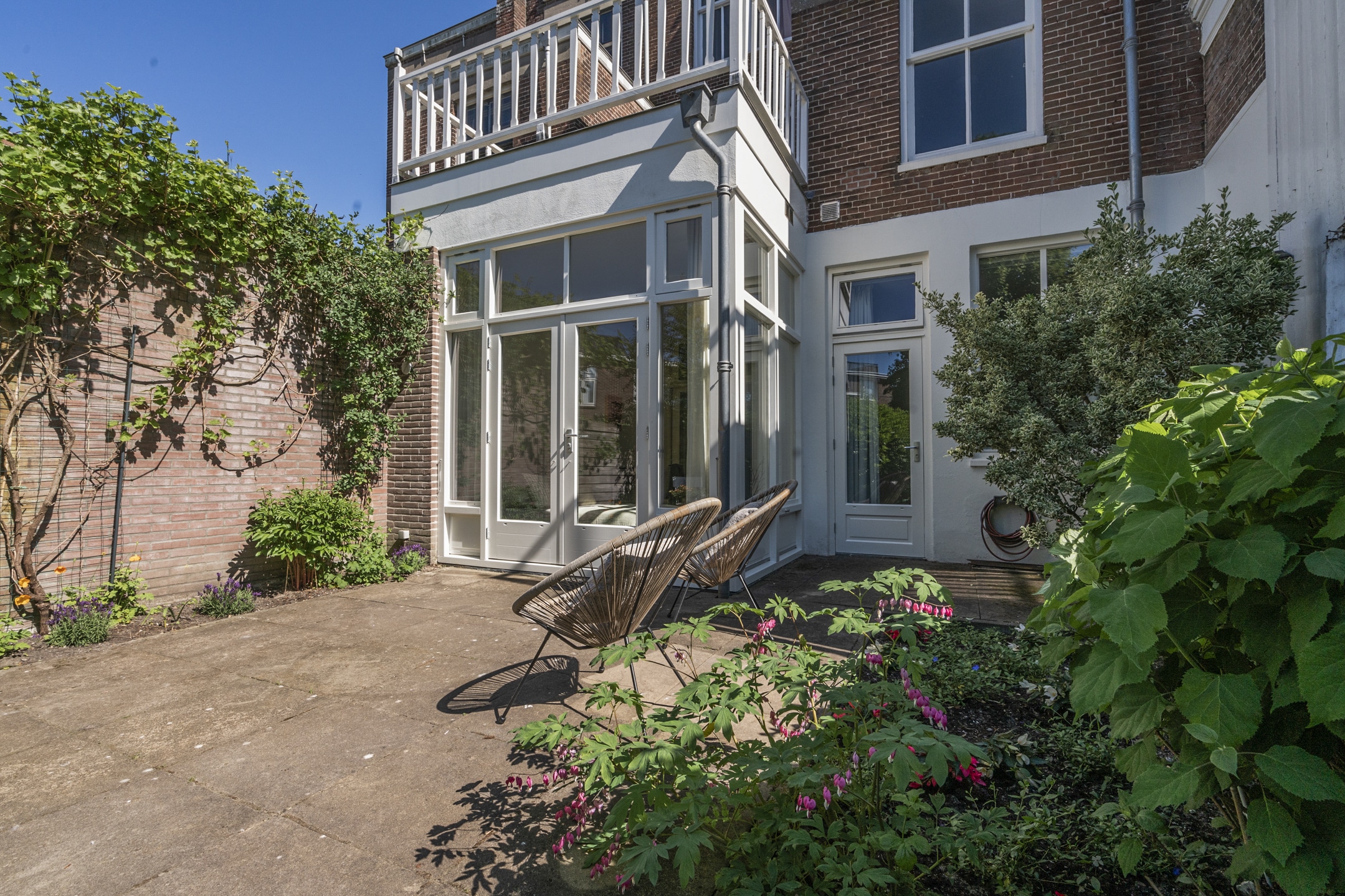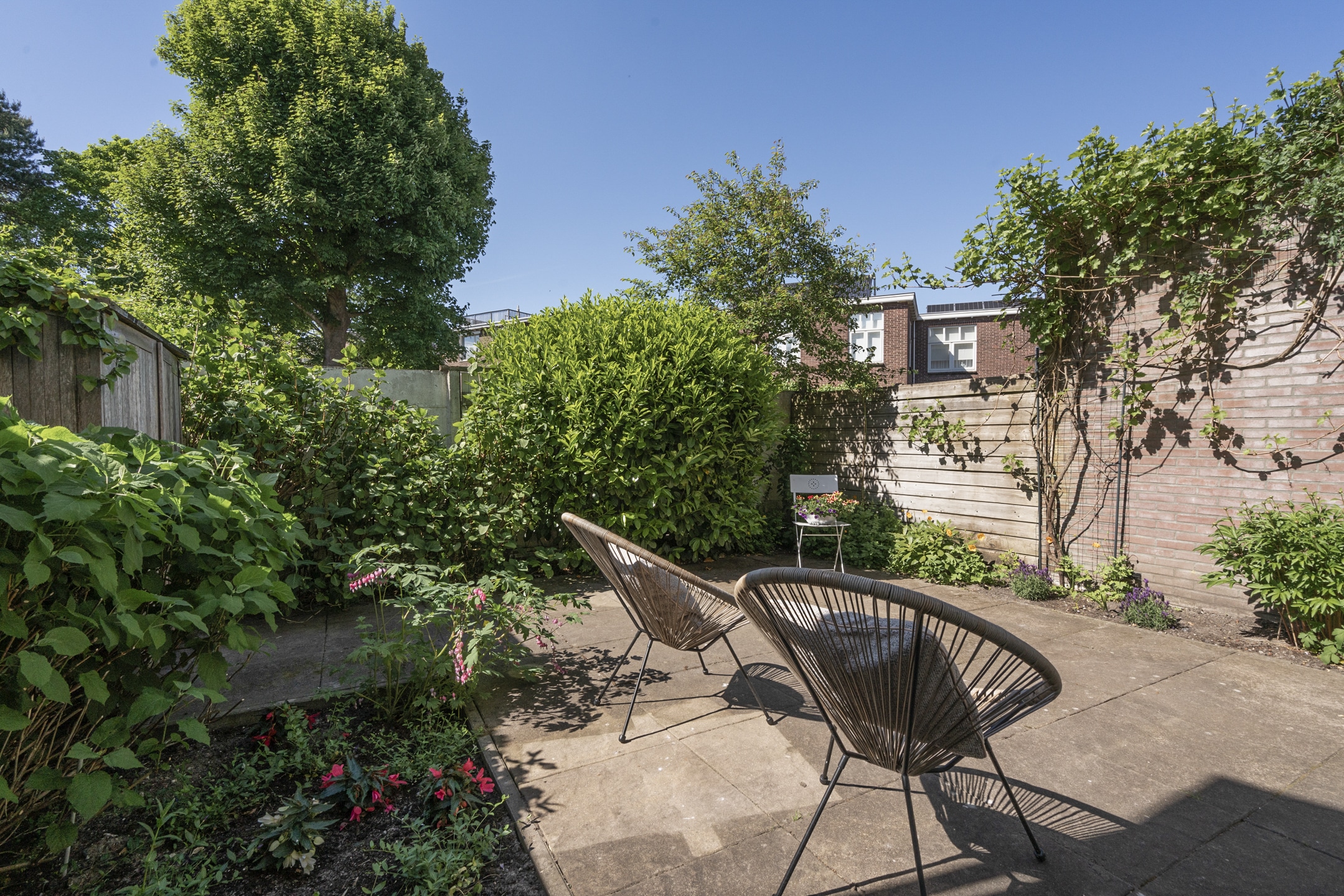 De achtertuin op het noordwesten is een oase van rust en privacy. Op het ruime terras, omzoomd door borders en opgaand groen, is het vanaf het voorjaar goed toeven in de middag- en avondzon. De tuin meet ruim 7,5 meter diep en is bijna 6 meter breed.