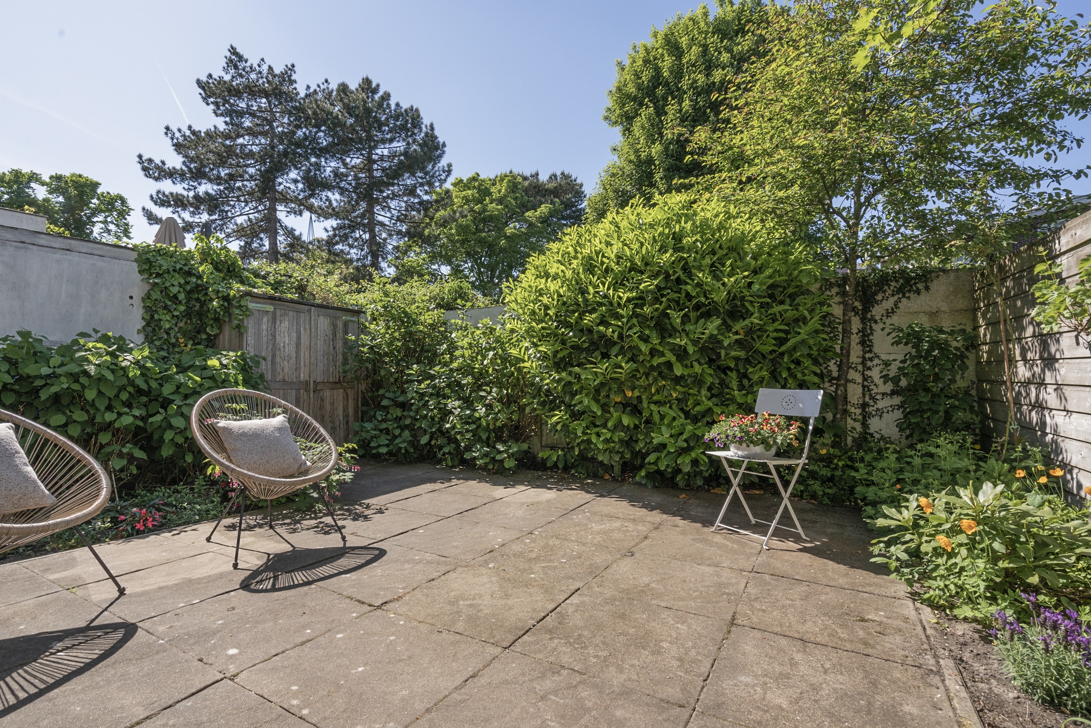 De ruime voortuin op het zuidoosten biedt meer dan genoeg plek voor een gezellig en toch privé zitje in de zon. Entree