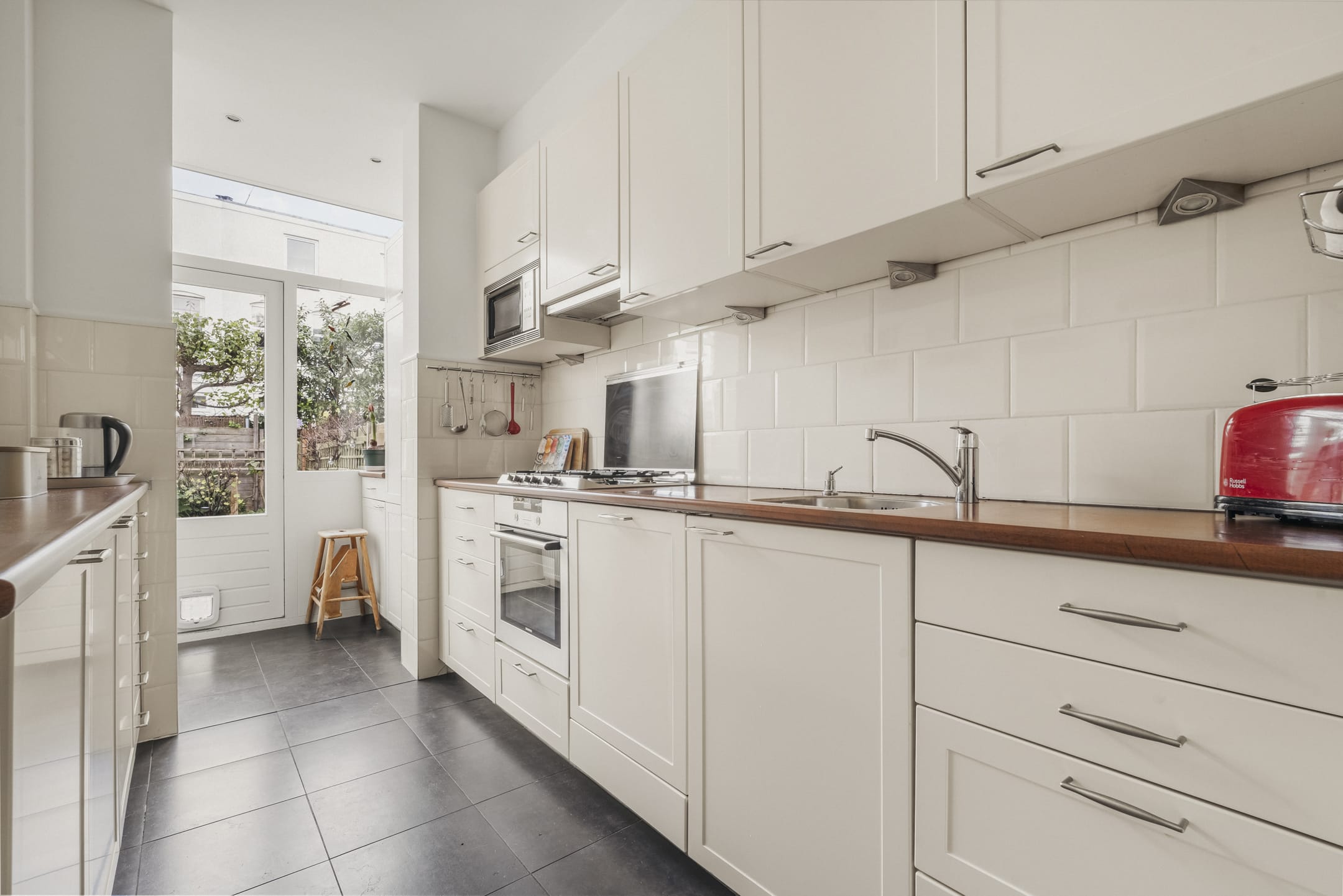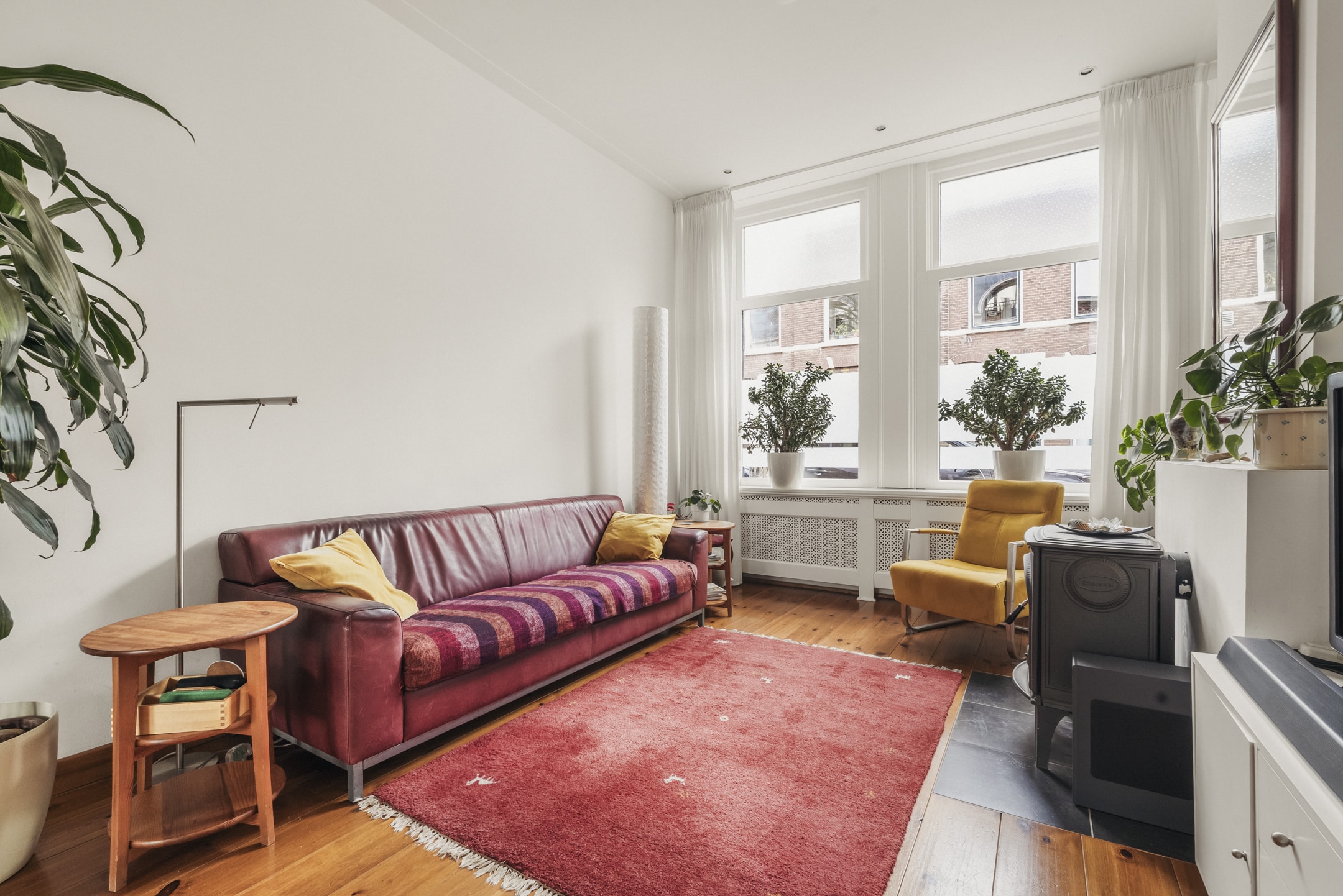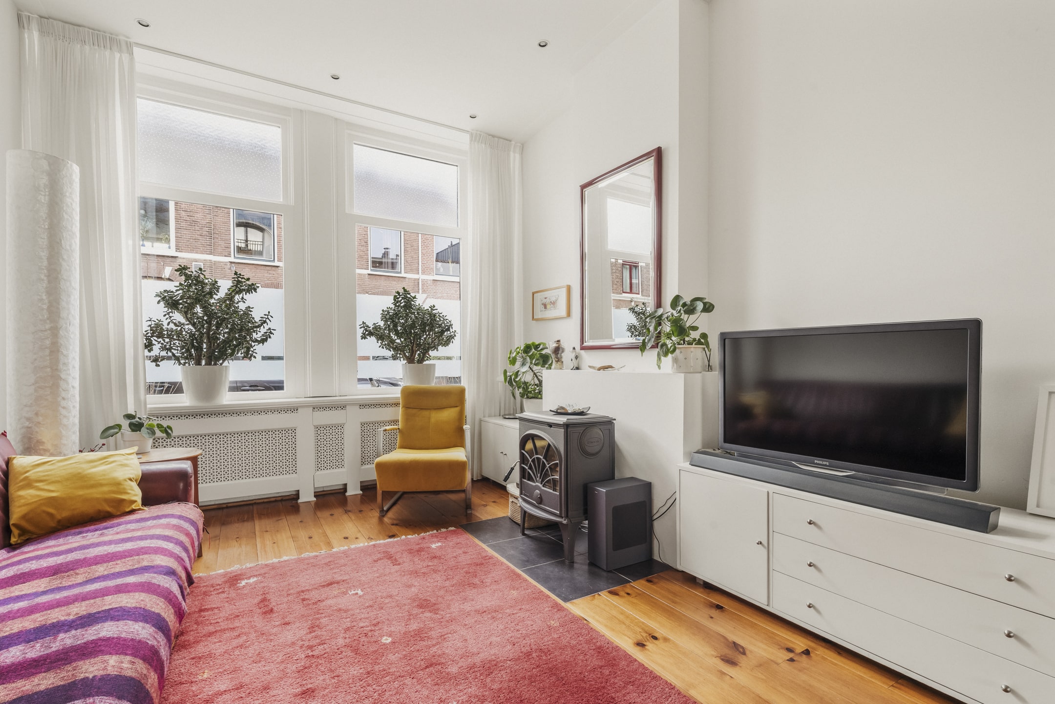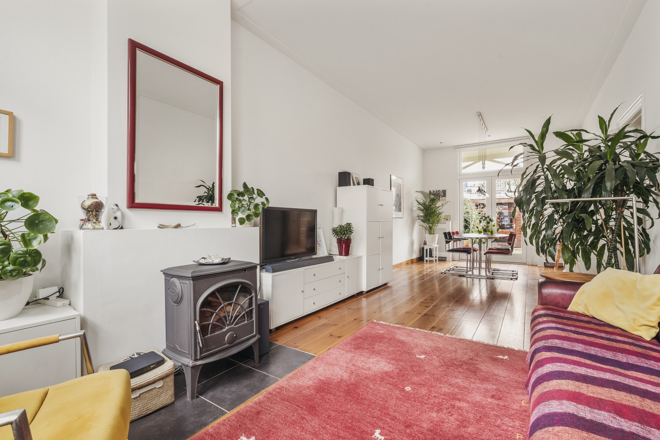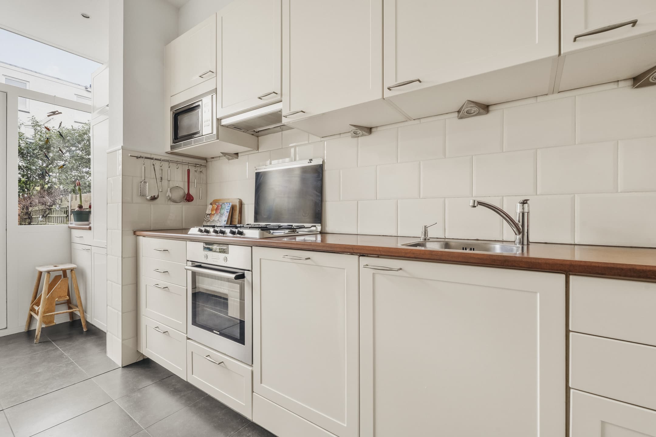 Begane grond: Entree, hal met meterkast, gang met verdiepte trapkast, toilet, ruime woonkamer met HOUTKACHEL en openslaande deuren naar de tuin. In de woonkamer ligt een grenen houten vloer en het plafond is 3,04 meter hoog, wat een prettig gevoel van ruimte geeft. De nette keuken is voorzien van een 6-pits gaskookplaat met afzuigkap, oven, vaatwasser en magnetron. De keuken is ooit verlengd met een praktische bijkeuken, hier bevinden zich nu de koelkast en vriezer. Direct aan de woonkamer grenst de originele veranda die alle woningen in de Tetterodestraat ooit hadden, een prachtig stukje karakteristiek waaronder je heerlijk kan zitten.