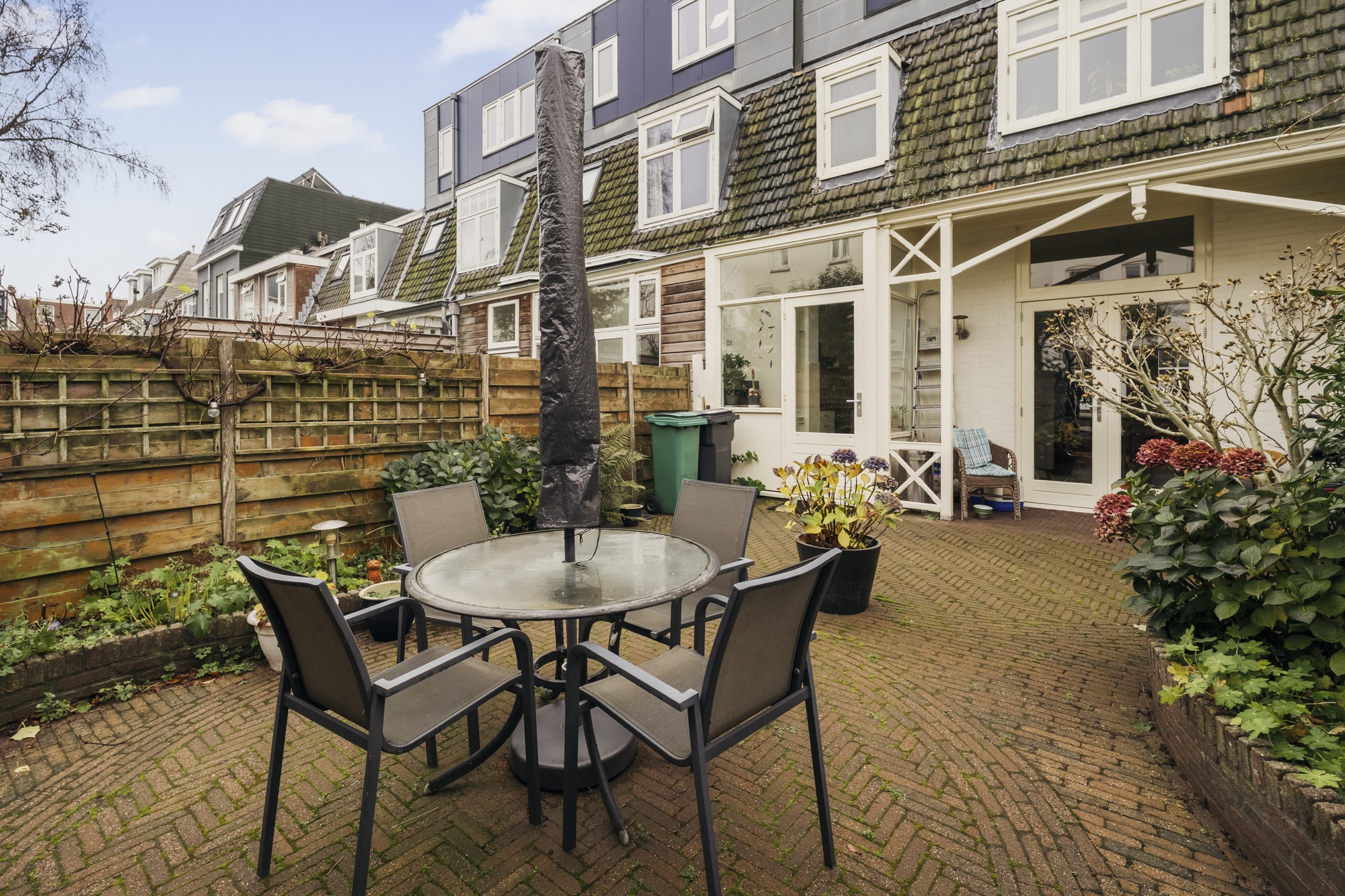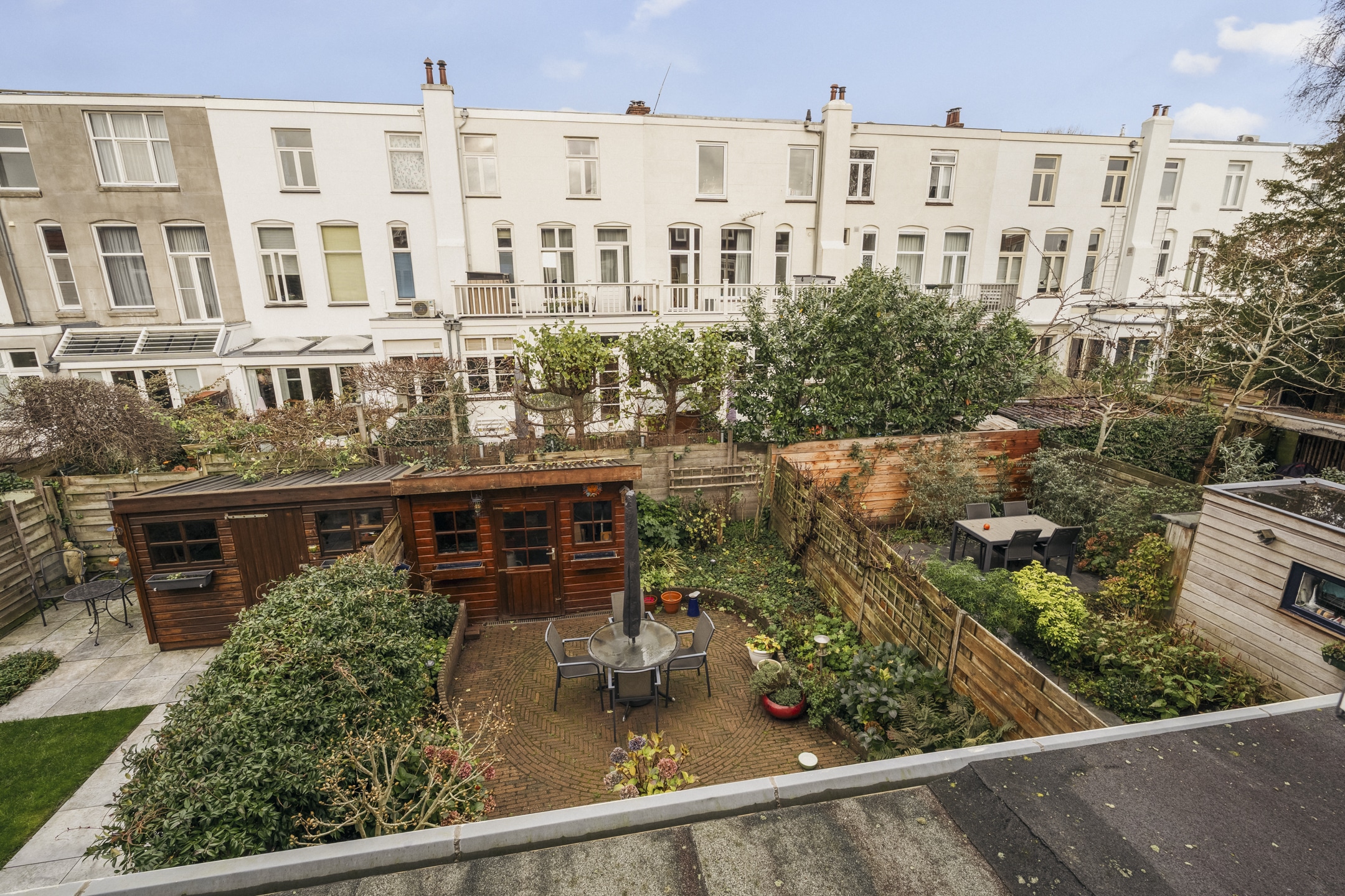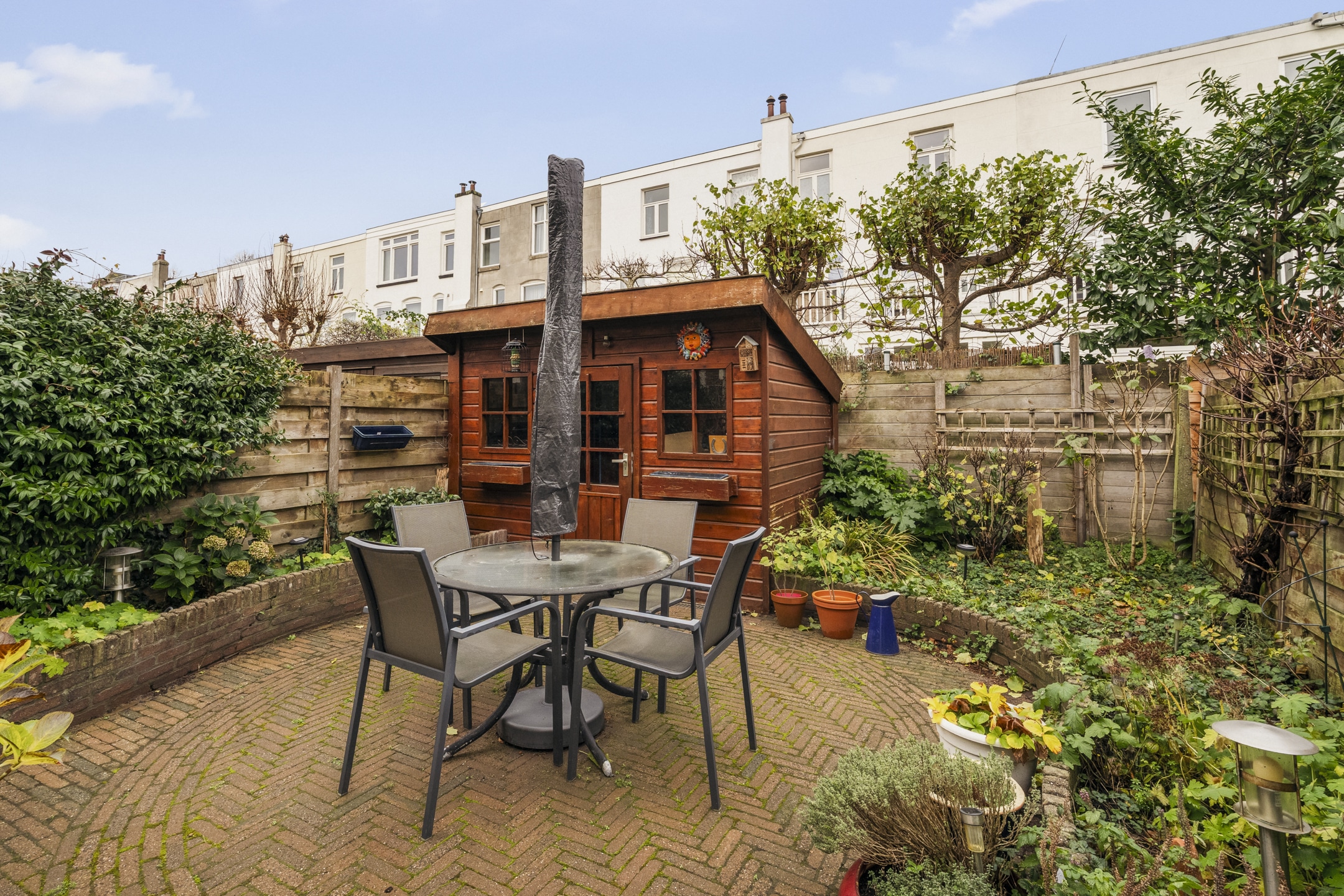De achtertuin van de woning is net even meer dan 9 meter diep en heeft een goede afstand tot de achterburen aan de Kleverparkweg. Achter in de tuin staat een vrijstaande houten schuur (5,9m2) die voorzien is van elektra.