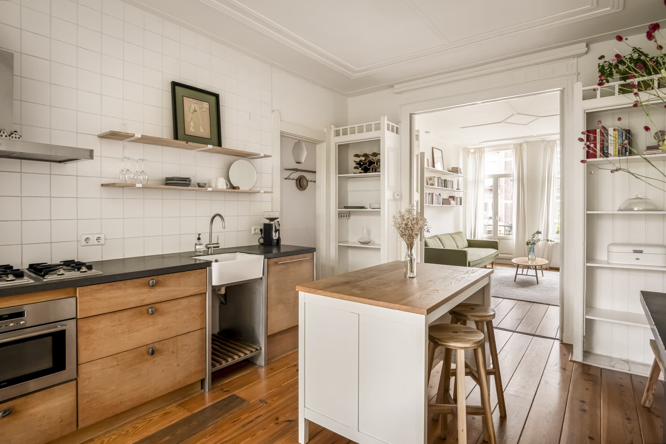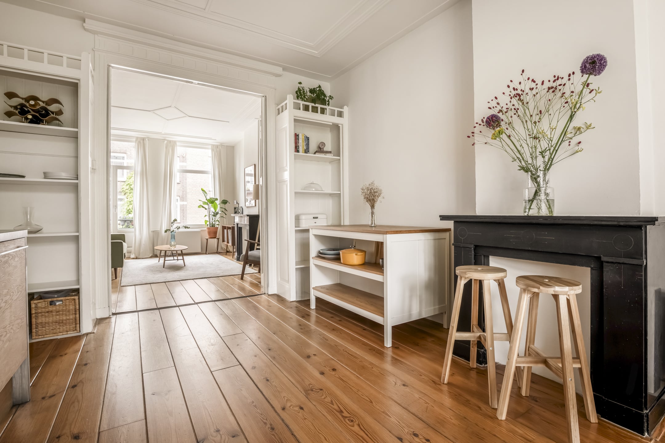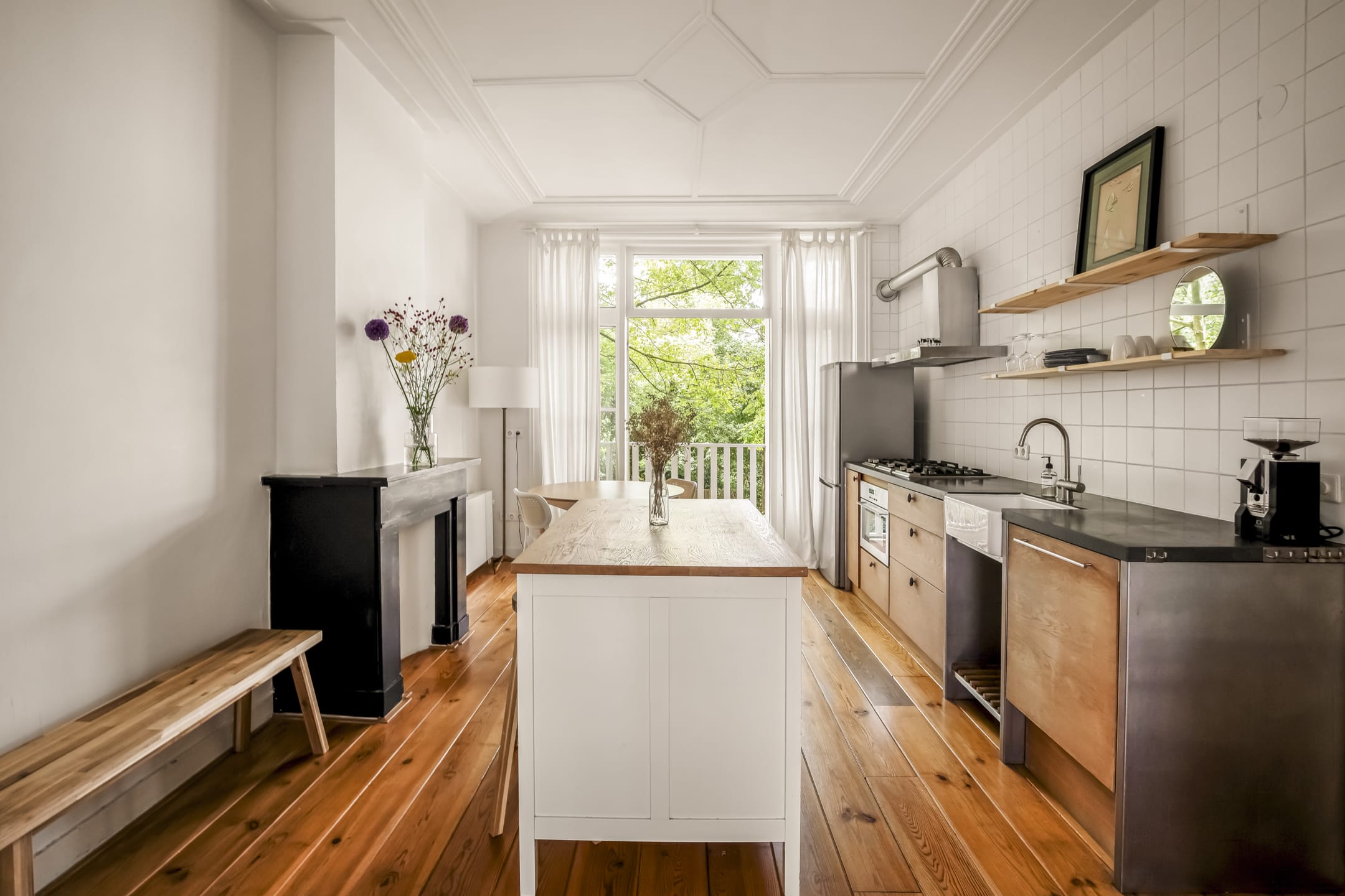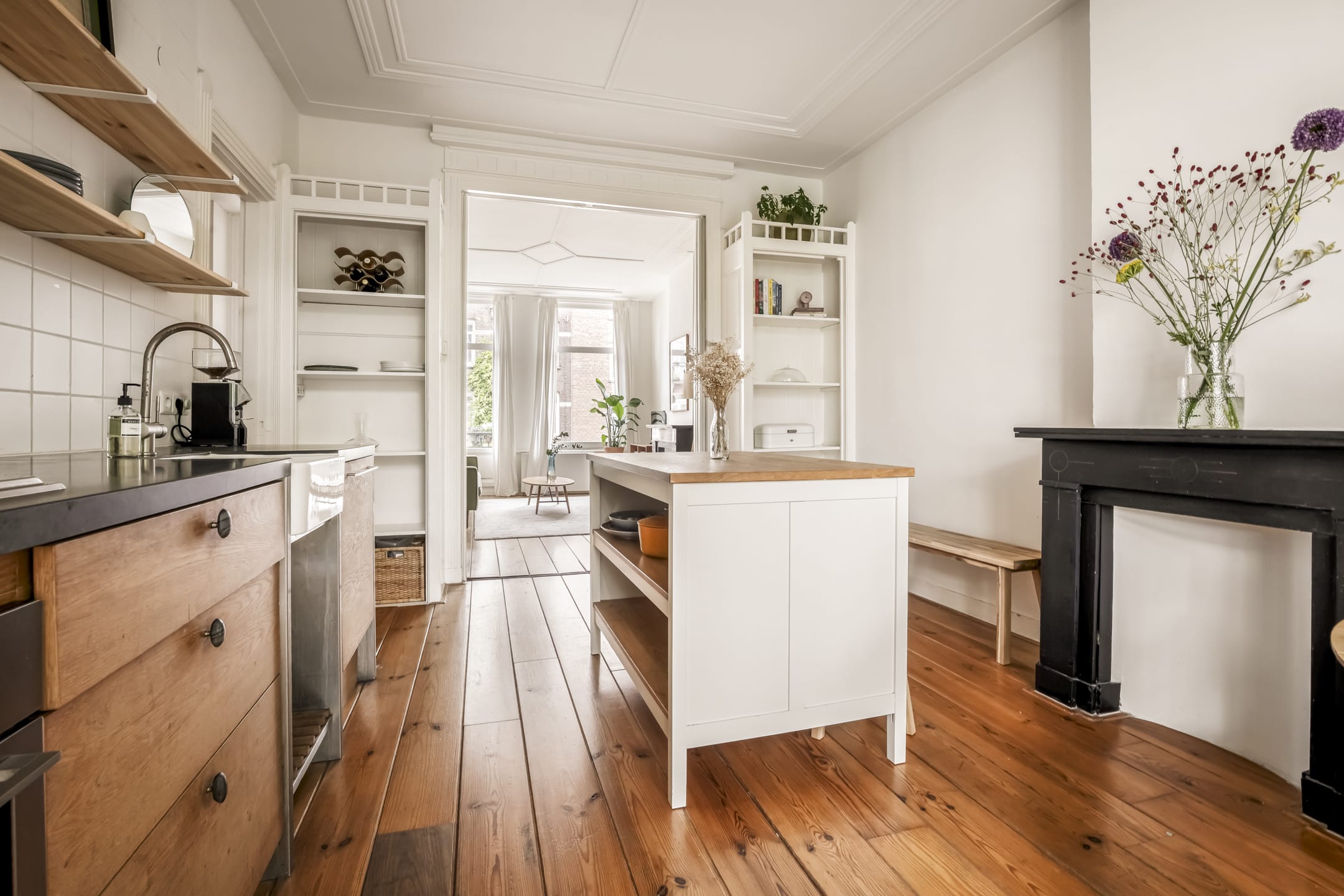 Via de gemeenschappelijke hal met brede trap, bereik je de woning op de eerste verdieping. De entree is ruim en zoals eerder vermeld, vormt dit gedeelte de centrale verbinding met alle vertrekken. Door het gebruik van de originele schuifdeuren is het woongedeelte verdeeld in een ruime woonkeuken en woonkamer. De knusse woonkeuken met de eerste schouw en openslaande deuren naar het balkon biedt voldoende ruimte voor een grote eettafel. De keuken zelf is voorzien van een massief composiet aanrechtblad, een vijfpits gasfornuis en diverse inbouwapparatuur. Het balkon strekt zich uit over de gehele breedte van de woning en heeft vrij uitzicht over de binnentuinen. De comfortabele en lichte woonkamer met wederom een originele schouw heeft een charmant Frans balkon met uitzicht op de straat. Zowel de woonkeuken als de woonkamer hebben een eigen toegangsdeur vanuit de centrale hal. Bovendien ligt er door de gehele woning een houten vloer en is zowel de voor als achterzijde volledig voorzien van dubbelglas.