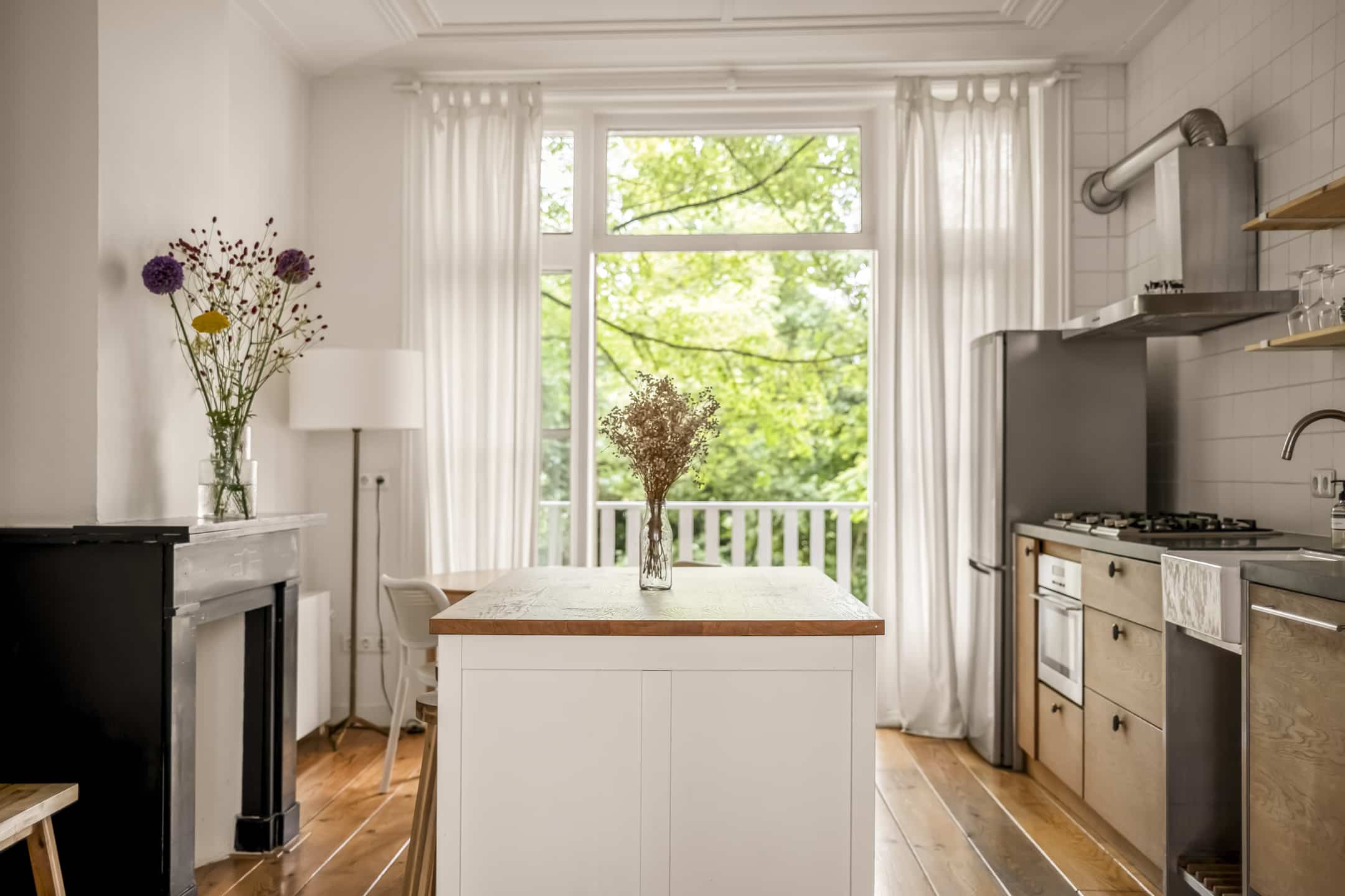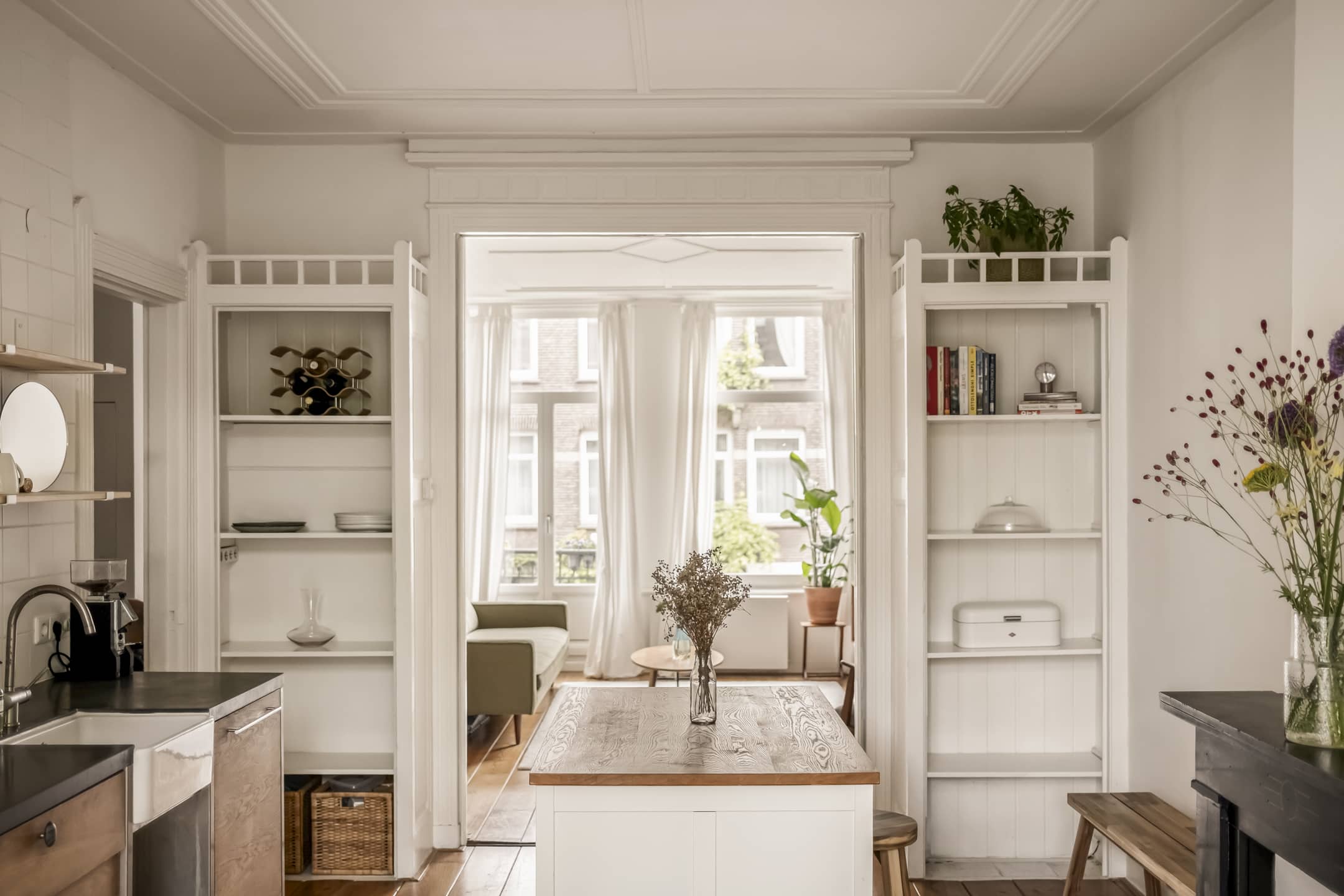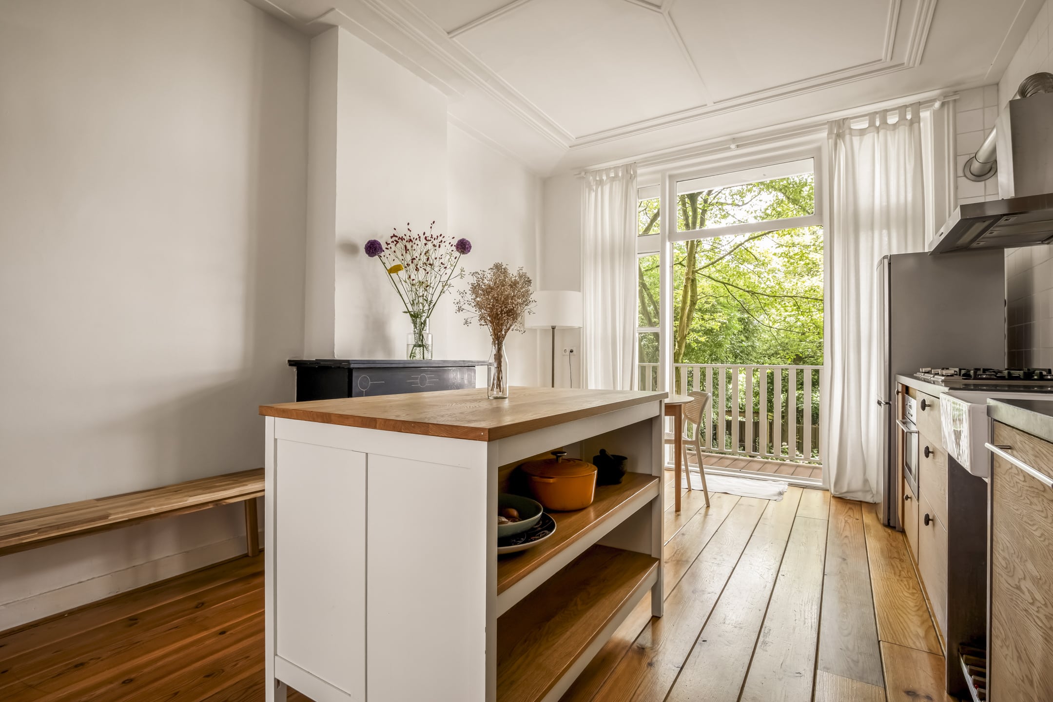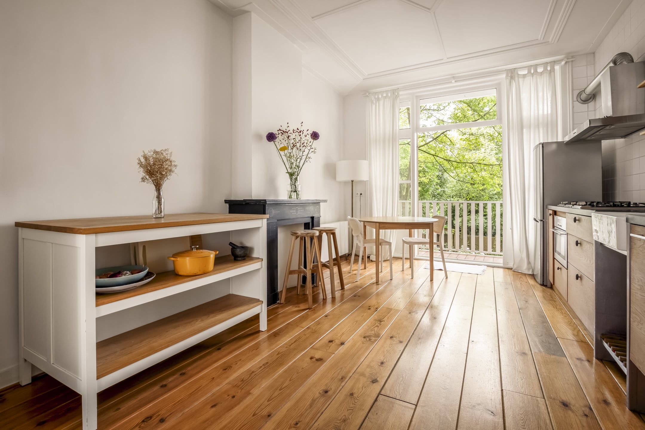 Via de gemeenschappelijke hal met brede trap, bereik je de woning op de eerste verdieping. De entree is ruim en zoals eerder vermeld, vormt dit gedeelte de centrale verbinding met alle vertrekken. Door het gebruik van de originele schuifdeuren is het woongedeelte verdeeld in een ruime woonkeuken en woonkamer. De knusse woonkeuken met de eerste schouw en openslaande deuren naar het balkon biedt voldoende ruimte voor een grote eettafel. De keuken zelf is voorzien van een massief composiet aanrechtblad, een vijfpits gasfornuis en diverse inbouwapparatuur. Het balkon strekt zich uit over de gehele breedte van de woning en heeft vrij uitzicht over de binnentuinen. De comfortabele en lichte woonkamer met wederom een originele schouw heeft een charmant Frans balkon met uitzicht op de straat. Zowel de woonkeuken als de woonkamer hebben een eigen toegangsdeur vanuit de centrale hal. Bovendien ligt er door de gehele woning een houten vloer en is zowel de voor als achterzijde volledig voorzien van dubbelglas.