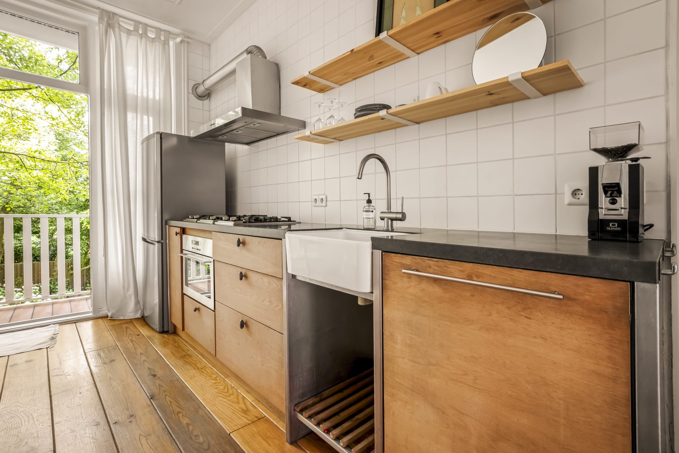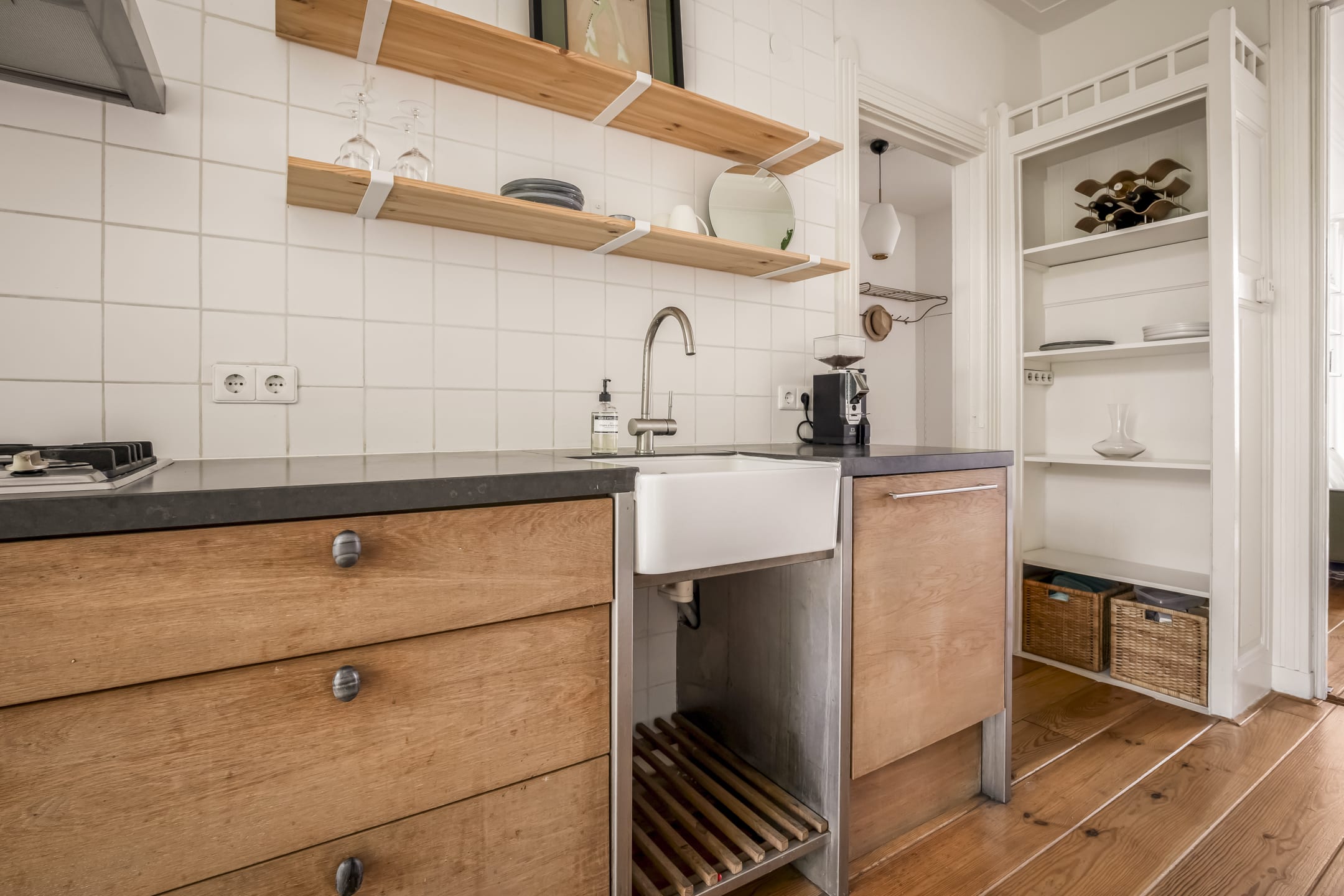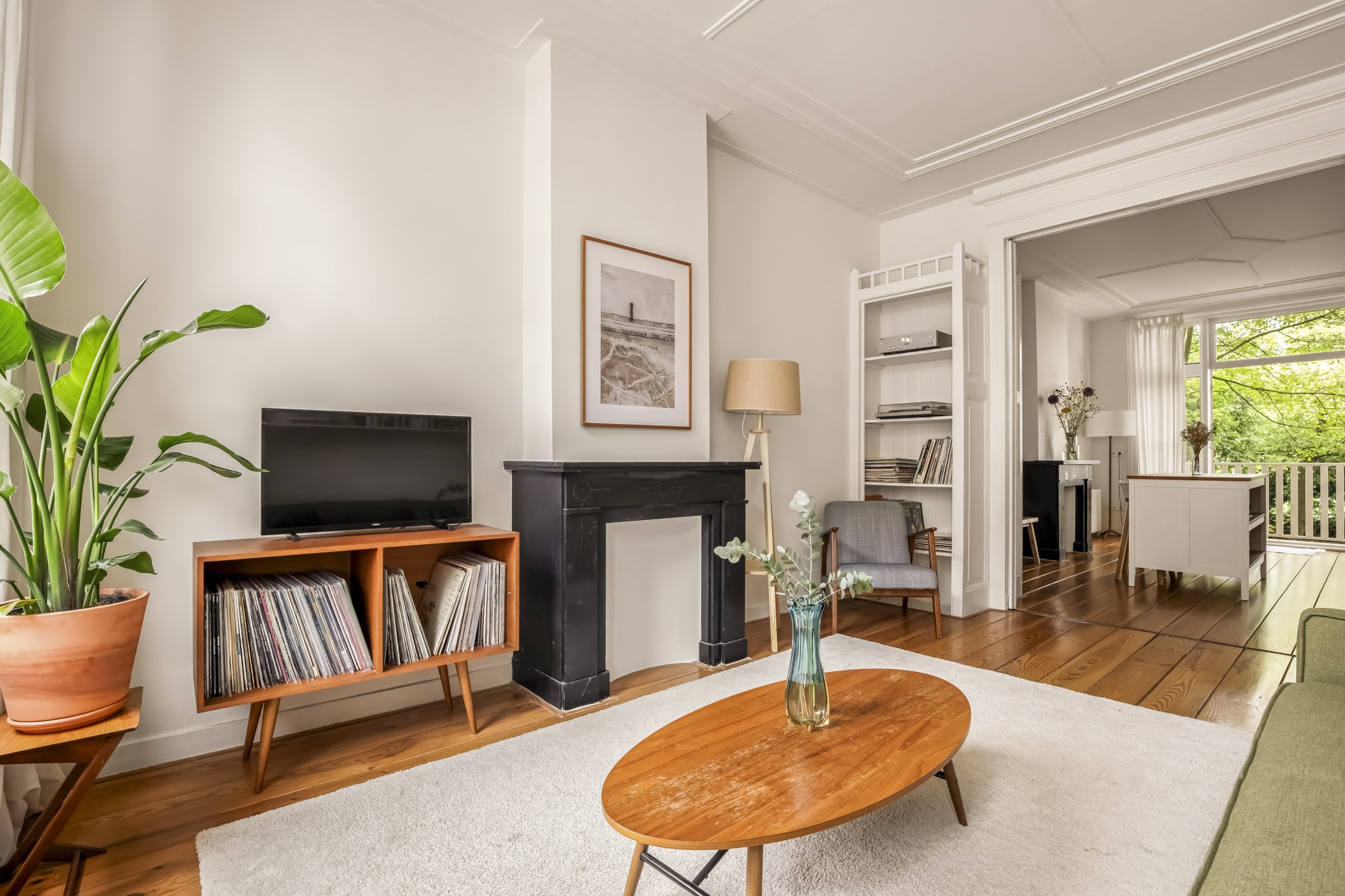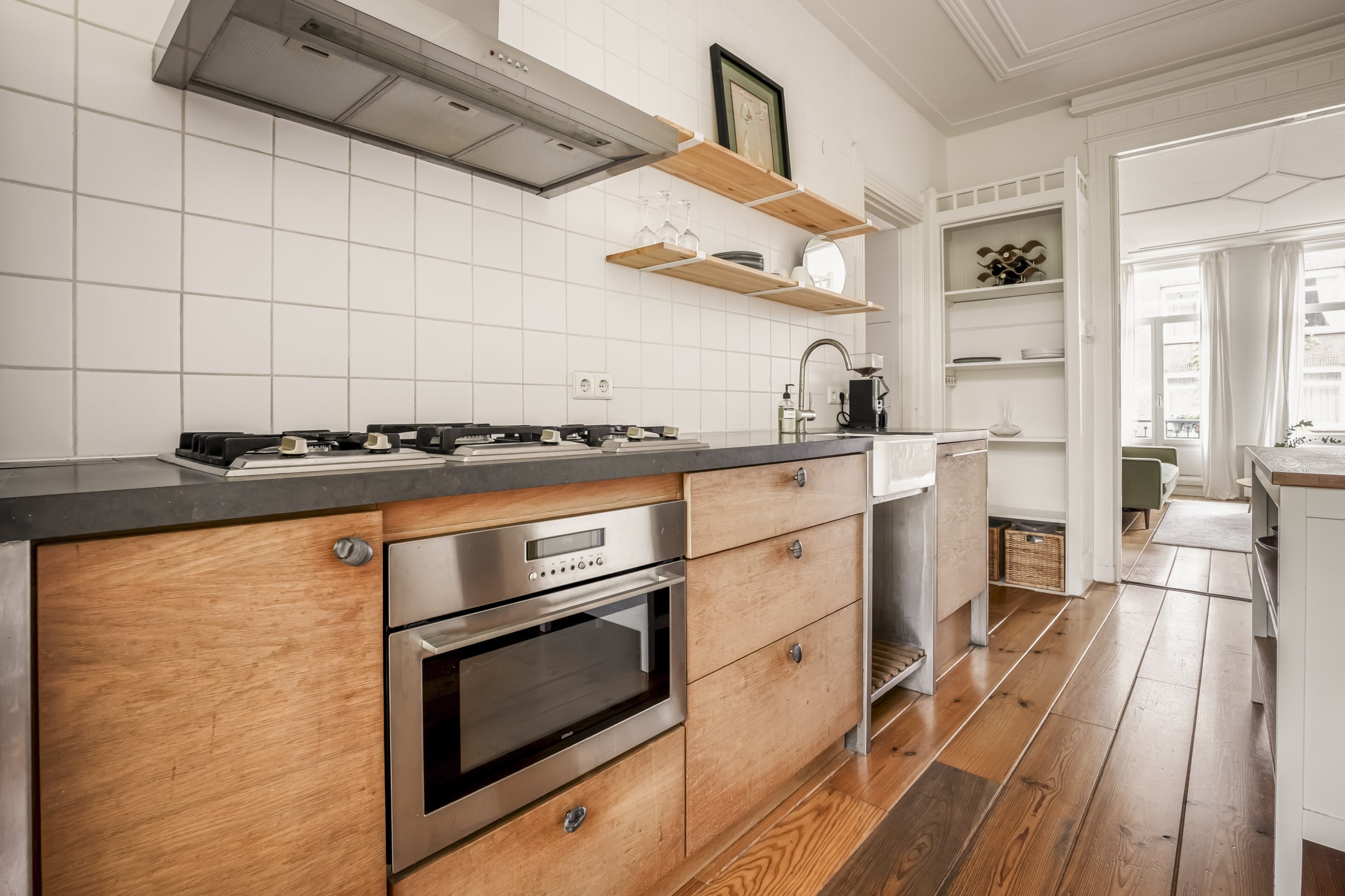 Via de gemeenschappelijke hal met brede trap, bereik je de woning op de eerste verdieping. De entree is ruim en zoals eerder vermeld, vormt dit gedeelte de centrale verbinding met alle vertrekken. Door het gebruik van de originele schuifdeuren is het woongedeelte verdeeld in een ruime woonkeuken en woonkamer. De knusse woonkeuken met de eerste schouw en openslaande deuren naar het balkon biedt voldoende ruimte voor een grote eettafel. De keuken zelf is voorzien van een massief composiet aanrechtblad, een vijfpits gasfornuis en diverse inbouwapparatuur. Het balkon strekt zich uit over de gehele breedte van de woning en heeft vrij uitzicht over de binnentuinen. De comfortabele en lichte woonkamer met wederom een originele schouw heeft een charmant Frans balkon met uitzicht op de straat. Zowel de woonkeuken als de woonkamer hebben een eigen toegangsdeur vanuit de centrale hal. Bovendien ligt er door de gehele woning een houten vloer en is zowel de voor als achterzijde volledig voorzien van dubbelglas.