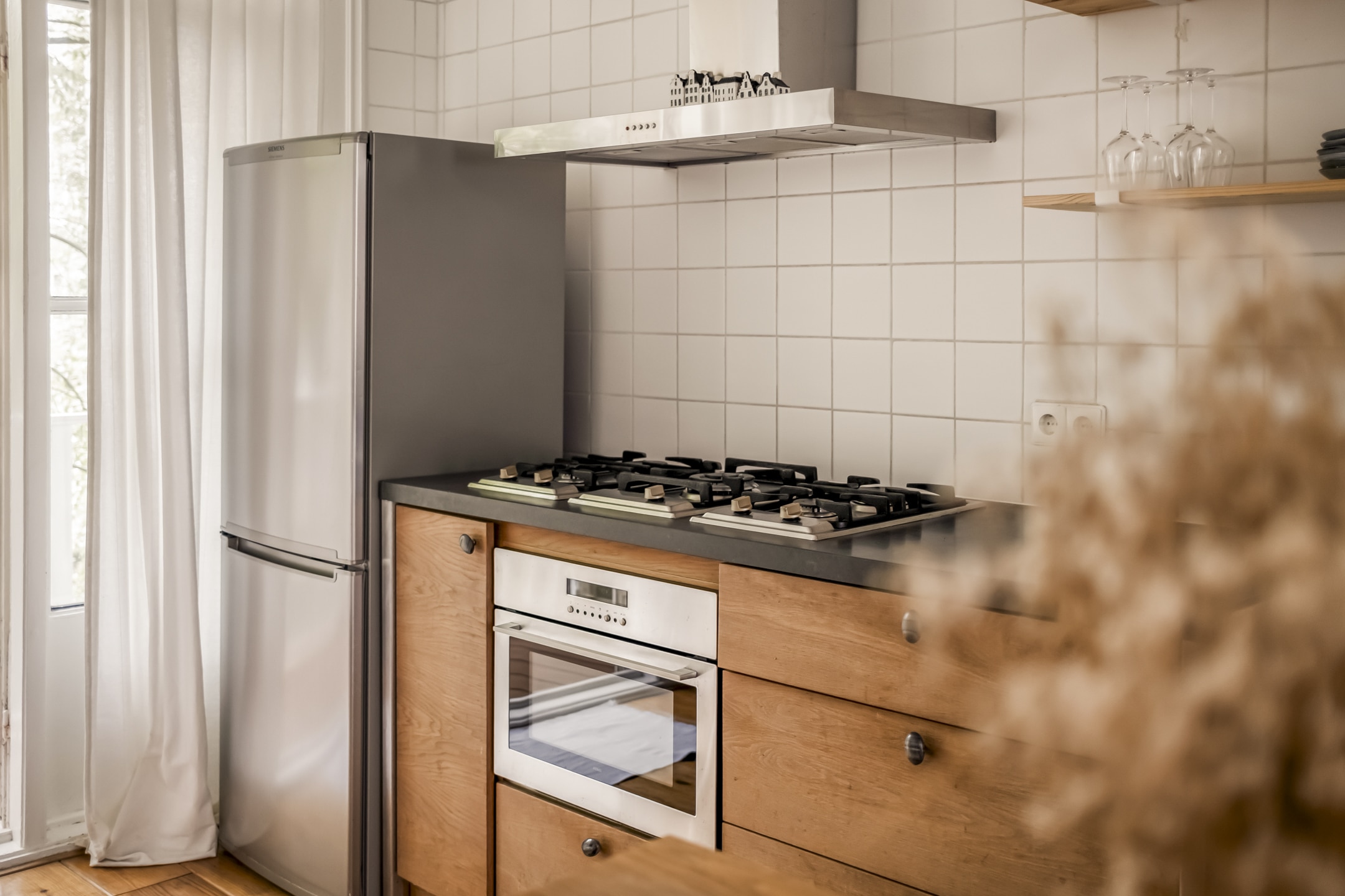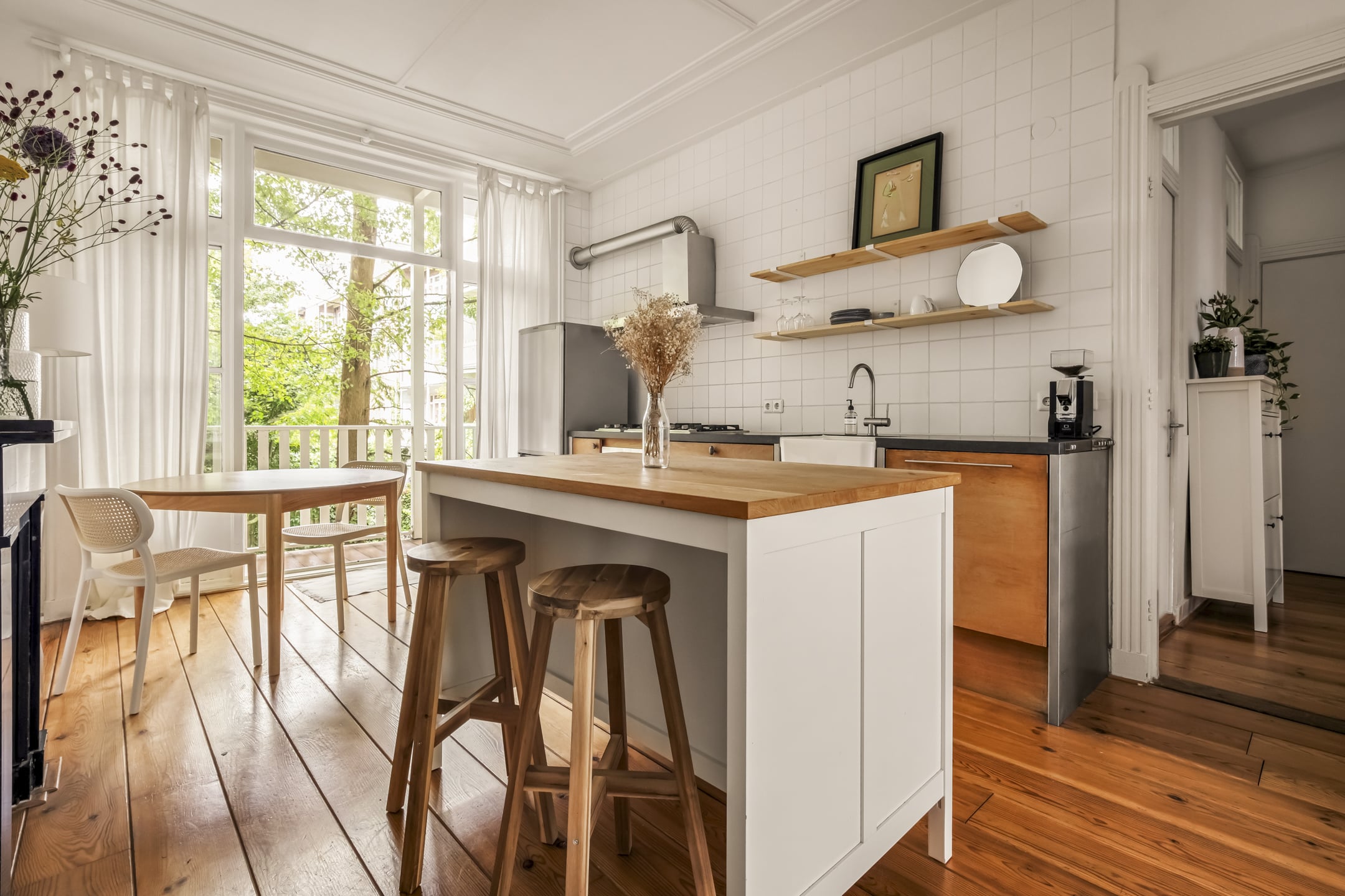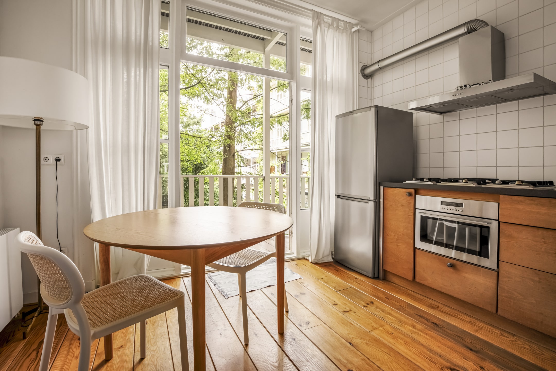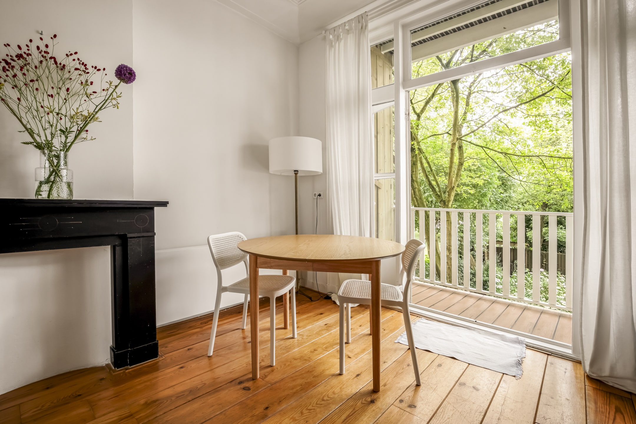 Via de gemeenschappelijke hal met brede trap, bereik je de woning op de eerste verdieping. De entree is ruim en zoals eerder vermeld, vormt dit gedeelte de centrale verbinding met alle vertrekken. Door het gebruik van de originele schuifdeuren is het woongedeelte verdeeld in een ruime woonkeuken en woonkamer. De knusse woonkeuken met de eerste schouw en openslaande deuren naar het balkon biedt voldoende ruimte voor een grote eettafel. De keuken zelf is voorzien van een massief composiet aanrechtblad, een vijfpits gasfornuis en diverse inbouwapparatuur. Het balkon strekt zich uit over de gehele breedte van de woning en heeft vrij uitzicht over de binnentuinen. De comfortabele en lichte woonkamer met wederom een originele schouw heeft een charmant Frans balkon met uitzicht op de straat. Zowel de woonkeuken als de woonkamer hebben een eigen toegangsdeur vanuit de centrale hal. Bovendien ligt er door de gehele woning een houten vloer en is zowel de voor als achterzijde volledig voorzien van dubbelglas.