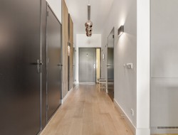 De keuken met royaal eiland (3,6 m²) en diverse Bosch inbouwapparatuur vormt het middelpunt van de woning. Alle apparaten zijn in de muur geplaatst met stijlvolle donkergrijze kasten die in de muur zijn verzonken. Door het gehele appartement ligt er massief eikenhout lamelparket, daarnaast zijn de badkamers en toilet betegeld met fraaie keramische marmeren tegels. Bij de tweede en tevens grootste badkamer heeft men een luxe hotel look gecreëerd, de chique betegeling en zwart matte kranen maken het plaatje compeet!